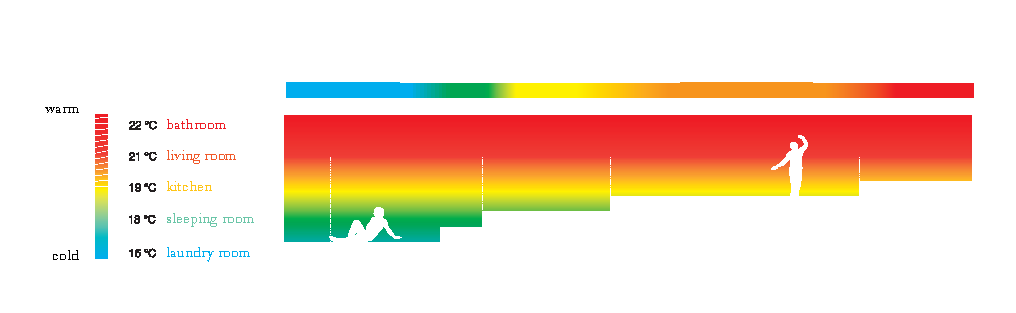 在設計一棟房子時,根據對流的冷暖空氣分佈,把浴室設於靠近暖空氣的上層,把寢室安排在靠近地面的冷空氣下沉區域,這就是藉由調節建築溫度來緩和全球變暖的方法。在安排每個房間的用處之前先繪製相關的高度、氣溫圖,並在樓層間、廳室間的地板或牆壁設計通風孔,使得房屋內能形成自然的空氣對流。