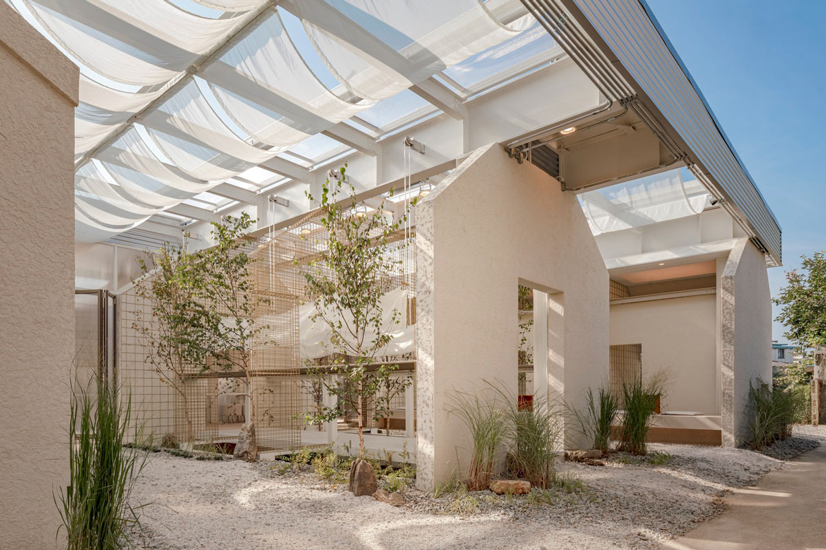 設計者透過細膩的手法重新詮釋了都市中的自然空間,在舊有的建築牆柱之間,加入了鋼構予以補強,並且利用輕柔的白色帆布與開放的屋頂框架,交織成一個光影流動的庇護所,為城市生活注入一絲清新。整個空間除了是物理意義上的更新,更是探索如何將自然融入都市生活的深思,這片曾暗無天日的工業生產環境,轉變為全州市一處綠色庇護所,讓城市心臟地帶重新擁抱自然,為居民提供逃離都市喧嘩的空間。