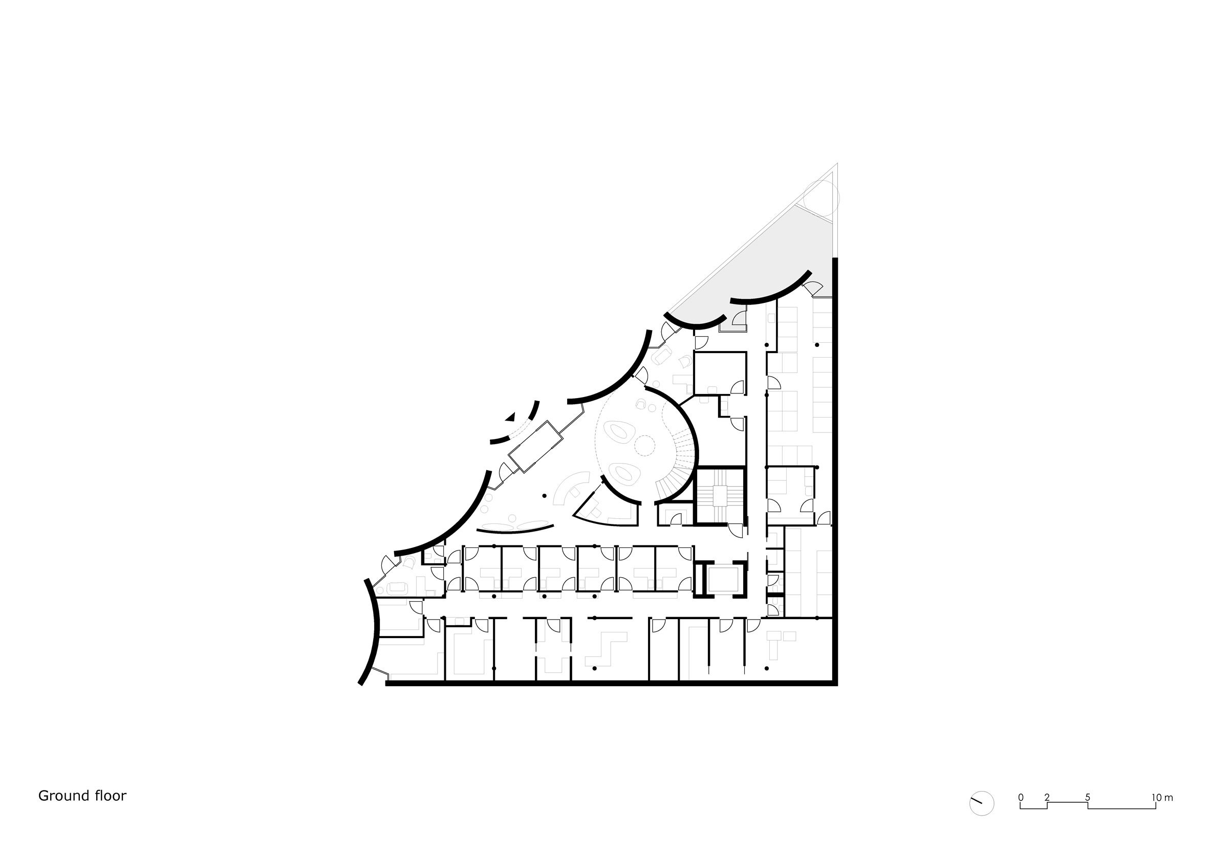 建築外部那看似恣意流淌的線條,與內部地面層L形佈局、講求邏輯效率的診療室、辦公室形成強烈對比,卻又構成一種奇妙的平衡。這種手法創造出一種開放且自由的氛圍,讓建築本身成為一種無聲的安慰,使生命尊嚴在空間吐納之間,獲得細膩的尊重。