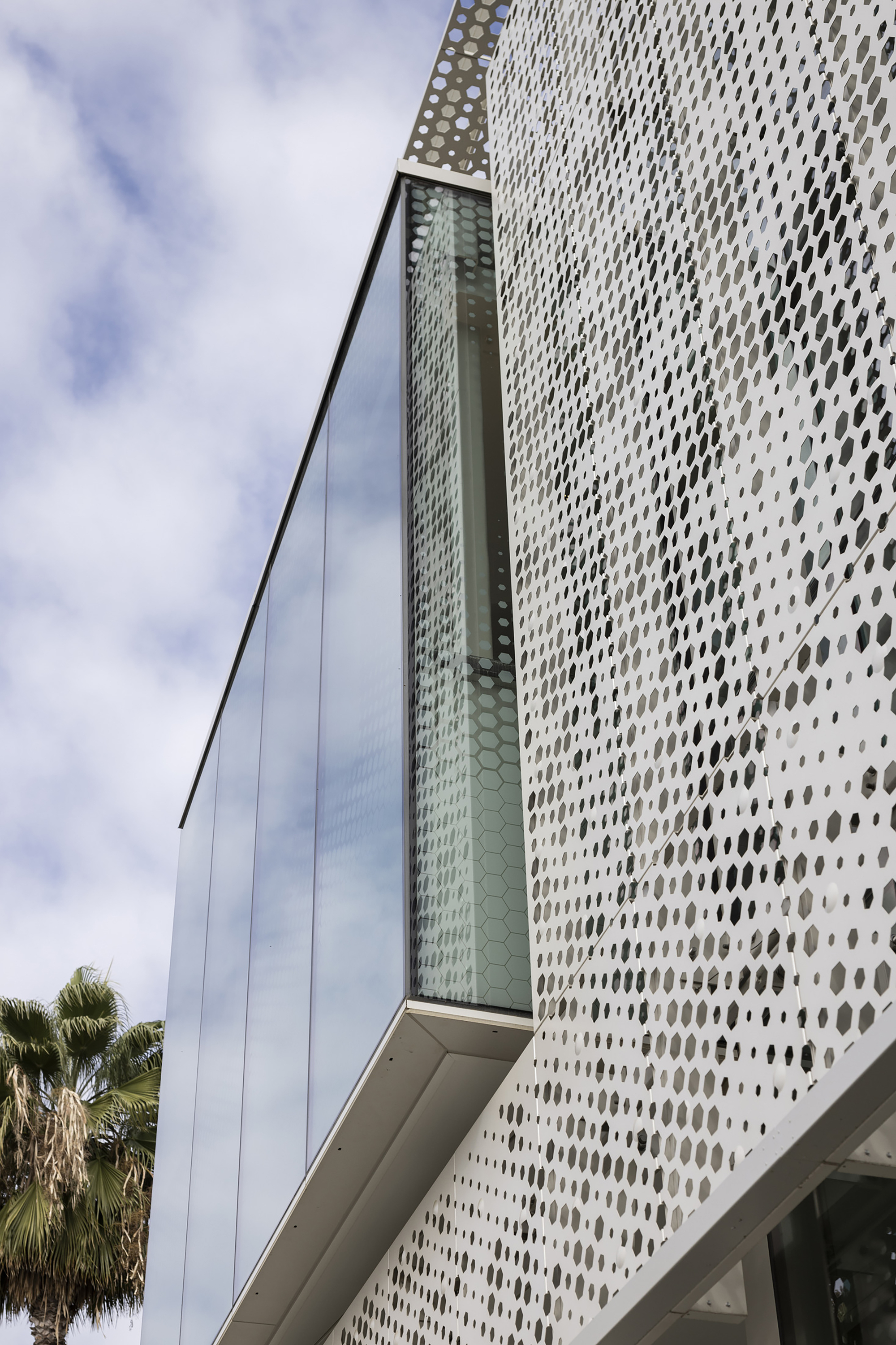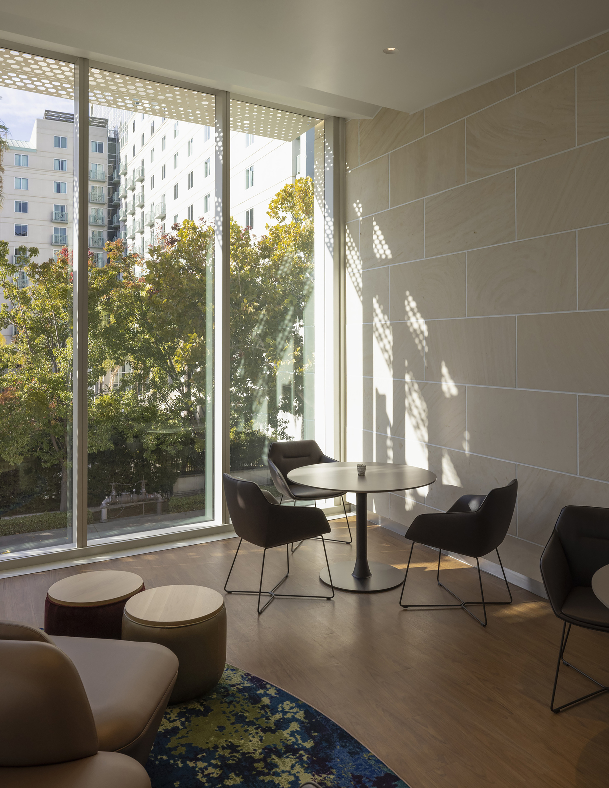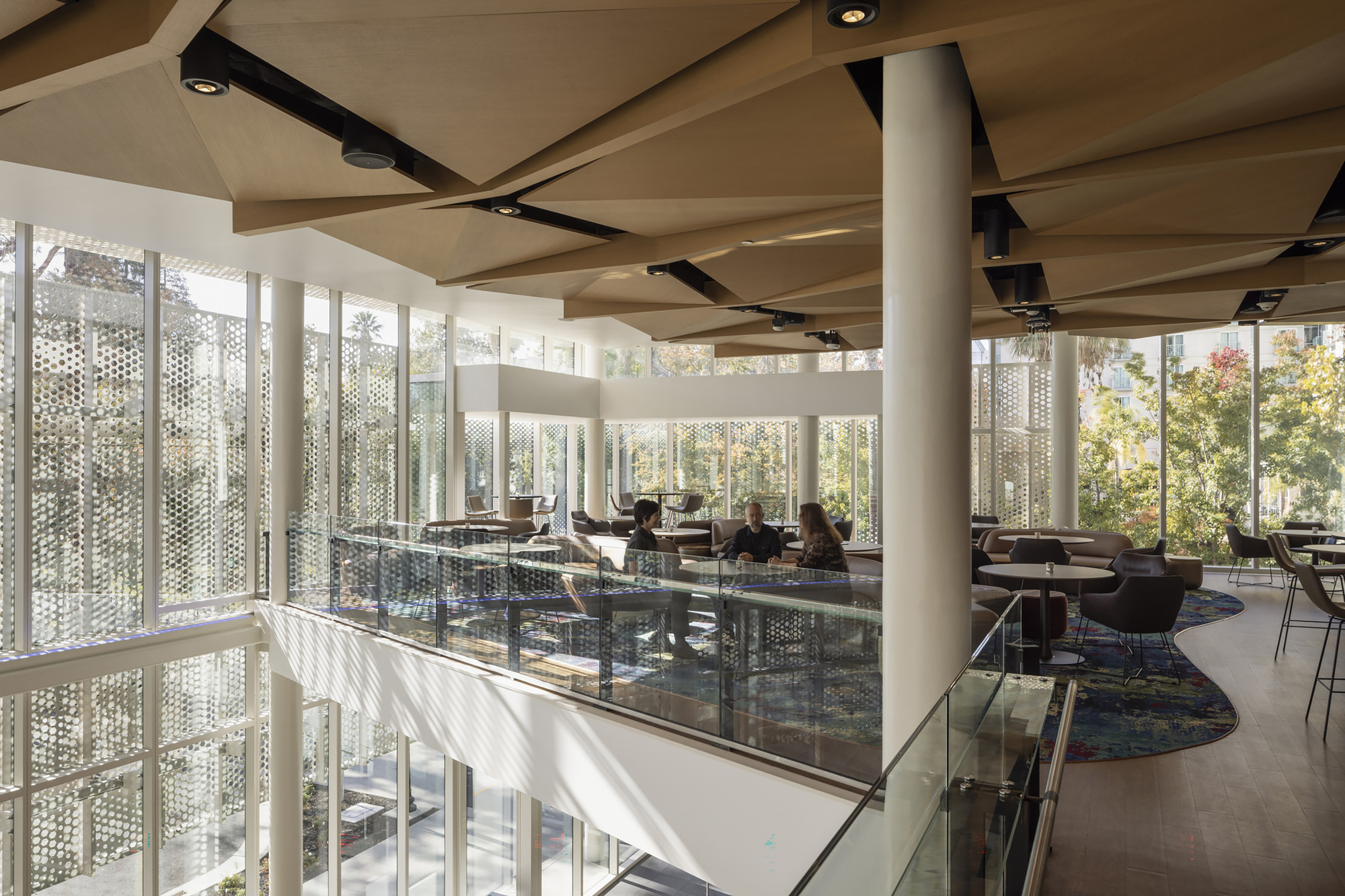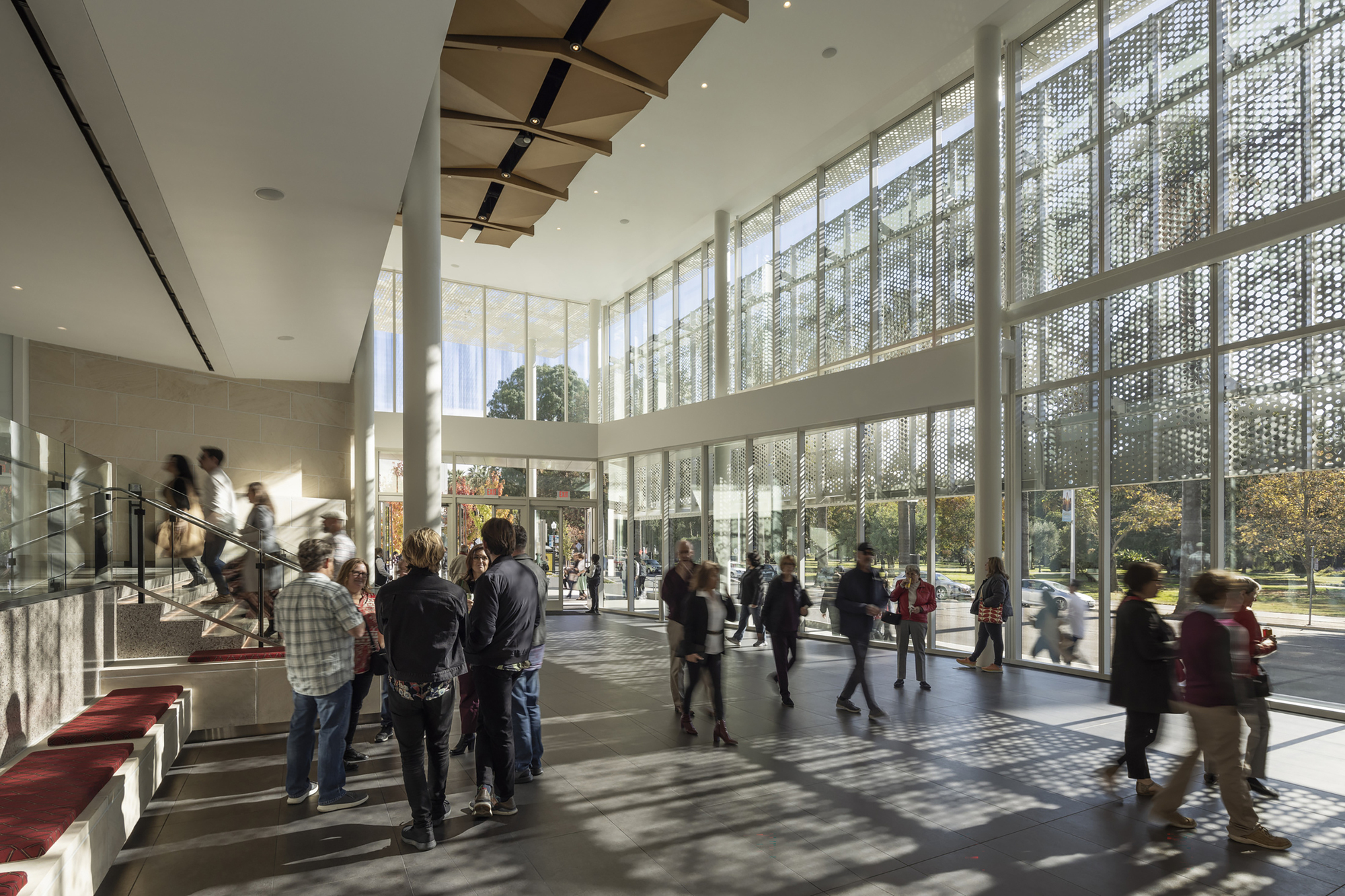新建築外觀捨棄了過去不透明的混凝土,改採高度透明的材料面板,營造出親切的門戶感。環繞南部正式門廳的帷幕,是一層輕盈的蕾絲狀紗網,篩落的光影,呼應了Sacramento聞名遐邇的樹木文化。這層紗網還向北延伸,形成半戶外空間,可舉辦電影之夜、社區集會,宛如公共客廳。光影斑駁的偽天篷效果,不只減少熱能與眩光,同時最大化自然採光與視野。此策略成功將立面上的材料對比,轉化為與城市綠意連通的對話介面。