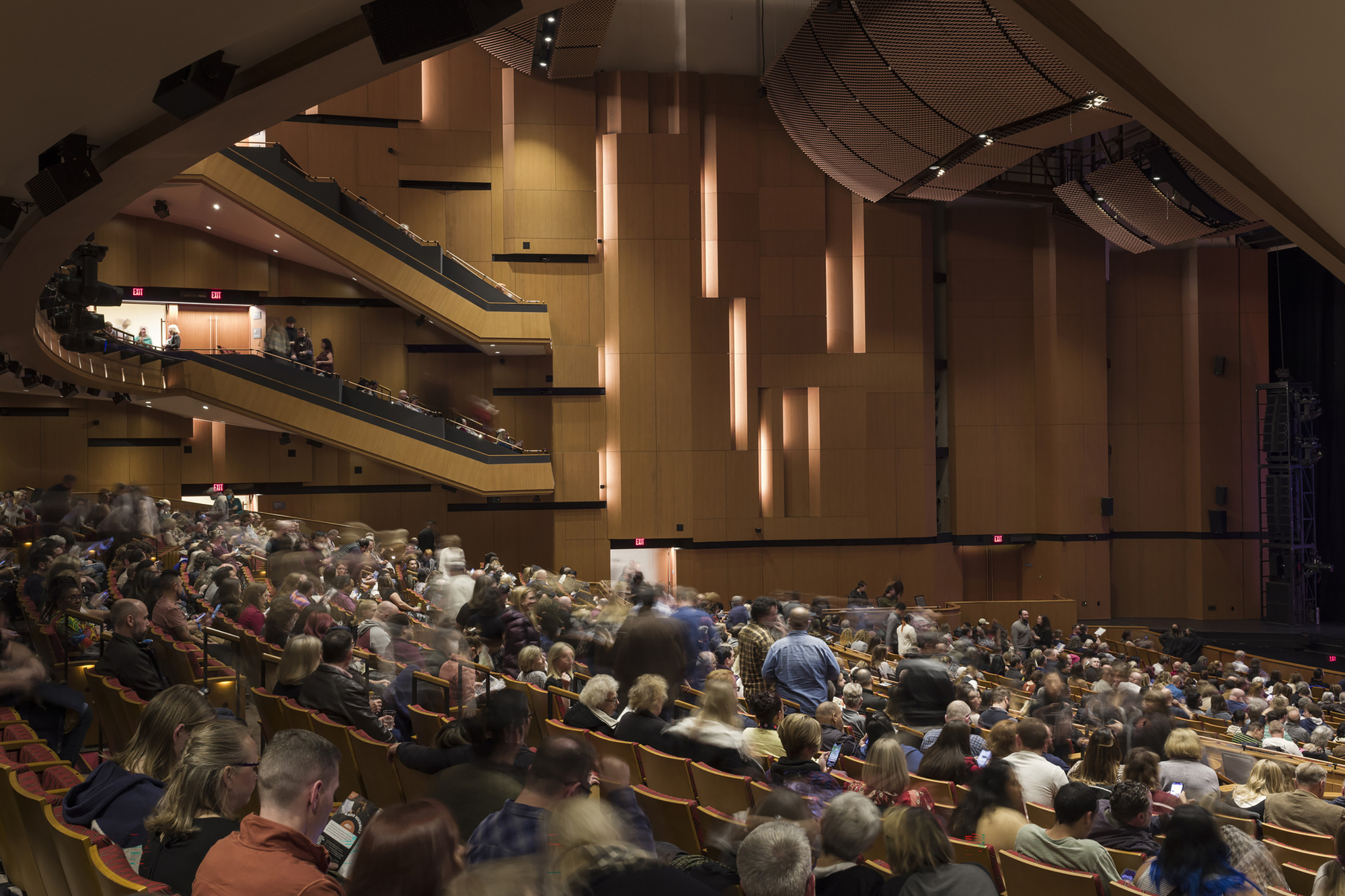 核心的改造在於觀眾席與樂池。建築團隊安裝了加州規模最大的「電子聲學強化系統」 (electro-acoustic enhancement system),將原本聲學品質不佳、視覺混亂的空間,徹底轉變為具備優異聲學環境的頂級場域。這套系統能即時調整音場的殘響與混響時間,確保無論是交響樂或戲劇演出,都能獲得量身訂做的聽覺體驗。同時,此次改造也真正實現了視線與聽覺體驗的通用設計 (universal access),讓所有觀眾都能平等享受藝術,提升公共藝術場所的包容性。這項高科技的導入,徹底解決了困擾舊建築已久的聲學難題。