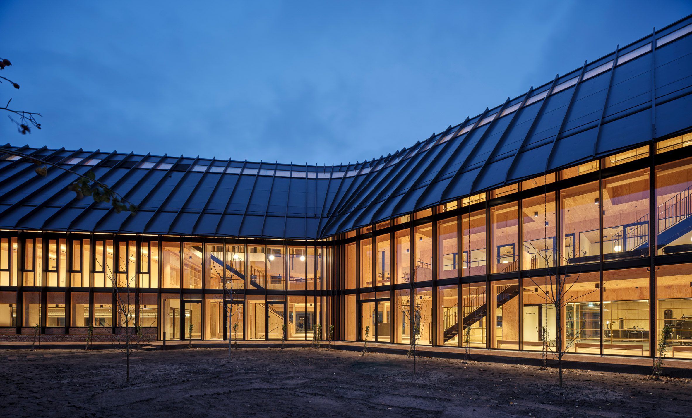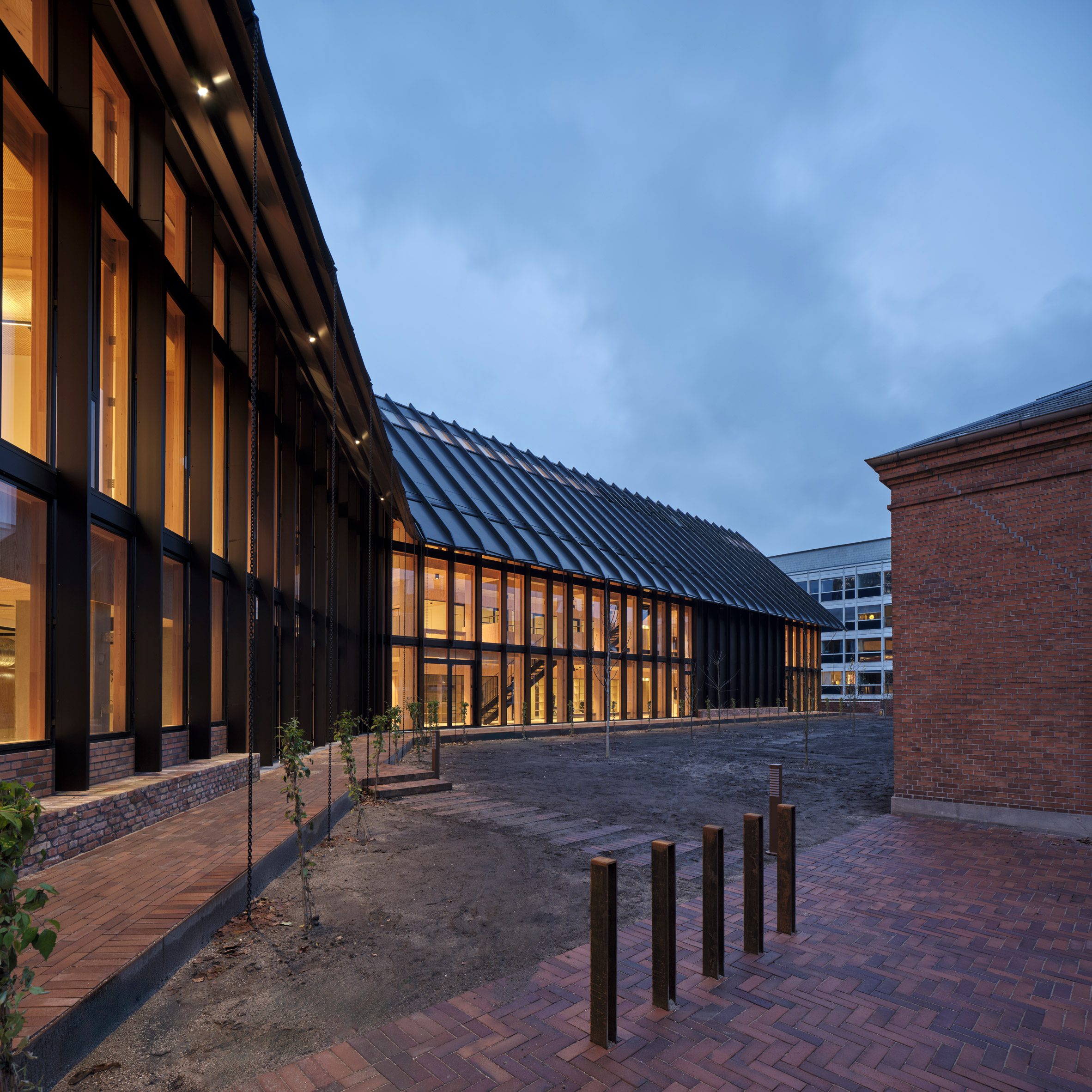 此棟健康中心的建築外觀,呈現一道優雅的弧線,蜿蜒的姿態巧妙地面向一片蒼翠的城市花園,並透過大面積的落地玻璃幕牆,將室外綠意引進室內,極大化了使用者與自然的連結。其斜屋頂的設計,是對周邊老建築常見的山牆和馬鞍形屋頂進行了一次心領神會的當代轉譯,使新建築能謙遜地融入既有的都市紋理之中。這種尊重文脈的設計手法,使得整棟建築物宛如從土地中自然生長出來一般,既有現代建築的俐落,亦飽含對歷史的溫情,兩者相得益彰,構成一幅動人的都市風景。