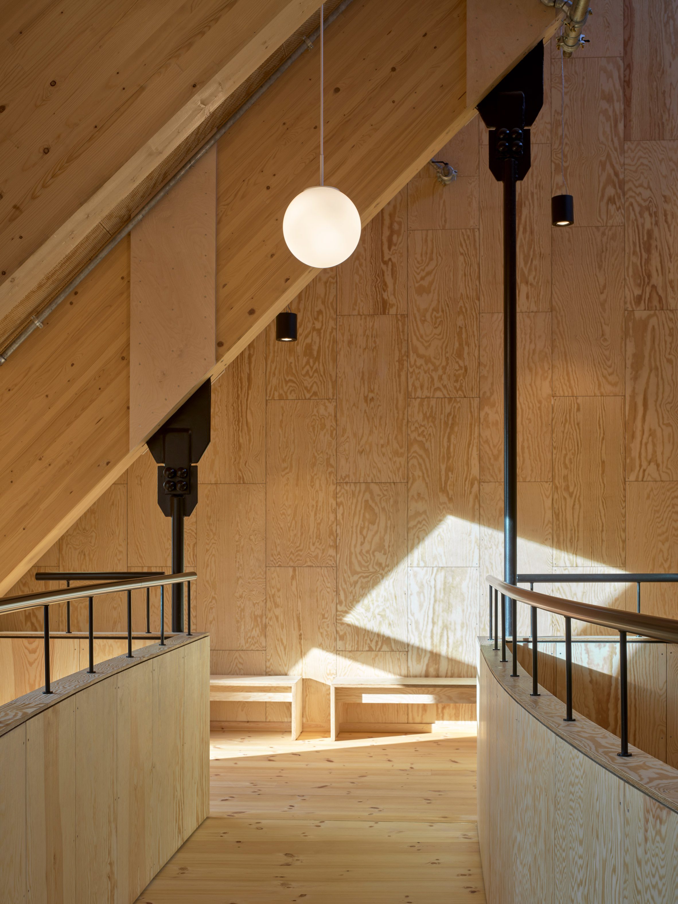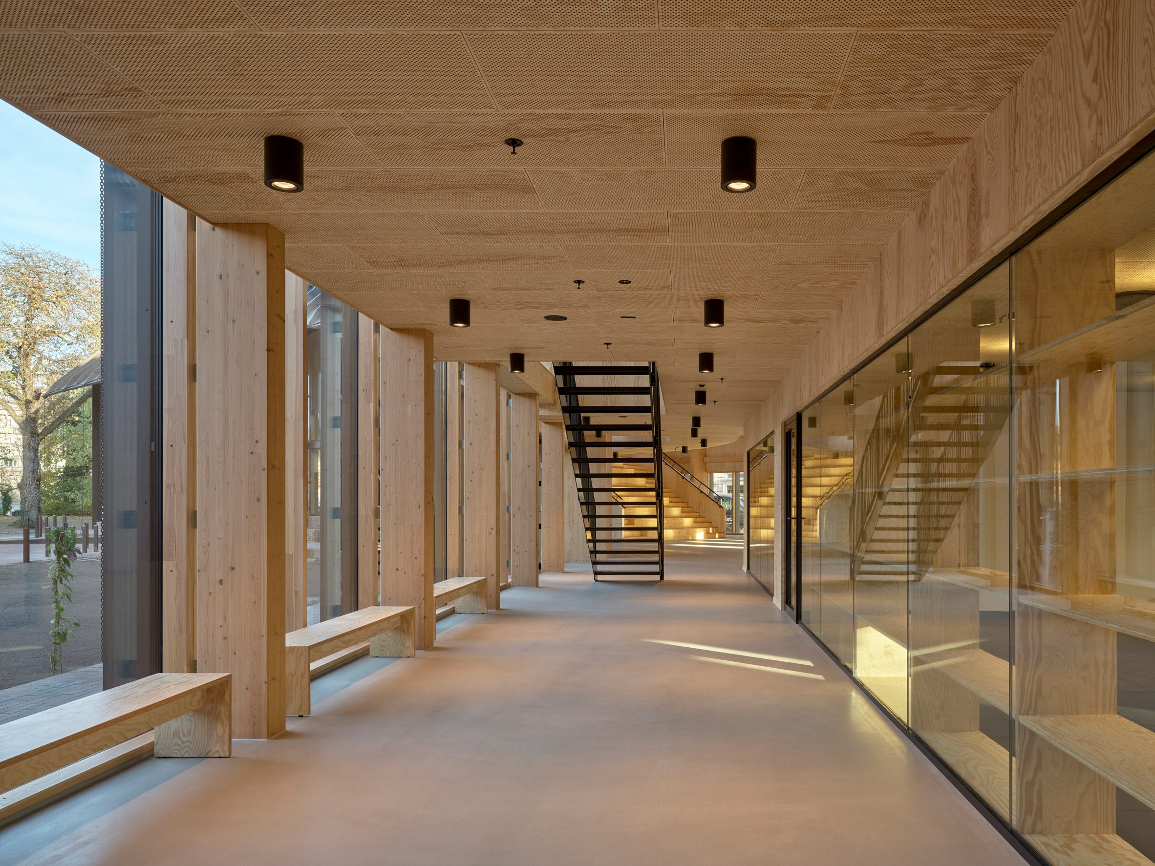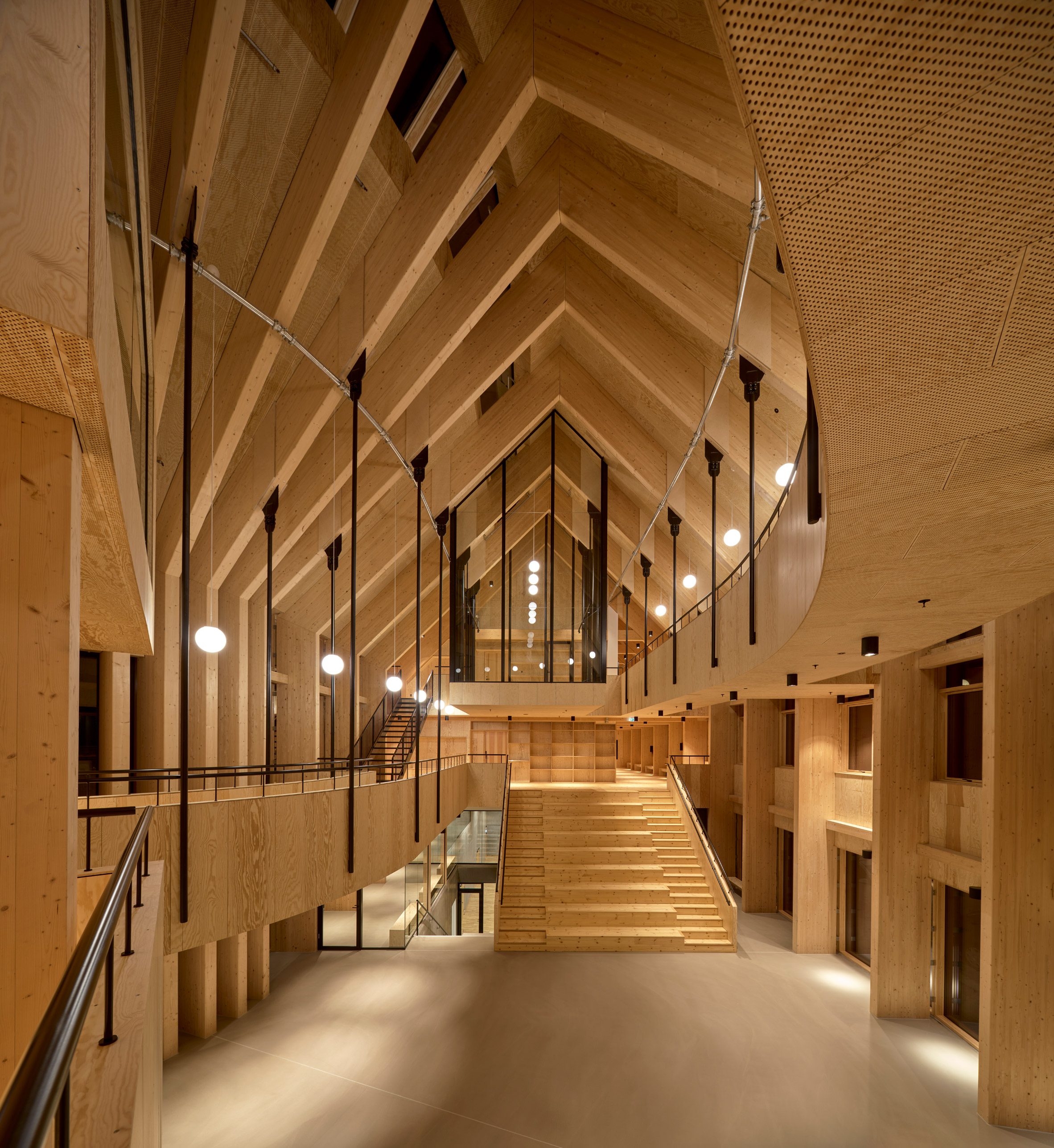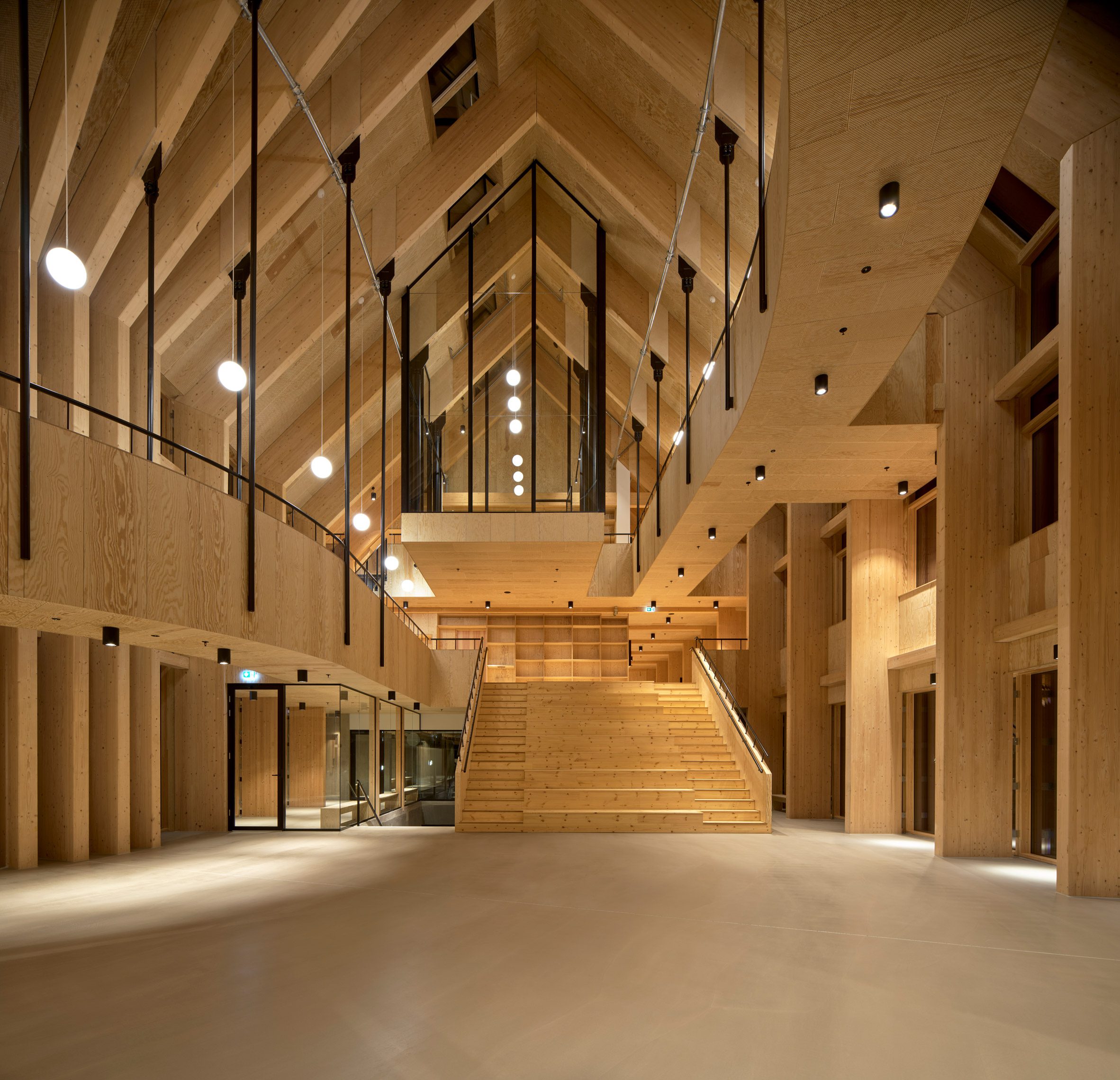 在可持續發展方面,本案亦是可圈可點的典範。屋頂上鋪設了廣達一百六十四平方公尺的太陽能電池板陣列,為建築物的日常運營提供源源不絕的潔淨電力。結構上,設計團隊選用了由松木製成的膠合樑(Glued-laminated timber, glulam),這種工程木材不僅強度高、可塑性強,且是可再生資源,在生產過程中能有效固碳。室內則大量使用松木膠合板,製成吸音板、牆面飾板、層架乃至長凳,與立面的棕色陽極氧化鋁板形成鮮明對比。木材的廣泛應用,不僅是為了視覺上的溫暖,更是對環境永續的鄭重承諾。