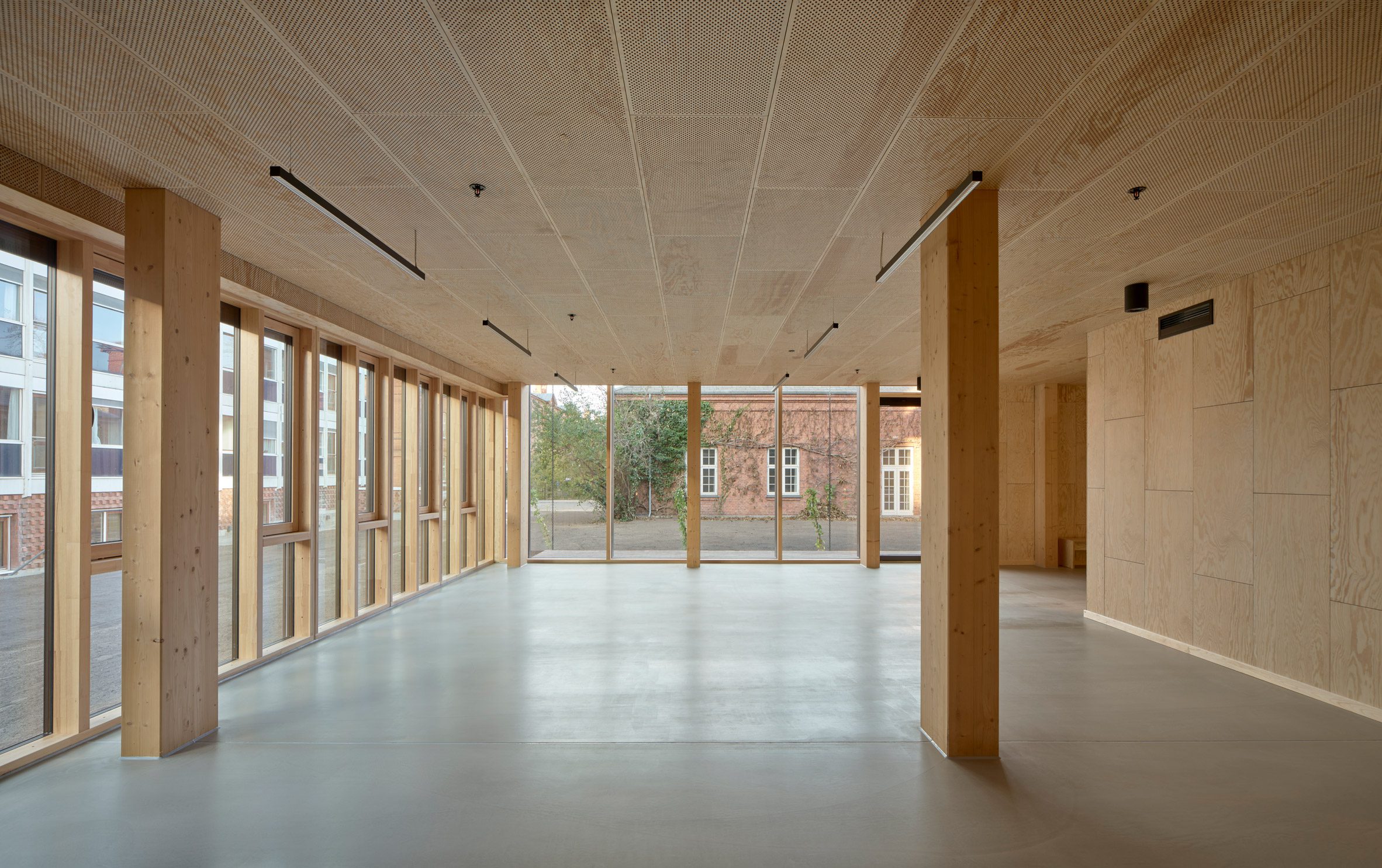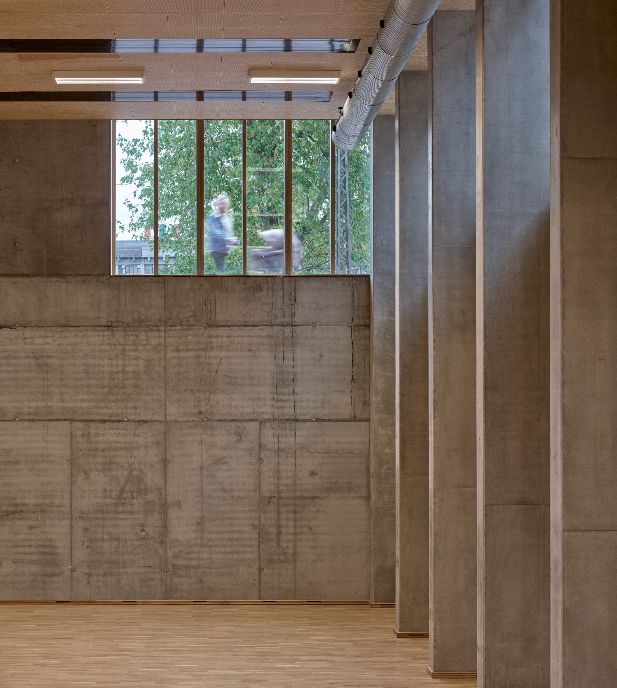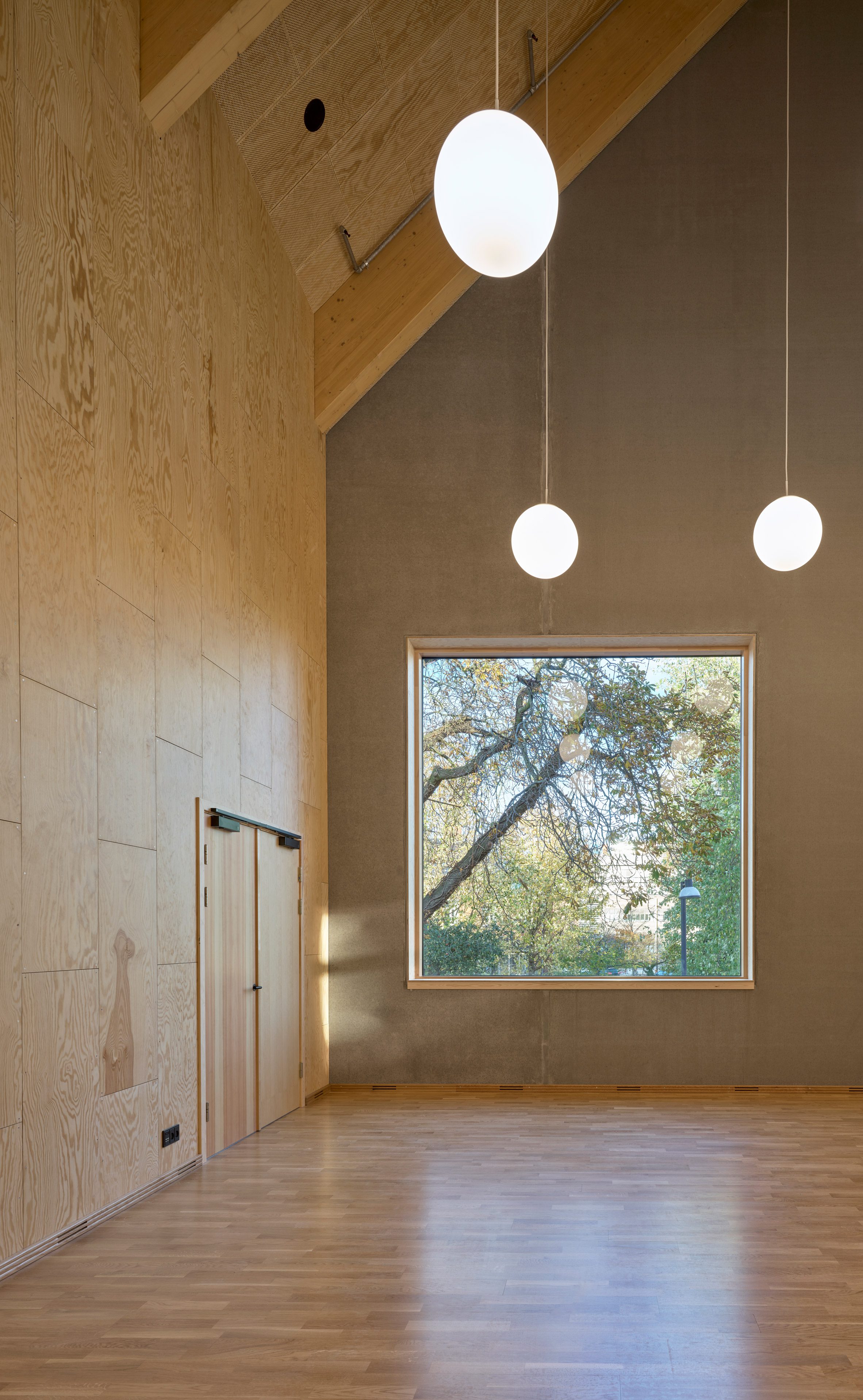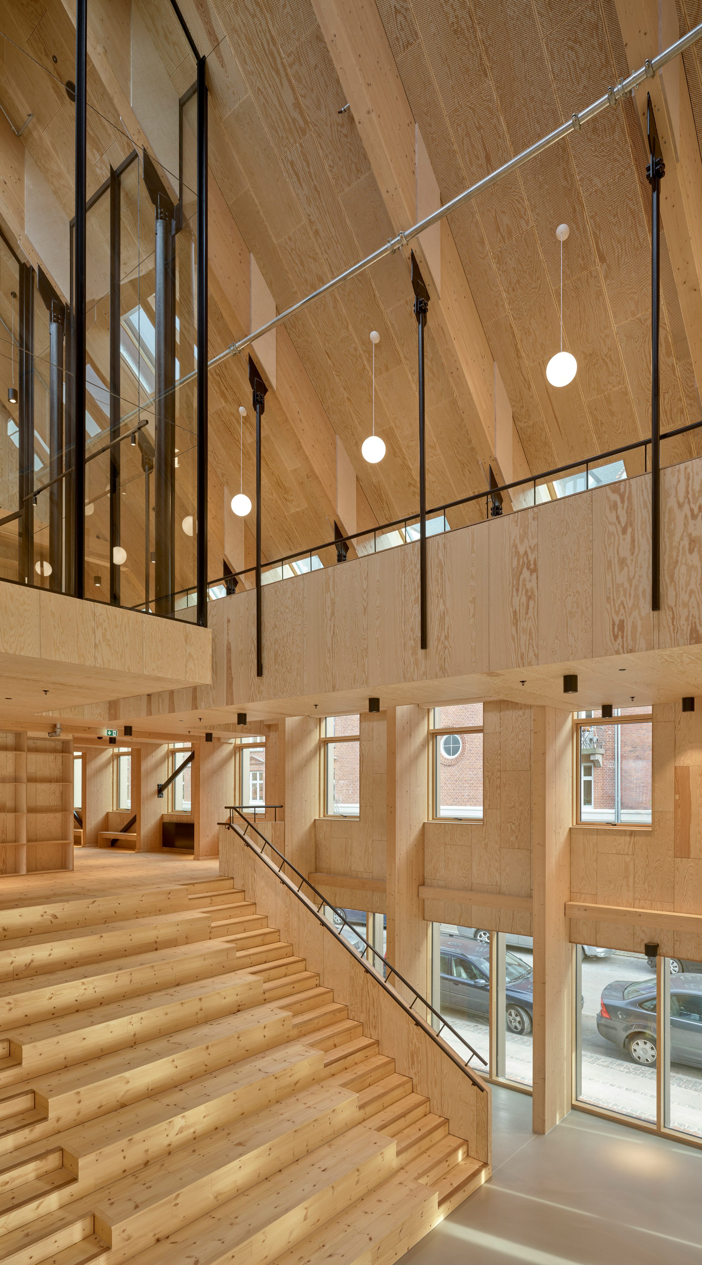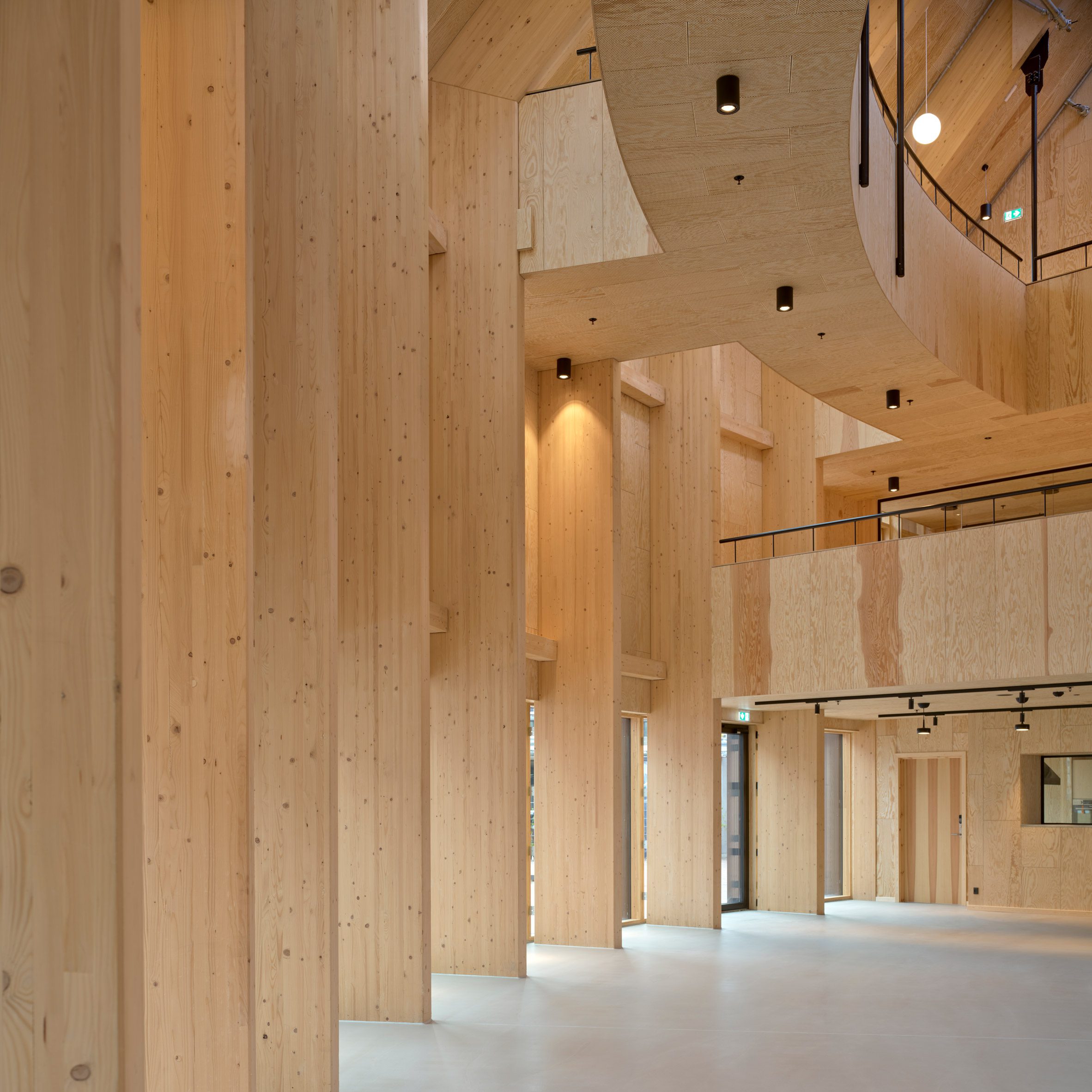 在可持續發展方面,本案亦是可圈可點的典範。屋頂上鋪設了廣達一百六十四平方公尺的太陽能電池板陣列,為建築物的日常運營提供源源不絕的潔淨電力。結構上,設計團隊選用了由松木製成的膠合樑(Glued-laminated timber, glulam),這種工程木材不僅強度高、可塑性強,且是可再生資源,在生產過程中能有效固碳。室內則大量使用松木膠合板,製成吸音板、牆面飾板、層架乃至長凳,與立面的棕色陽極氧化鋁板形成鮮明對比。木材的廣泛應用,不僅是為了視覺上的溫暖,更是對環境永續的鄭重承諾。