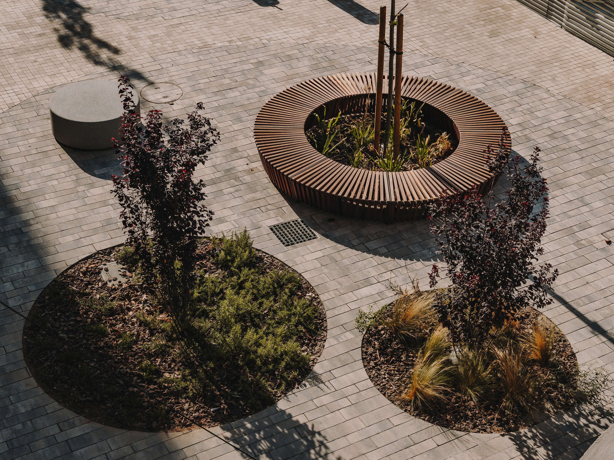 為了讓行人能夠舒適地「停留」,設計團隊在這條嶄新的步行街道上,精準地置入了三座由堅固混凝土打造的棚架,上方覆蓋著低維護成本的綠屋頂,為下方空間提供了絕佳的庇護。座椅系統的設計更是別具巧思,旨在滿足各種不同的都市空間使用需求。環繞著花台的圓形長椅,讓候車的乘客無論在一天中的哪個時段,都能輕鬆躲避地中海強烈的日照,享受棚架帶來的清涼遮蔽。線條簡潔的長條形座椅,則明確劃分了停留區與通行區的空間界線;而散落其間的小巧圓柱形座椅,則為整個場域注入了一絲俏皮的活潑氣息,無形中拉近了人與人之間的距離,促進了自然的社交互動。