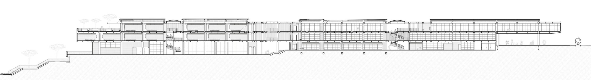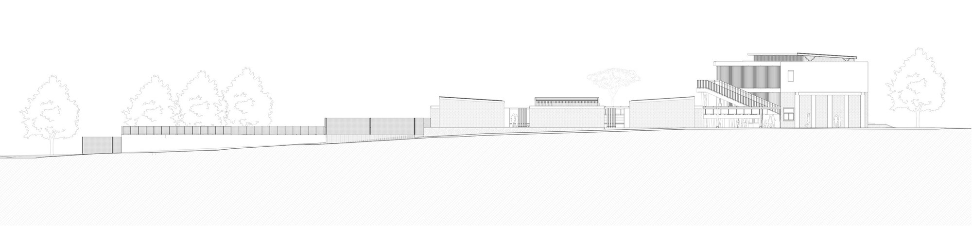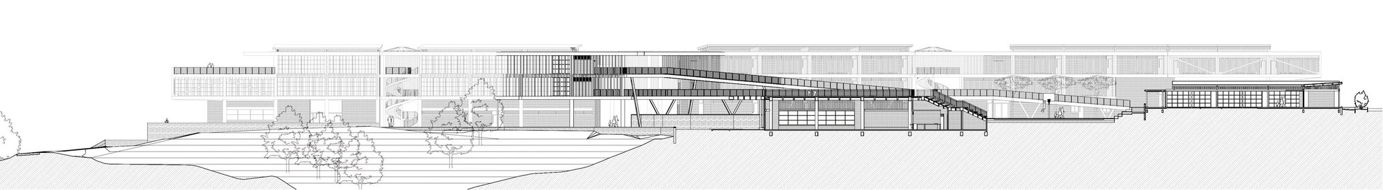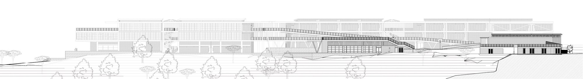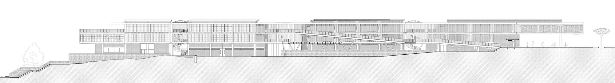 受限於零碎腹地,3層樓高的主體構造橫向貫穿東西兩端。教室精準座落於南北座向,學子能遠眺市中心繁華天際線,亦可近觀都會邊界的自然起伏。巨大主量體宛如堅實盾牌,溫柔守護內部免受外界喧囂干擾。受保護的腹地內,散落數處獨立區塊,涵蓋大禮堂、運動場、主庭院及環繞專屬天井的附設幼兒園。各樓層仰賴戶外坡道與橋樑串接至禮堂屋頂,同時化作開闊的首要集會廣場。立體化的動線交織出充滿活力的校園網絡,讓人在層層遞進間,輕易看出整體空間配置的豐富層次感。