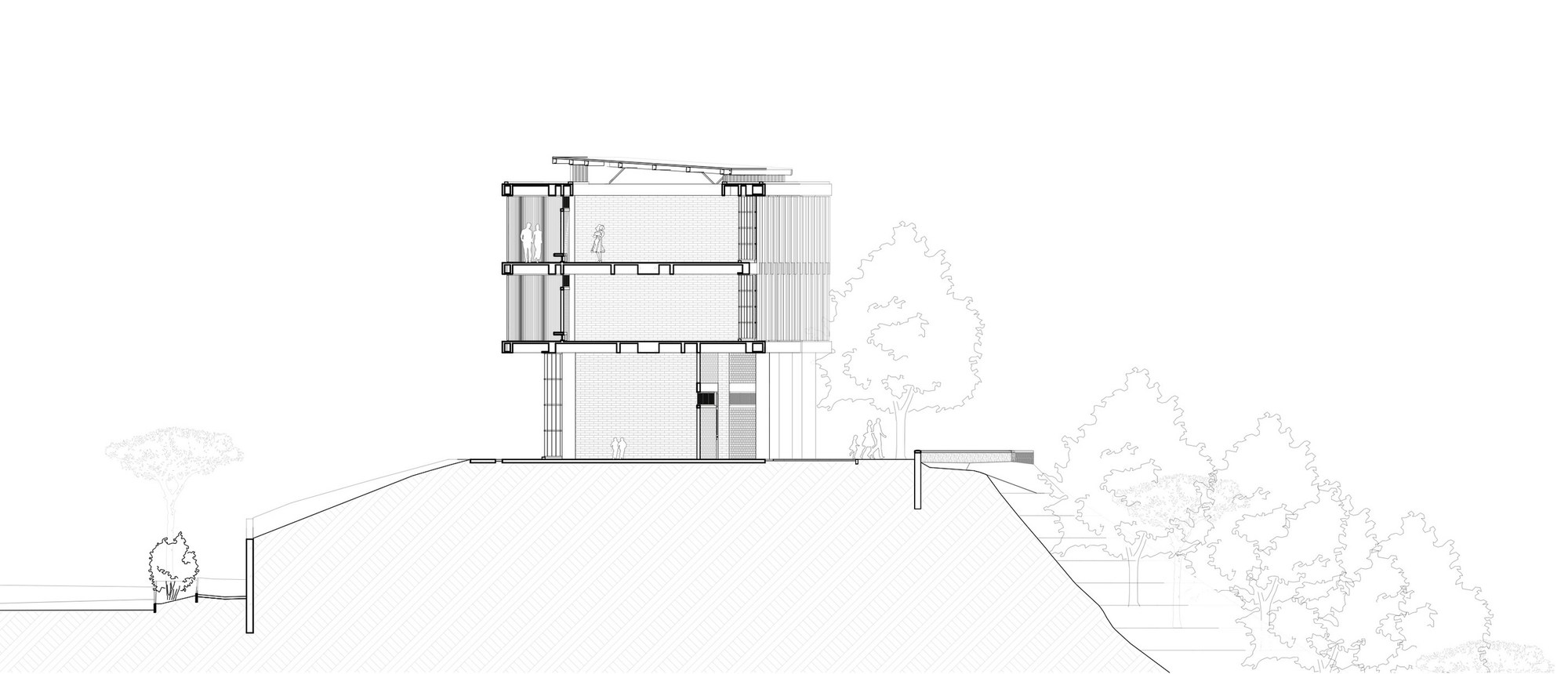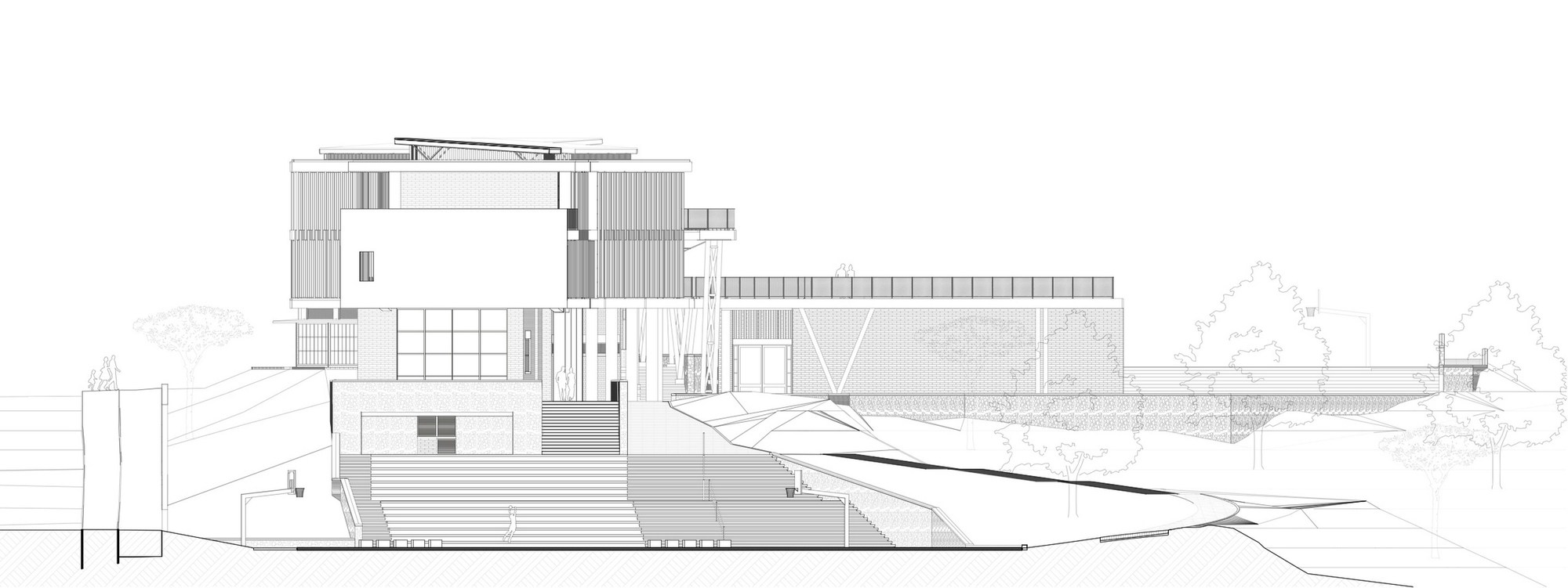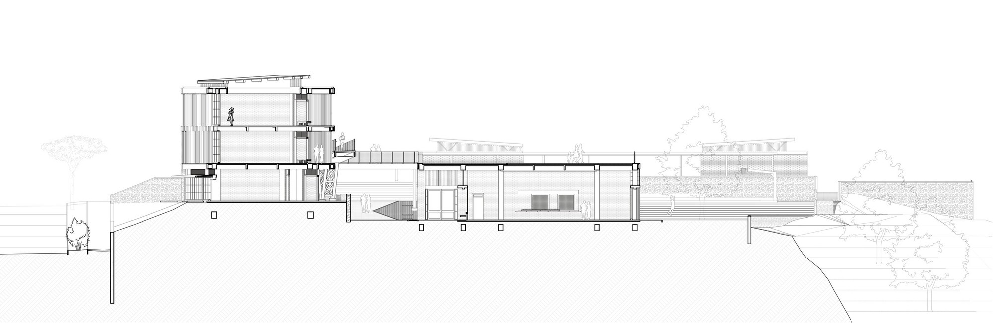 受限於零碎腹地,3層樓高的主體構造橫向貫穿東西兩端。教室精準座落於南北座向,學子能遠眺市中心繁華天際線,亦可近觀都會邊界的自然起伏。巨大主量體宛如堅實盾牌,溫柔守護內部免受外界喧囂干擾。受保護的腹地內,散落數處獨立區塊,涵蓋大禮堂、運動場、主庭院及環繞專屬天井的附設幼兒園。各樓層仰賴戶外坡道與橋樑串接至禮堂屋頂,同時化作開闊的首要集會廣場。立體化的動線交織出充滿活力的校園網絡,讓人在層層遞進間,輕易看出整體空間配置的豐富層次感。