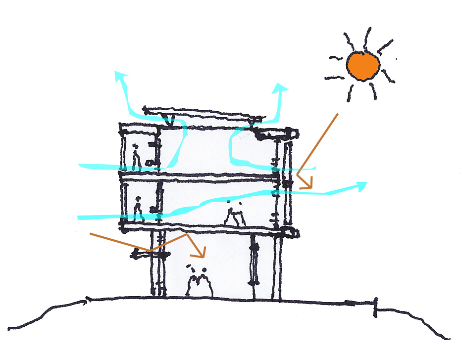 面對溫和卻多變的赤道高山氣候,建築師事務所全面導入被動式節能設計。 捨棄耗能的人工空調系統,全面仰賴自然通風來調節各區域的熱舒適度。新鮮氣流自竹製百葉立面長驅直入,配合屋頂特殊構造形成高效的交叉對流,迅速帶走室內悶熱。依循天地運行法則的綠建築策略,不單單達成極為可觀的能源節約效益,更向年輕世代傳遞尊重自然環境的嚴肅課題。採光與氣流的絕佳配合,讓學童能在最天然的環境中專注學習,強烈呼應當代追求淨零碳排的國際趨勢。