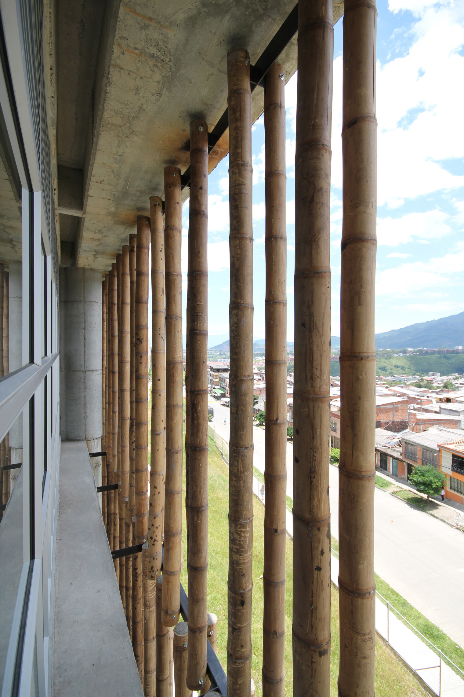哥倫比亞(Colombia)中西部咖啡軸心帶的佩雷拉(Pereira),因安地斯山脈與深邃峽谷交錯,形塑出峰巒疊嶂的特殊都市紋理。人口急遽攀升的南側邊緣地帶,亟需嶄新公共設施注入活水。哥倫比亞建築師事務所 Campuzano Arquitectos 選址於高聳山脊,南面俯瞰壯闊峽谷,北側緊密銜接既有老舊社區。受限於極端封閉的幾何形狀腹地,促使主量體必須順應陡峭地形輪廓,猶如巍峨巨艦穩穩停泊於錯落聚落之中,順勢界定出主幹道與校園之間的清晰邊界,替新興城區立下視覺座標,更帶出拉丁美洲城鄉發展的龐大動能。