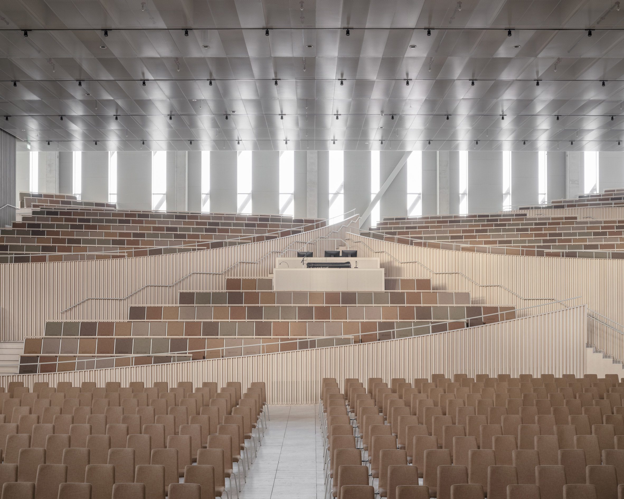 為了支撐教堂上層的結構,同時讓下方的教堂大廳維持無柱設計,建築師採用大型桁架結構。這種結構系統可以維持教堂大廳的寬敞開闊,也讓整體空間更具現代感。桁架結構是一種由直桿組成的三角形結構,常用於橋樑、屋頂等大型建築中,具有重量輕、強度高的特性。