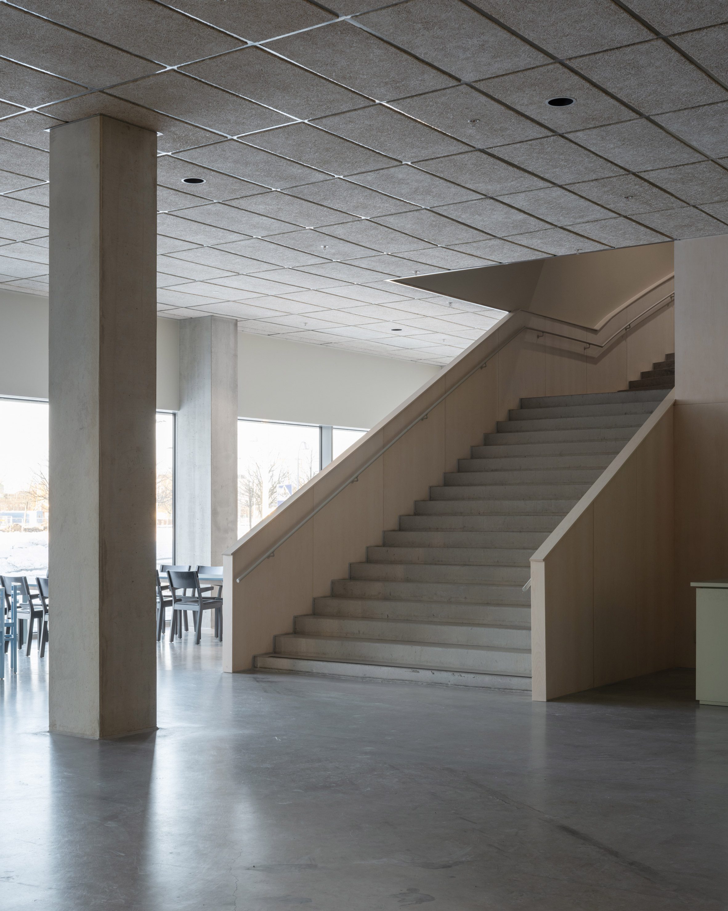 教堂的三樓以上規劃了教育設施與大型多功能廳,這些空間圍繞著一個三層樓高的中庭,中庭設有螺旋樓梯,並引入自然光線,營造明亮舒適的空間。Frihamnskyrkan教堂的多功能廳,可用於舉辦講座、會議、展覽等活動,滿足社區的多元需求。
