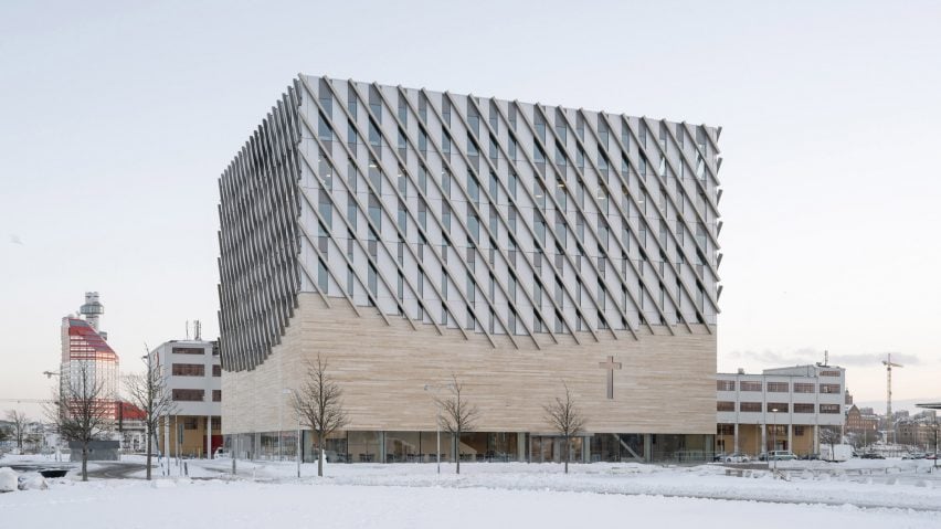 因此,他們選擇簡約的立方體設計,並以抽象化的 Smyrnakyrkan 教堂標誌——麥穗,作為外觀裝飾的靈感來源。教堂外牆覆蓋著斜向排列的鋁條,在視覺上產生摩爾紋效果,呼應聖經中麥穗的象徵意義,也讓Frihamnskyrkan教堂在周遭環境中更顯獨特。