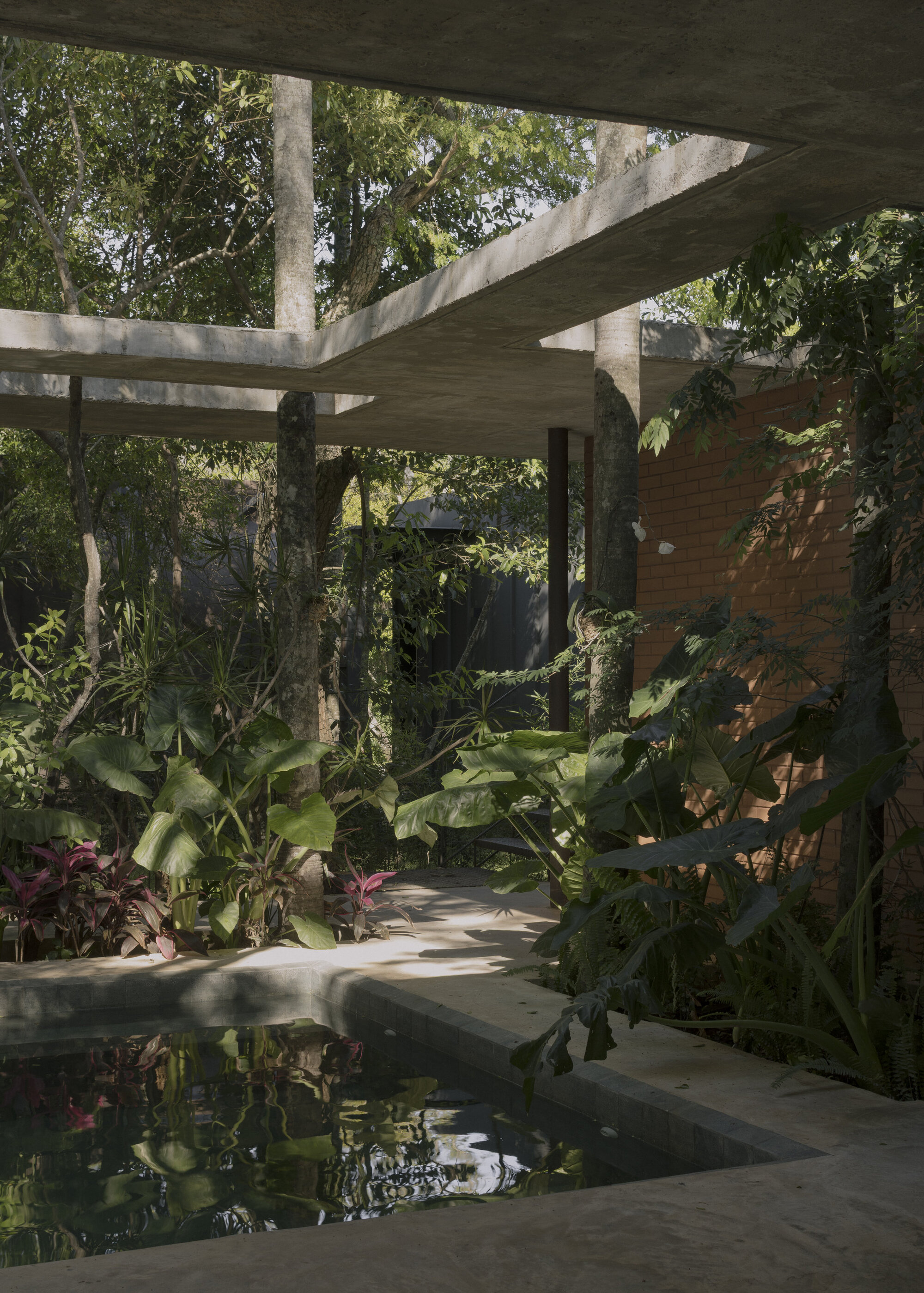 屋頂的邊緣界定了建築的範圍,就如同音樂中的基礎結構;而在這個框架之內,實體與虛空的配置則像是樂器在即興演奏,隨興而直觀地適應著既有的自然元素。沉默之於音樂,如同光影之於建築;節奏組織了聲音的時間分布,而樹木則引導了空間的流動。這種將建築視為凝固音樂的觀點,讓「A Forest in the House」充滿了律動感,彷彿一首由鋼筋、混凝土與樹木共同譜寫的爵士樂章。