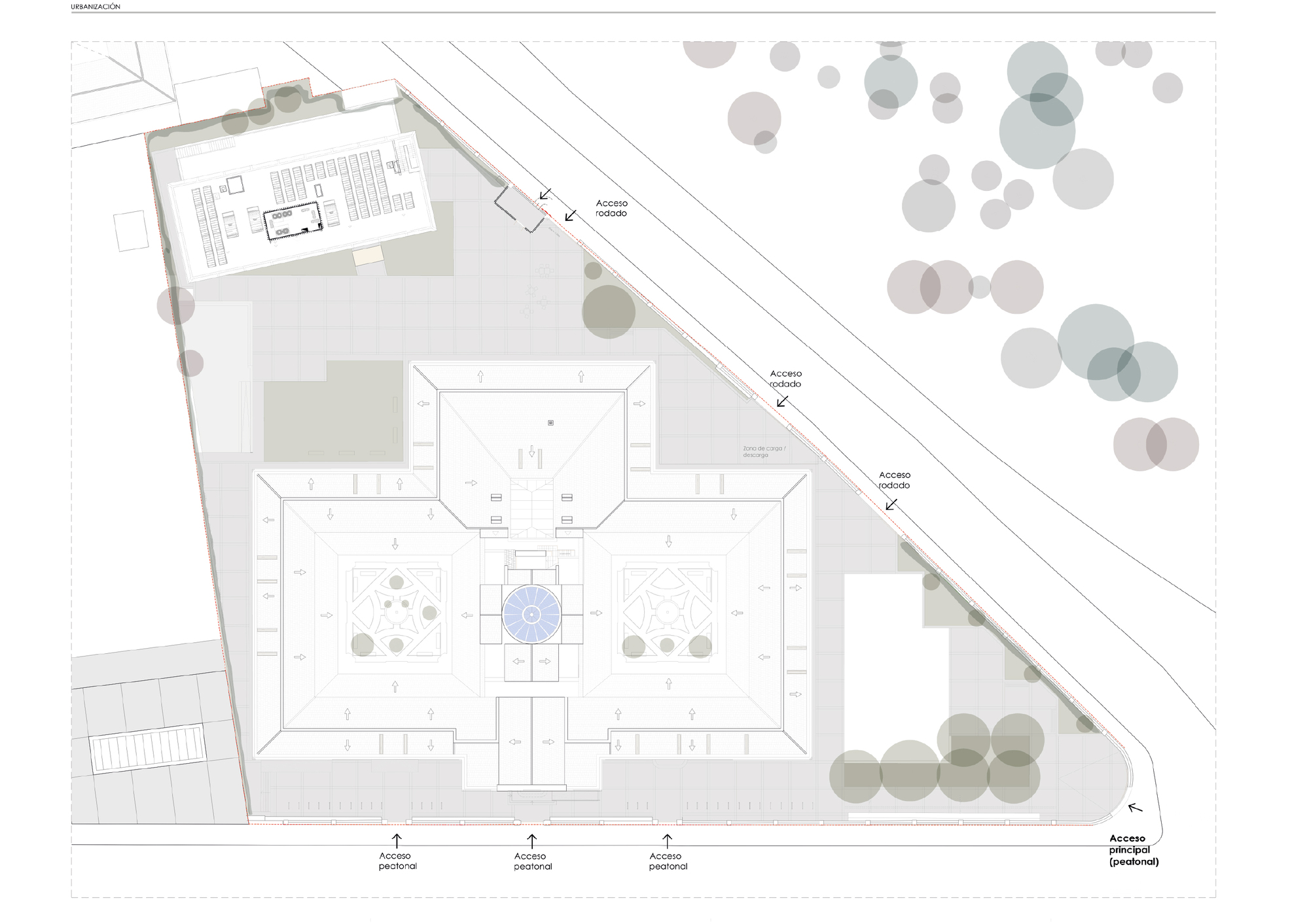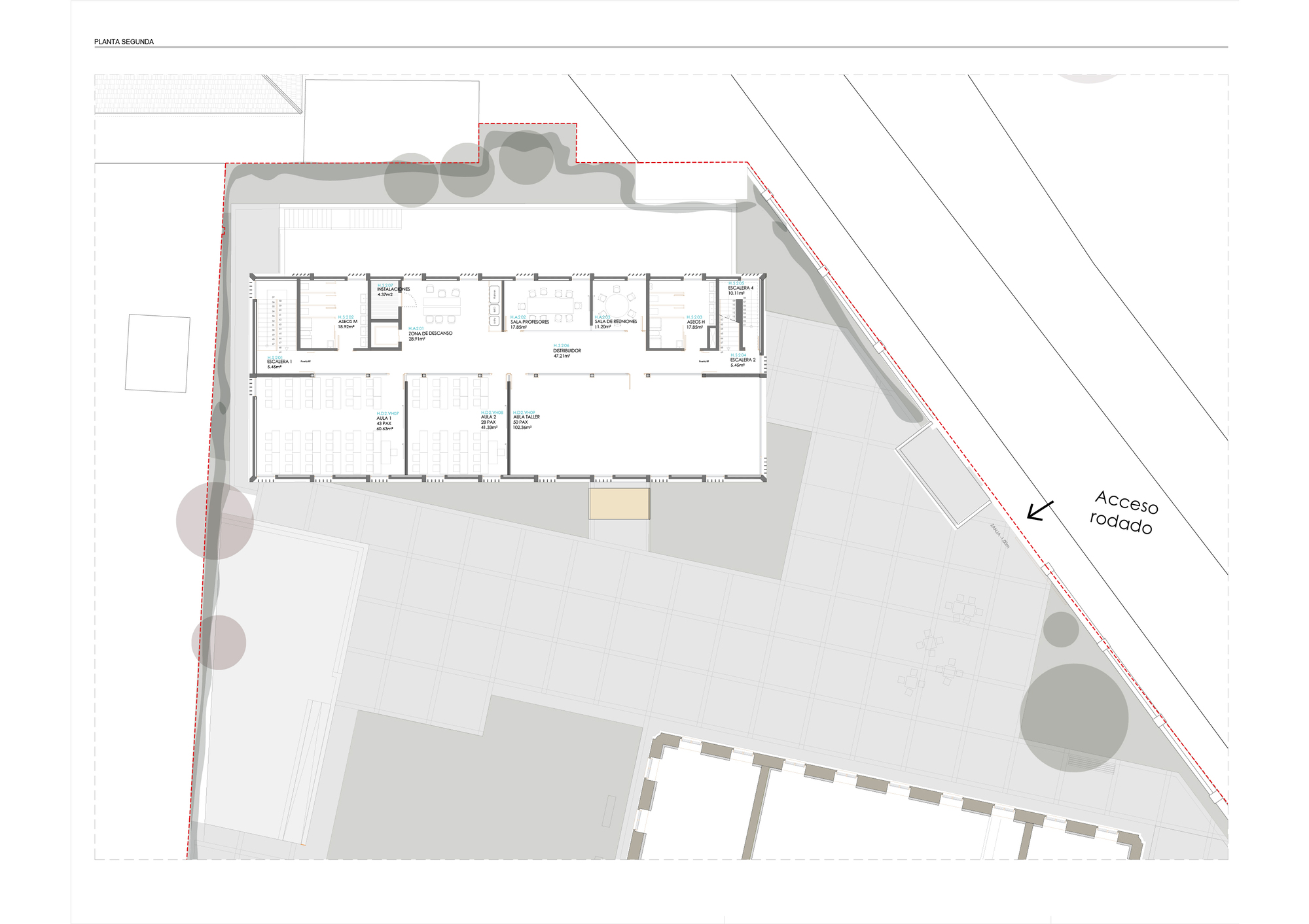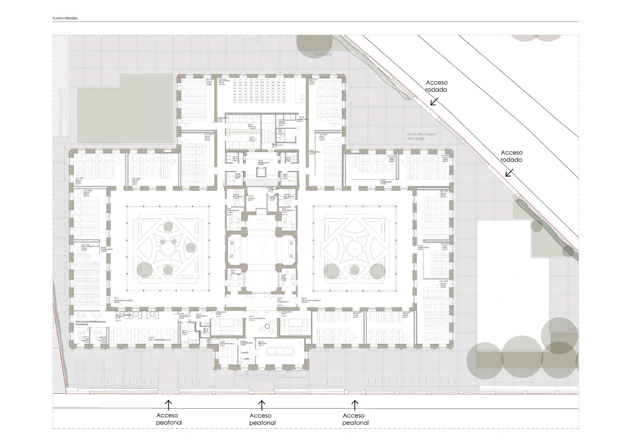 建築設計精準回應學術機構的需求,將空間的多功能性、高效率與實用性列為優先考量。整體的平面配置促進了學術課程的清晰組織,展現了均衡的配置方案。建築物結構圍繞著兩個帶有迴廊的側翼展開,教室與辦公室便配置於此,確保了教學與行政的區隔。中央主體則容納了公共區域,被構思為師生交流與協作的觸媒空間。面對主立面的區域,則保留給行政管理單位使用,形成清晰的公私動線。