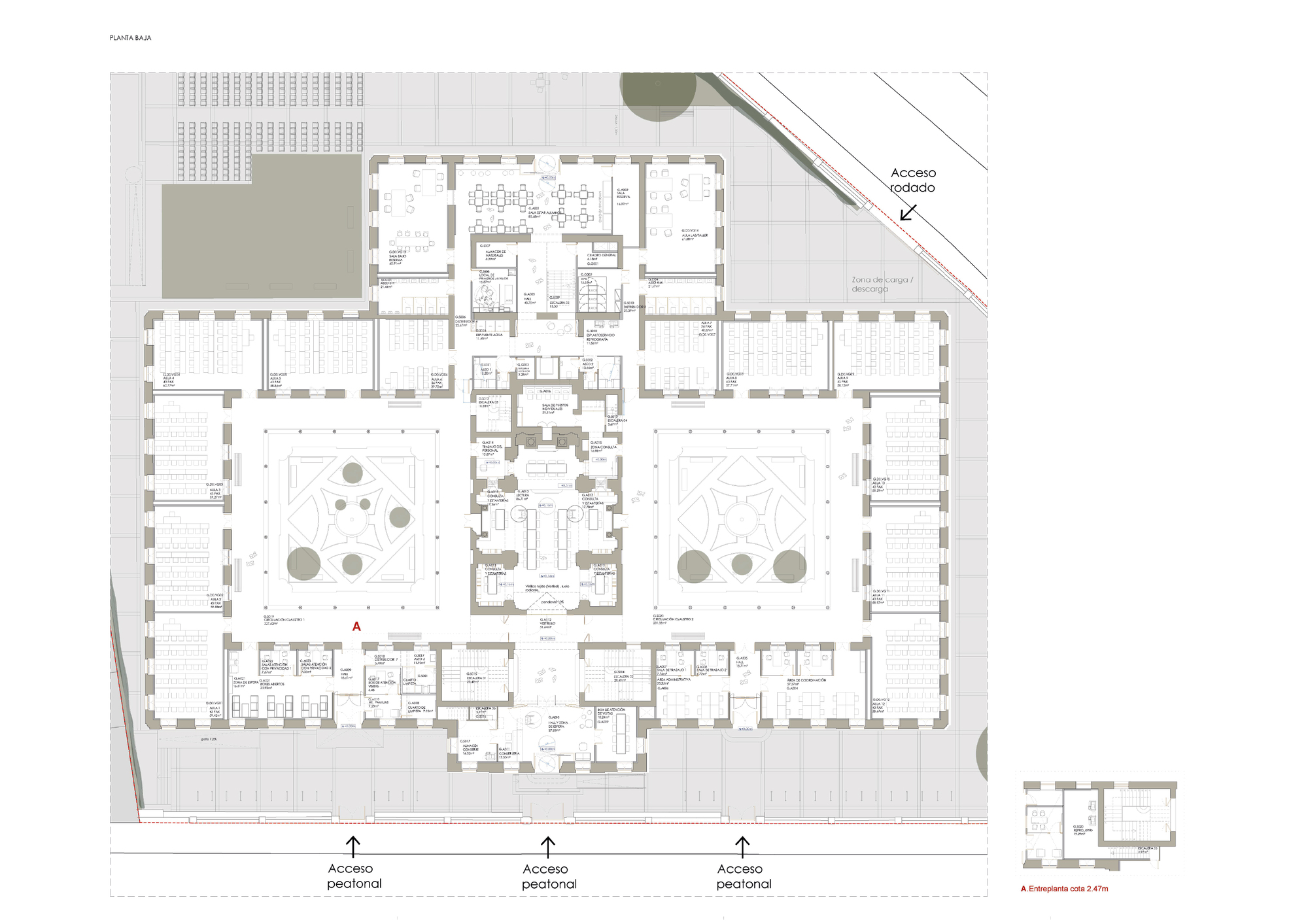 雀屏中選的地點,是前聖胡安·包蒂斯塔療養院(San Juan Bautista Asylum),一座建於1873年、具有新古典主義風格的建築。其豐厚的歷史與建築遺產,提供了巨大的修復潛力。院區地理位置極具戰略性,座落於瓦倫西亞市區,正對瓦倫西亞現代藝術學院(IVAM),緊鄰已轉型為巨型城市公園的前圖里亞河床(Turia Riverbed)。如此得天獨厚的條件,使之自然融入都市紋理,成為連結舊城區與當代生活的關鍵樞紐,宛如歷史與現代的交會。