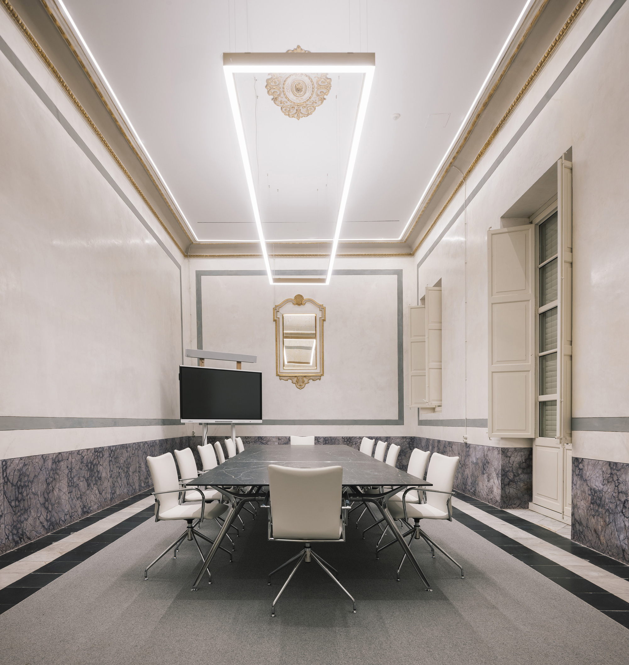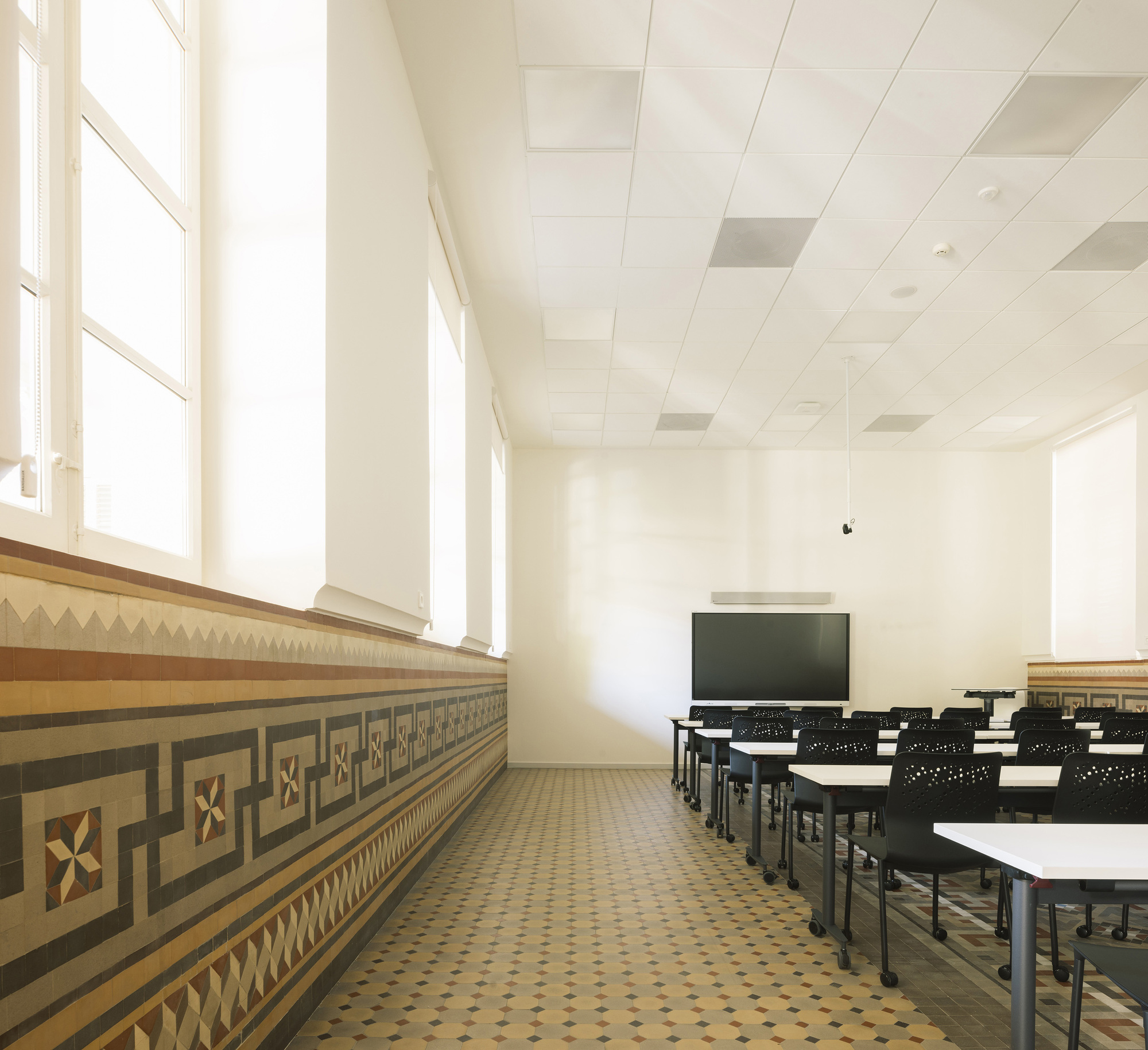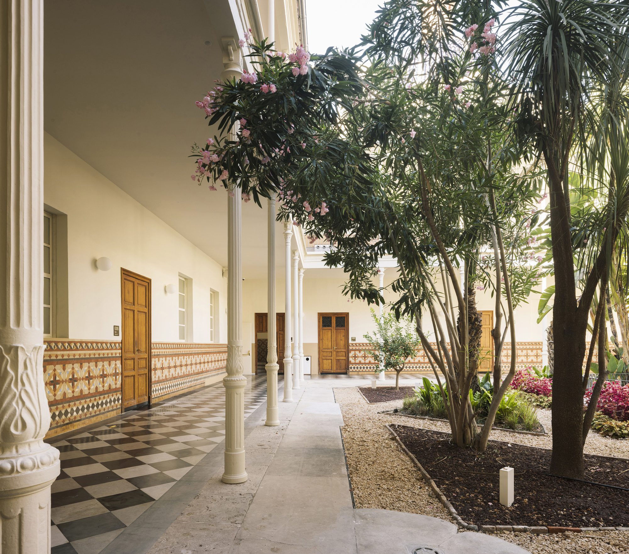 尊重既有建築,是貫穿全案的核心準則。聖胡安·包蒂斯塔療養院的修復工作,始終將遺產保護置於首位。團隊投入大量心力,恢復了諸多珍貴的原始元素,例如色彩斑斕、工藝繁複的諾拉馬賽克(Nolla mosaics)、古老的石材地板、莊嚴的禮拜堂以及經典的迴廊結構。建築師在原始材料與新式建材間尋求微妙的平衡,巧妙導入當代解決方案,同時堅定地保持了建築物原有的精神與本質,避免了粗暴的拼貼。