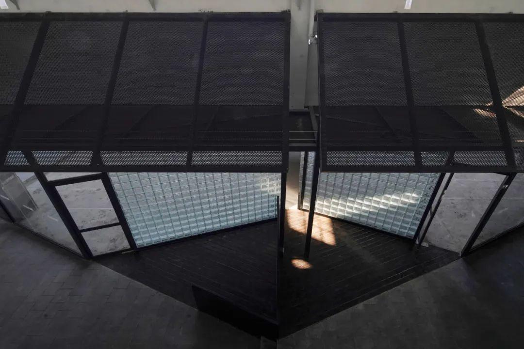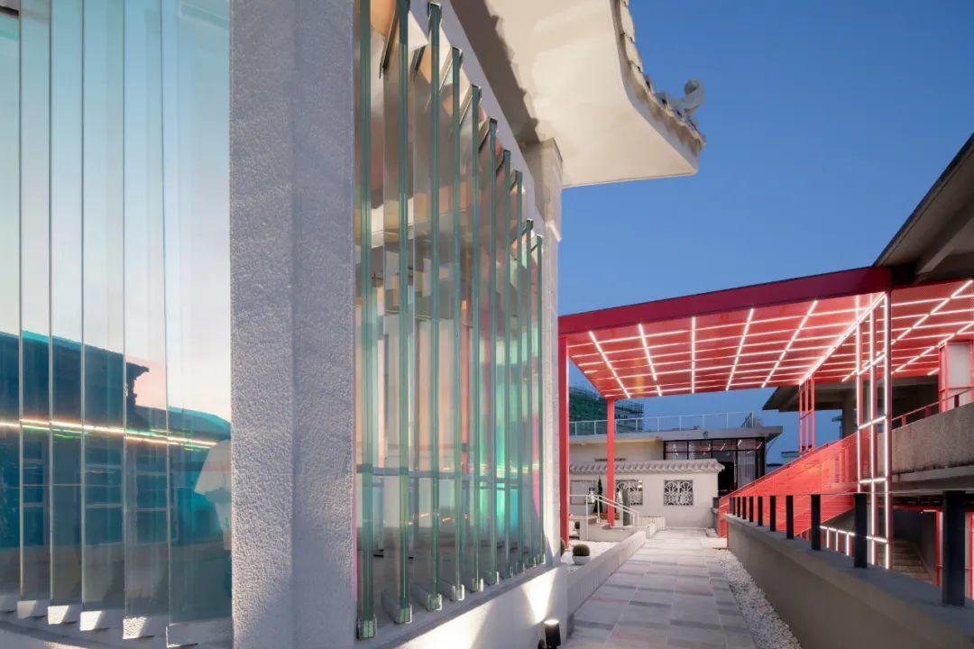 在柴油機廠的舊食堂中,地面層和頂層各有一處傳統園林。設計過程中設計團隊選擇將園林中的假山,水池,花窗,涼亭等要素的基本形態保留下來,通過刷白的方式抹去它們作為物質的屬性,強調其符號般的象徵性意義。同時在園林中加入了炫彩玻璃和不鏽鋼等新材料,用原有的百葉、石頭、窗套等形式表達出來。