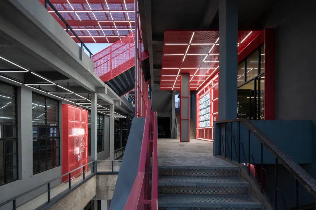 柴油機廠2、3號樓的各層層高也各不相同,為了連結兩棟樓之間不同高度樓層,在兩棟樓之間的天井空間內,原先的設計師在這裡放置了一座形態複雜的樓梯,改造過程中,這個空間作為重點保留下來,並加入舊時廠區記憶的元素,打造了一個「樓梯博物館」。