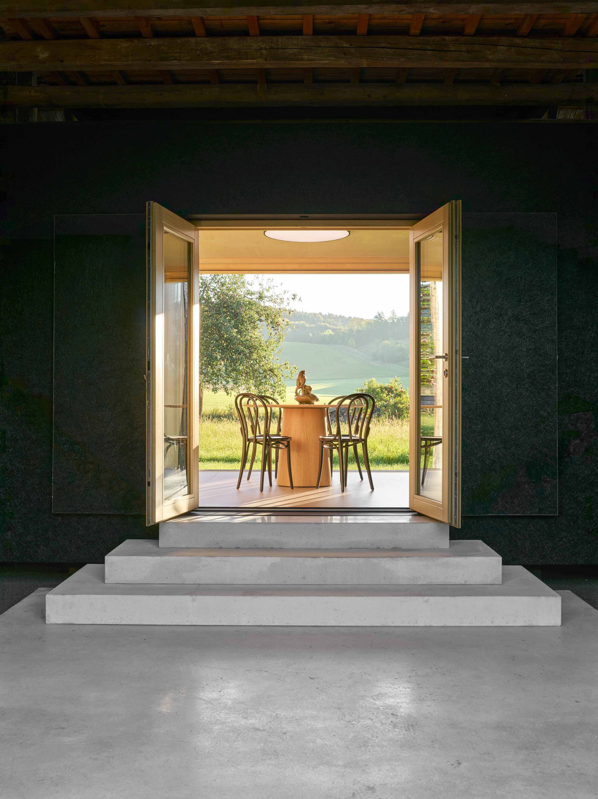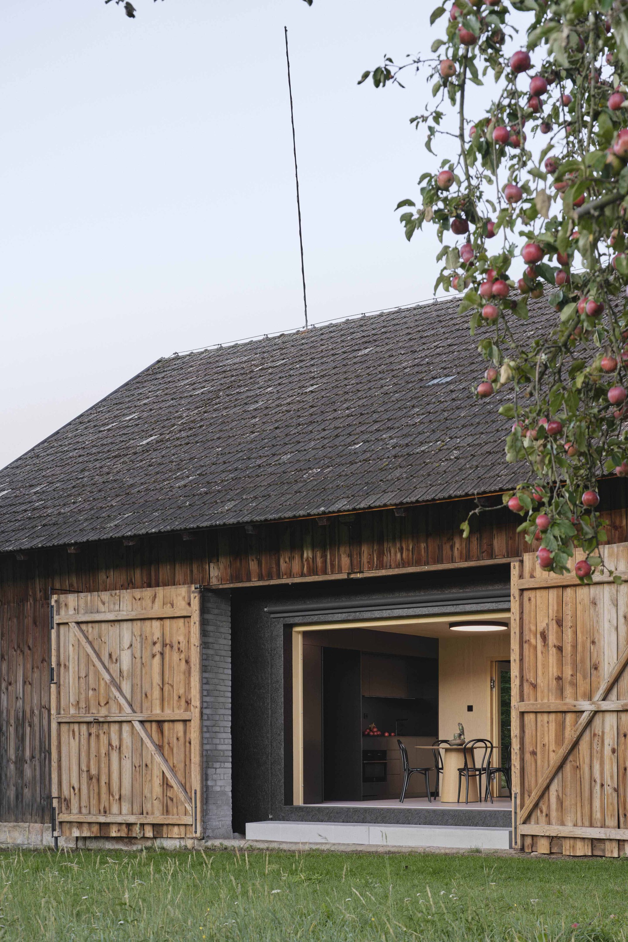 當穀倉大門敞開,巨大的滑動落地窗將視線毫無保留地引向戶外,那是一片種滿蘋果樹的盎然綠意,遠處田野的小徑蜿蜒而上直抵森林邊緣。這扇窗不僅是採光的開口,更是一幅隨著四季更迭的動態畫框,將捷克波希米亞地區(Bohemia)特有的靜謐田園風光攬入室內,讓居住者在極簡的空間中與自然聲息相通。