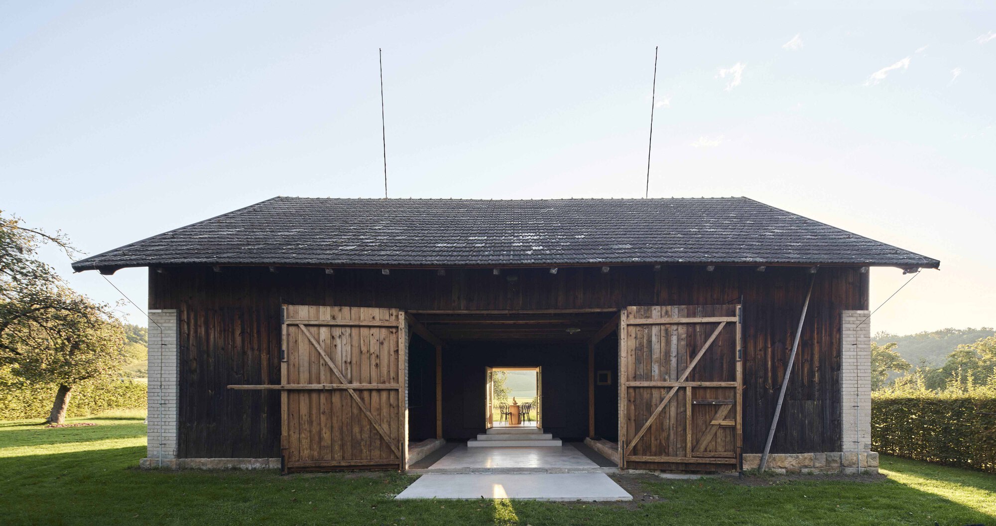 從外部審視,這座穀倉依然維持著原本質樸的農村面貌,當巨大的木製滑門與側窗緊閉時,外人幾乎無法察覺內部早已發生翻天覆地的變化,這是關於「藏」的空間美學實驗。
