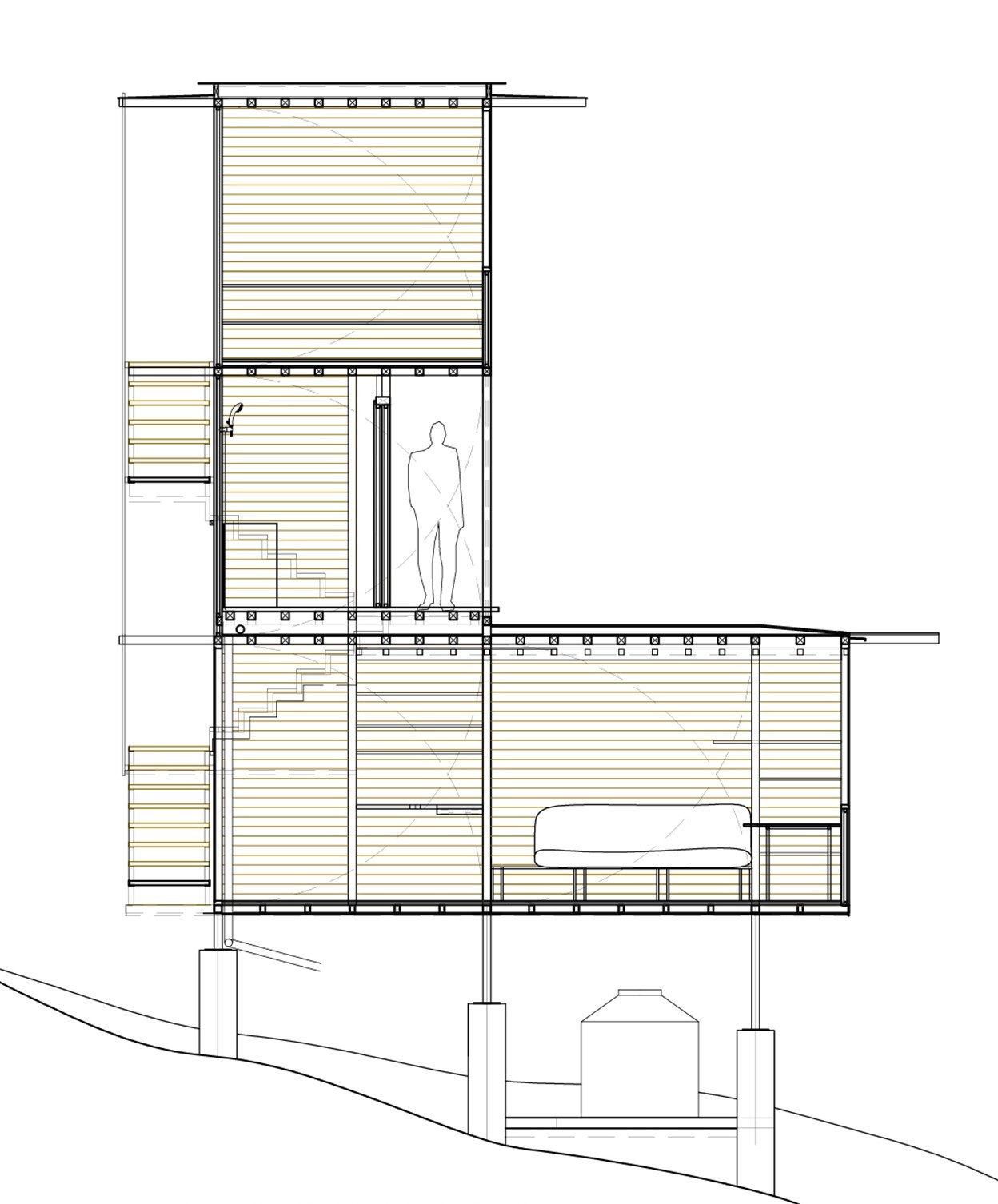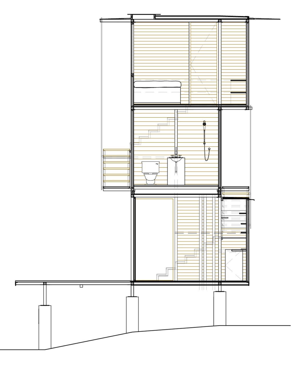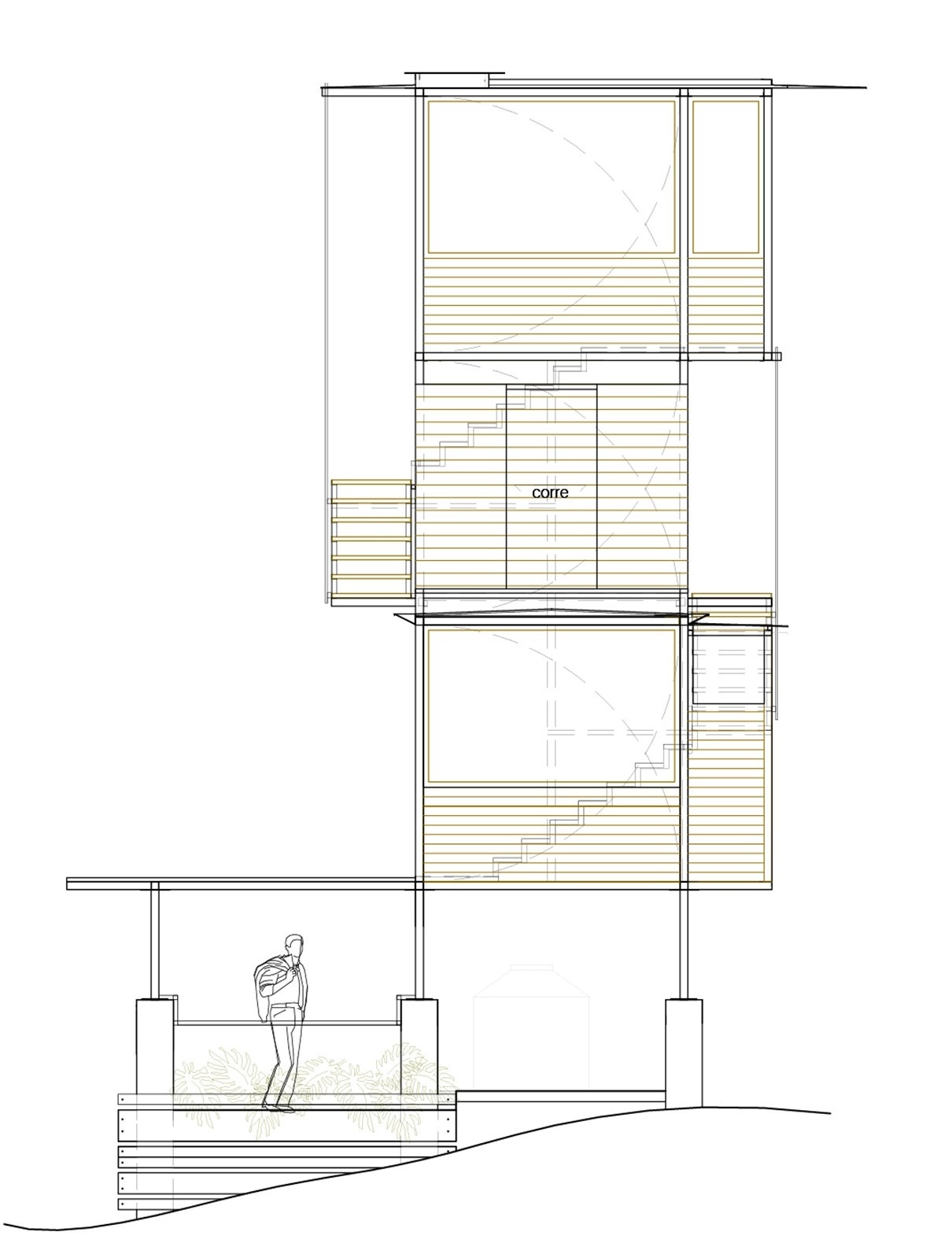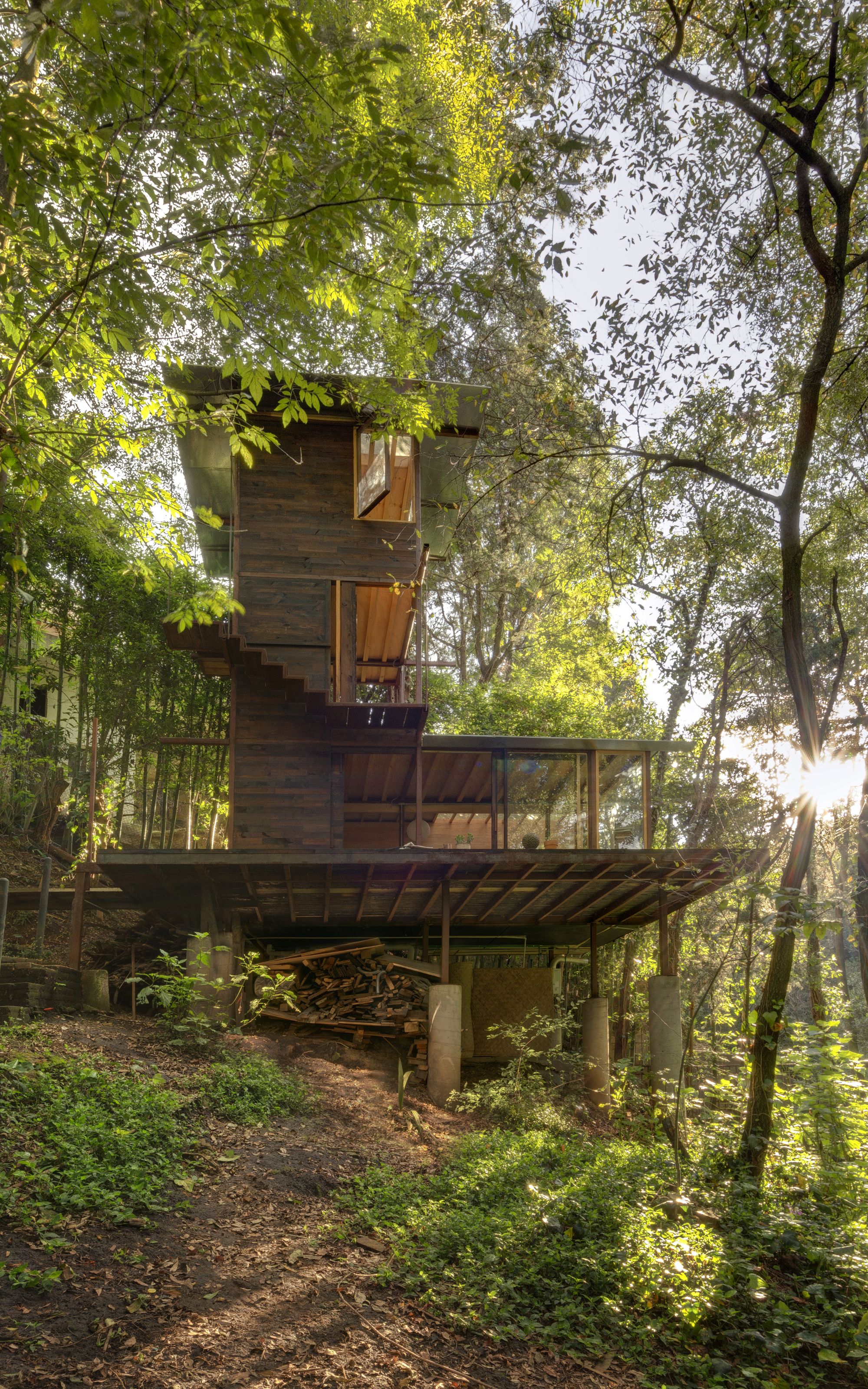 不同於傳統住宅向水平方向擴張的野心,這座建築選擇了一種垂直生長的螺旋形態。設計團隊的靈感直接汲取自環繞基地的參天樹木,建築的九根主要支撐柱如同老樹盤根錯節的根系,牢牢地抓緊陡峭的地勢,讓整座主體結構彷彿懸浮於半空中,輕盈地隱身在周遭的林冠層裡。