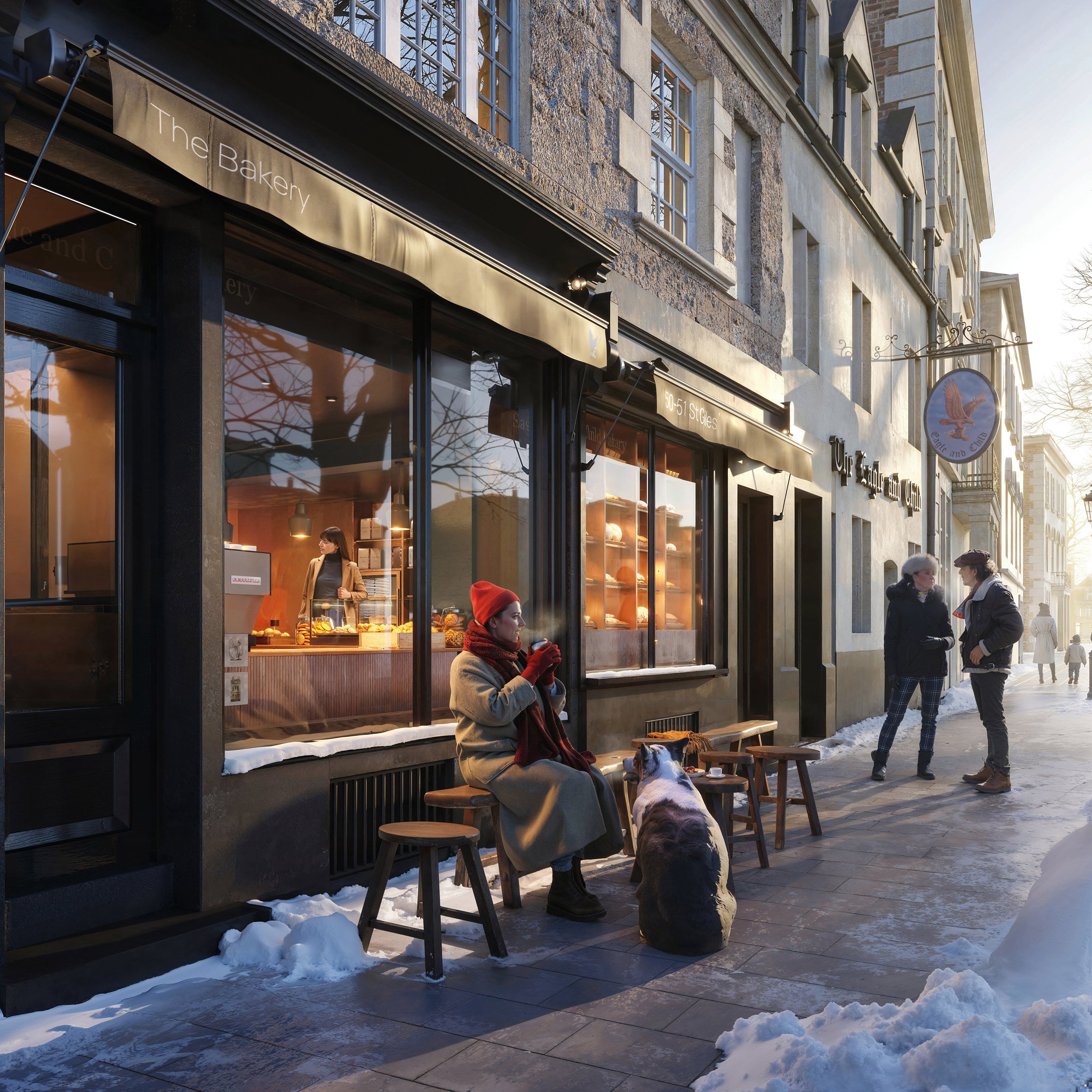 根據佛斯特事務所的規劃,整個設計的核心,是在最大限度地保存這座已閒置酒館的原始特色的前提下,為其注入新的生命。具體的作法,是在建築的上層,為EIT的研究人員,引入非正式、充滿家庭氛圍的工作空間;並在相鄰兩棟建築的較低樓層,創建一個全新的咖啡館。佛斯特建築師事務所的負責人Gerard Evenden表示,此舉希望能將「老鷹與小孩」,從一個僅在夜間營業的傳統酒館,「轉化為人們從白晝到夜晚都可以去的地方」。