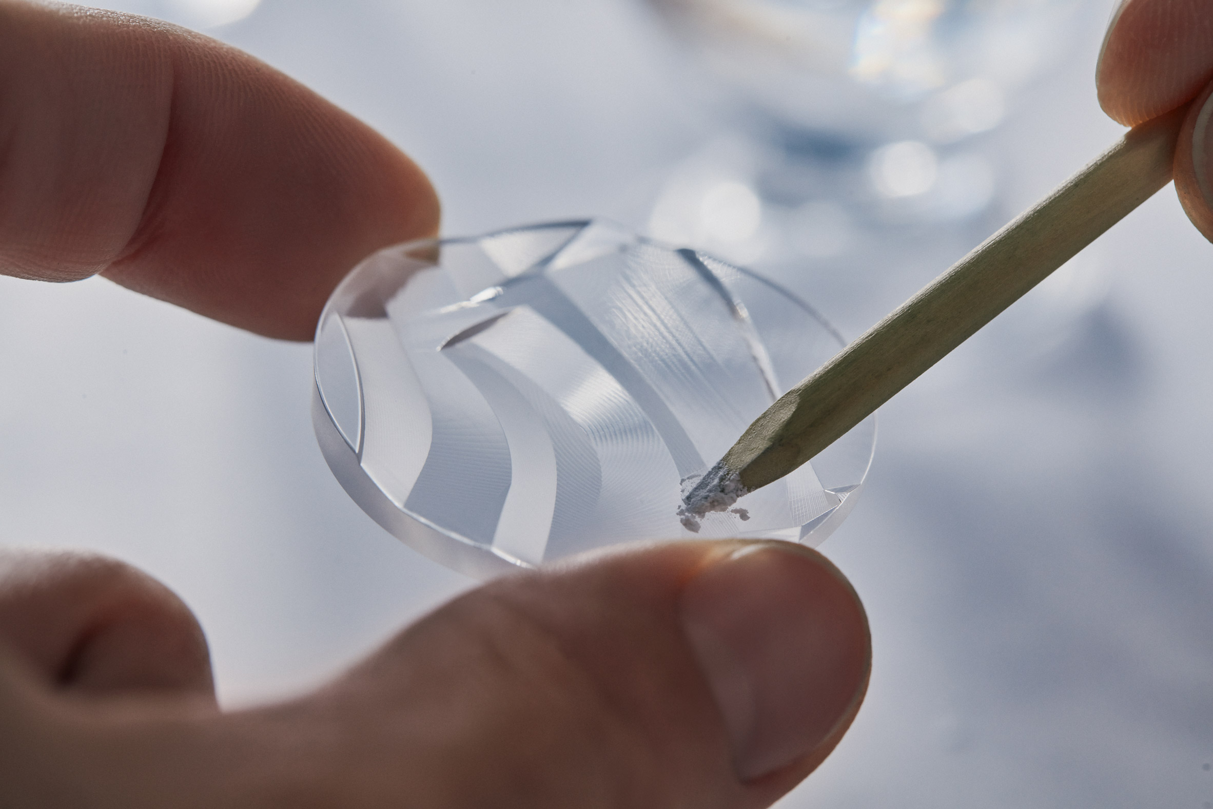 藍寶石水晶雖然晶瑩剔透,但高脆性使得雕刻過程稍有不慎便會前功盡棄,必須全神貫注。工匠們以純手工方式一點一滴地雕琢出蓋瑞筆下的起伏與立體浮雕,這無疑是一場與時間和耐心的博弈。