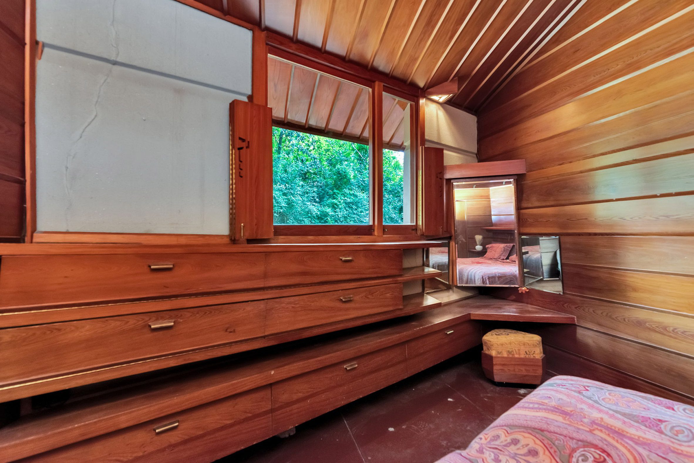 泉源之屋(Fountainhead)摒棄傳統立柱與石膏板,採全木質包覆與混凝土基礎,屋頂低平懸挑遮陽,內部四臥室、兩全浴室及兩半浴室環繞泳池區,流線設計讓生活空間如溪水般蜿蜒,萊特親繪家具如嵌入式書櫃與座椅,融入本土紅雪松紋理,營造視覺層遞之美,宛若山林隱居。