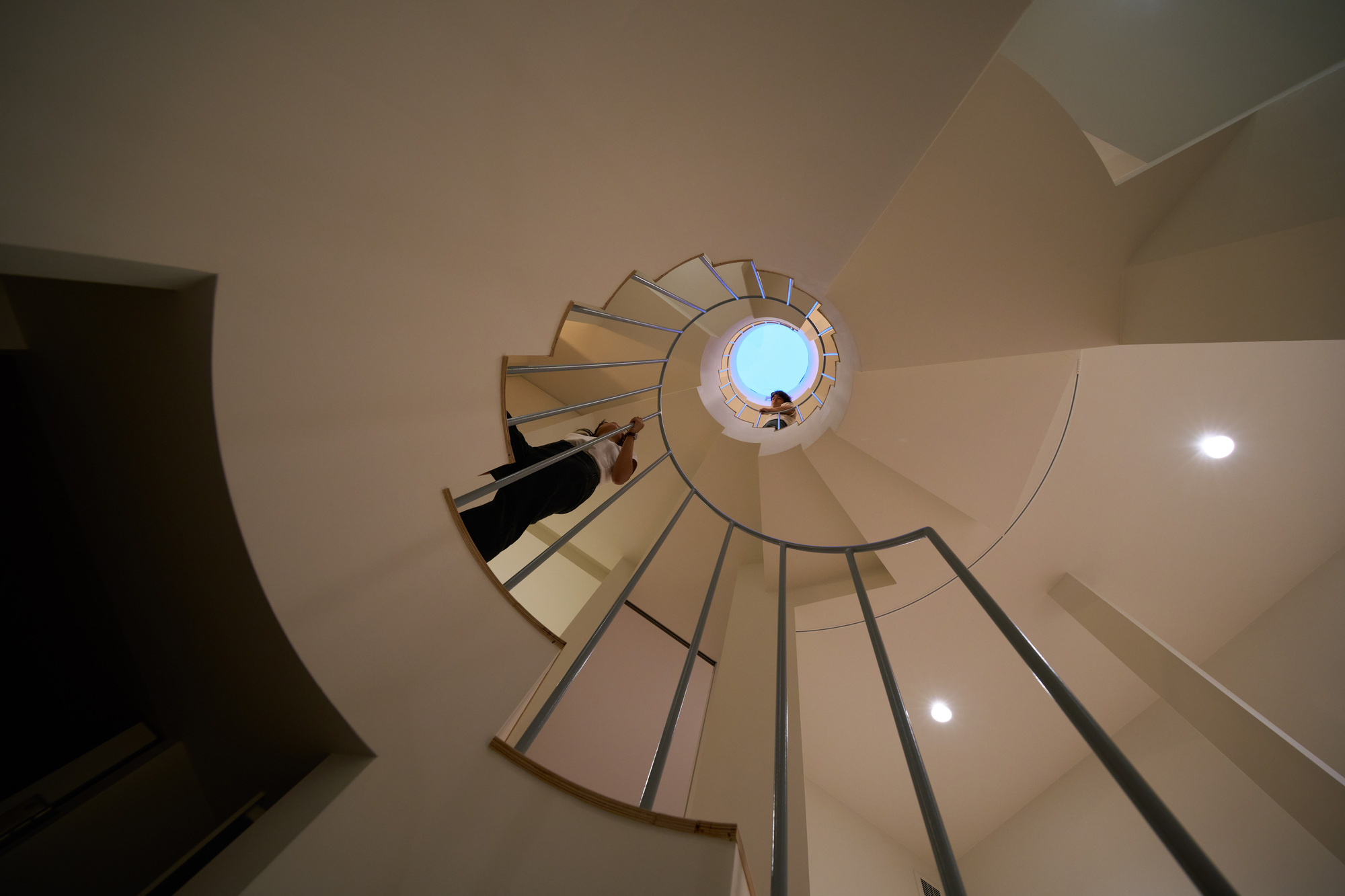 圍繞著這口光之井盤旋而上的,是一座木造的迴旋梯。在藤原・室的設計語彙中,樓梯從來不只是單純的垂直動線,而是一種精心編排的空間體驗 。這座階梯猶如一條舞動的緞帶,將所有樓層輕盈地串聯起來,引導居住者在攀升的過程中,不斷變換視角,感受光影的流轉與空間的層次。每一次的上下移動,都變成一場在家中進行的「垂直漫遊」,讓居住的日常充滿了遊走與探索的逸趣,徹底顛覆了在狹小住宅中移動的單調與侷促感 。