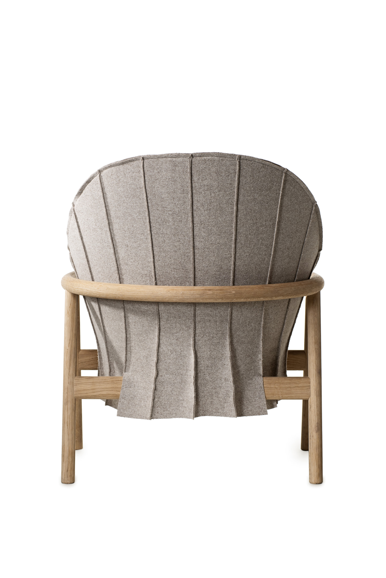 隈研吾還補充道:「使用瑞典的再生毛氈作為椅背的結構材,展現能包裹身體的柔軟觸感,並著重於『ひだ』的細膩感受。為了表現出包覆背部的感覺,我將這件家具命名為帶有擬聲詞意味的『ヒダヒダ』。布料並未完全包裹,而是設計成裙擺展開的形式,展現不過於厚重的輕盈感。」
