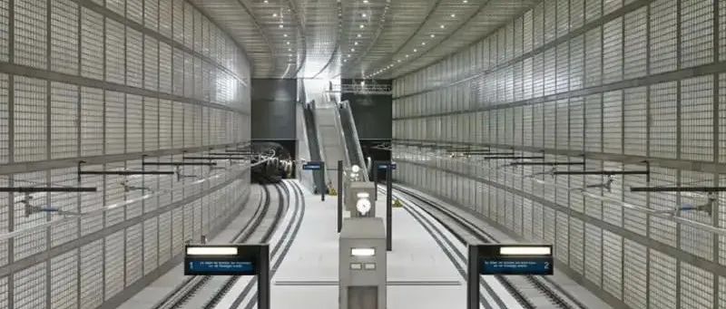 玻璃磚車站大廳帶來一種明亮而寬敞的感覺,重複使用同一個建築材料形成的空間語彙,其實際尺寸對乘客而言幾乎化為無形