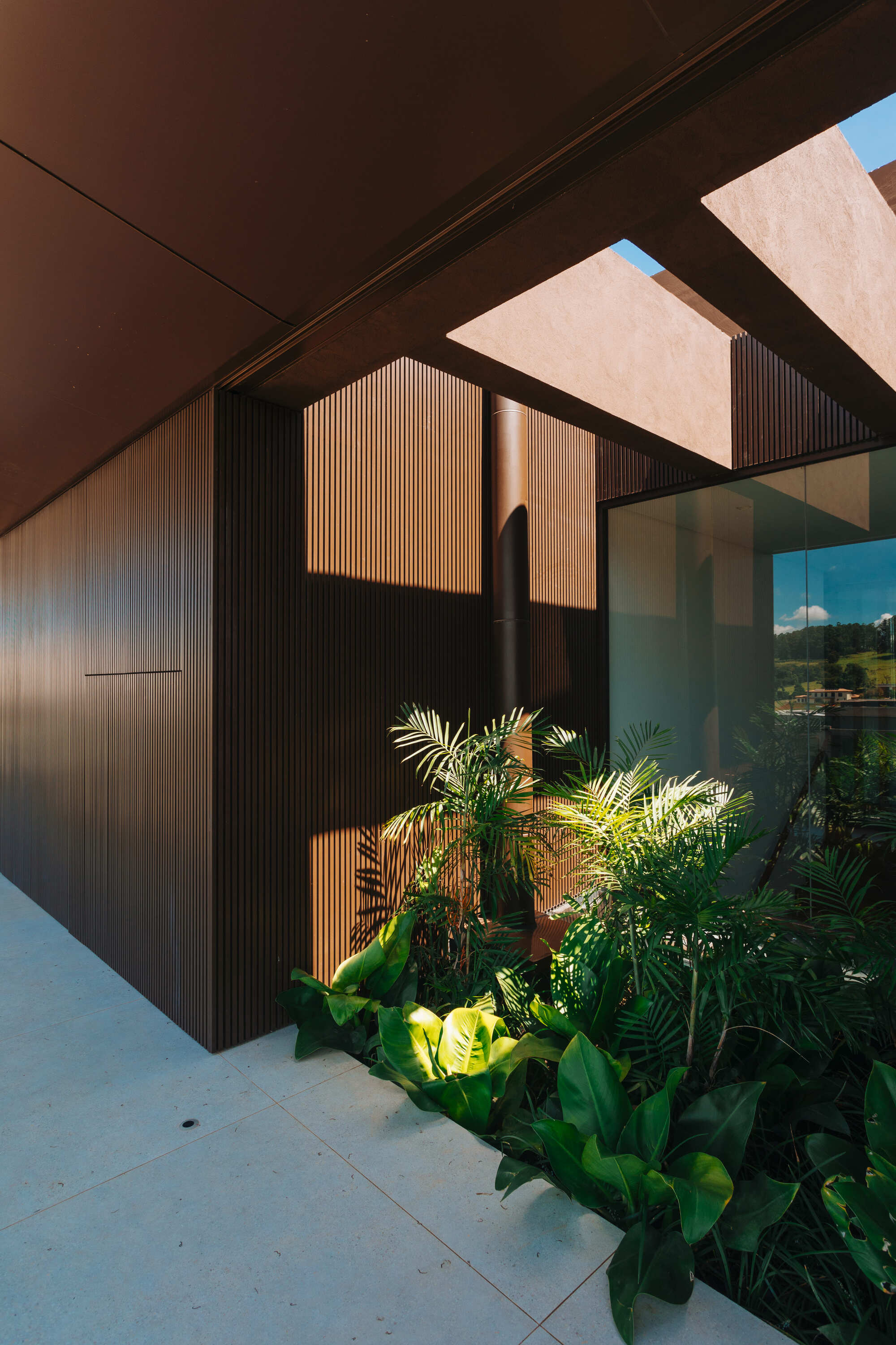 上層量體以連續鋁製百葉作為立面的主要表情,與地面層清水磚的厚重感形成鮮明對比。百葉的功能是三合一的:提供可調節的遮陽保護,在聖保羅州內陸強烈的日射條件下降低室內熱負荷;讓自然風在不完全開放立面的條件下穿越臥室,維持被動通風的舒適效能;同時作為視覺屏障,讓上層居住者在欣賞外部景觀時保持對社區的適當隱私距離。