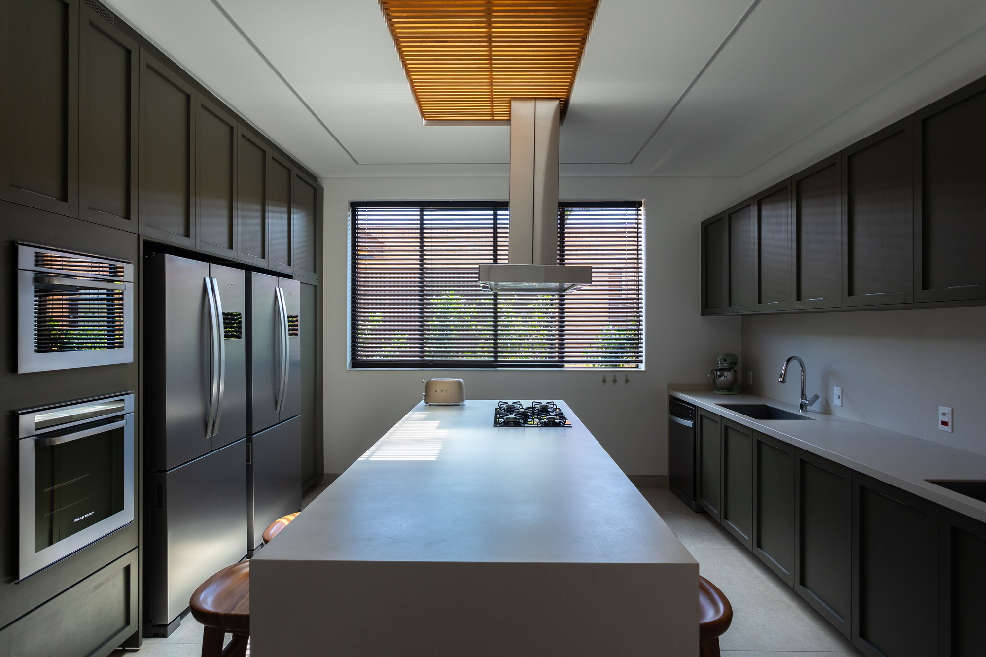 鋁百葉在巴西熱帶住宅中的應用極為普遍,在材料輕盈性、加工精度與耐候性三者之間取得成熟的平衡。Ximenes Leite Arquitetura 在此案中讓百葉以均等節奏排列,使上層量體在視覺上呈現一種帶有韻律感的輕盈表情,與下層磚面的靜態厚重形成兼具重量感與靈動性的立面對話。