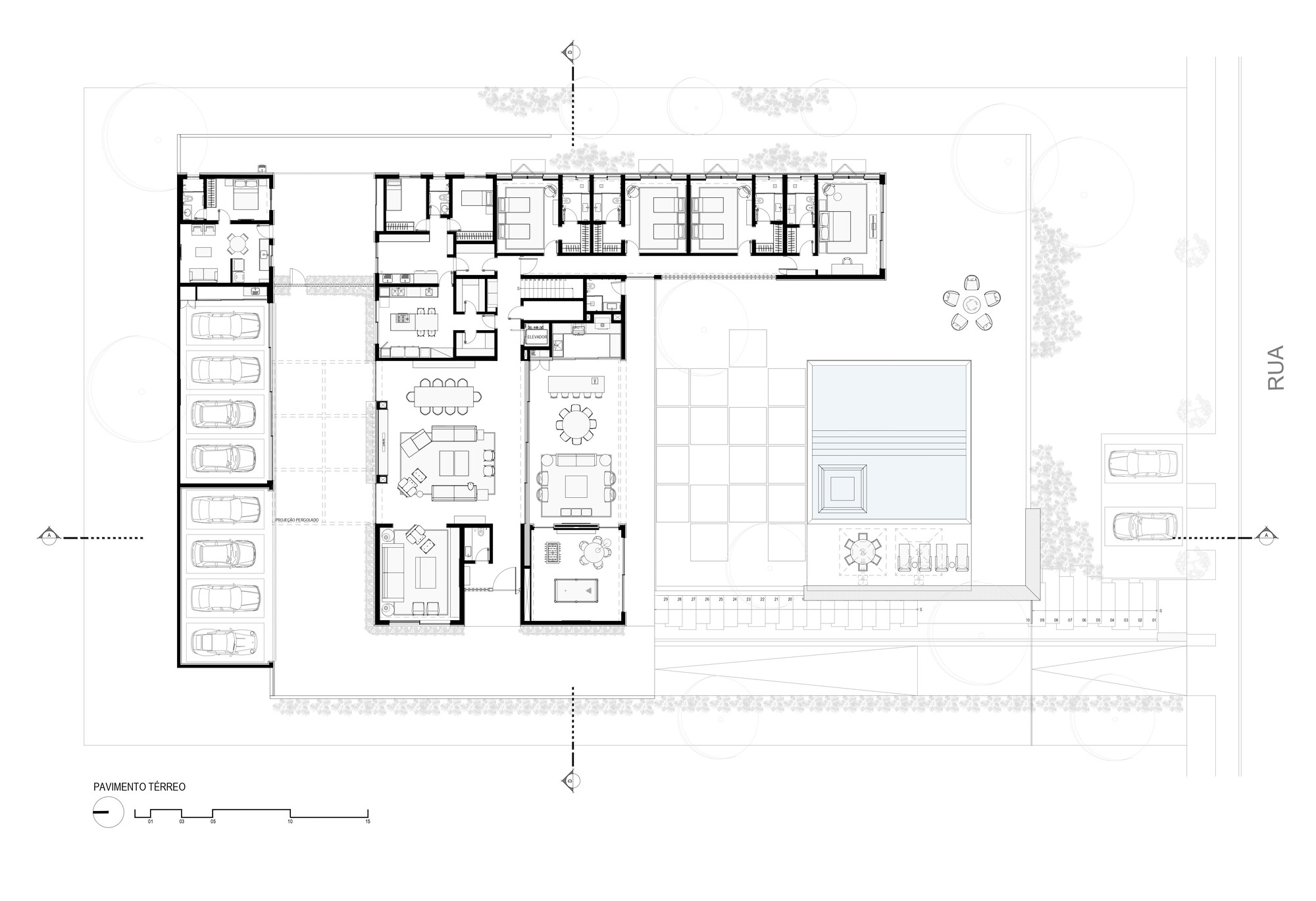 GLG 住宅的設計出發點極為清晰:以量體的疊合關係直接回應生活機能的私密程度差異。地面層量體以水平延展為主導姿態,立面向花園與戶外大幅開放,社交廳、餐廳與休閒空間在其中自然流動,室內外的邊界在大尺寸開口與外廊的介入下趨於模糊,讓巴西熱帶氣候中戶外生活的強烈傳統在建築語言上獲得充分的支持。