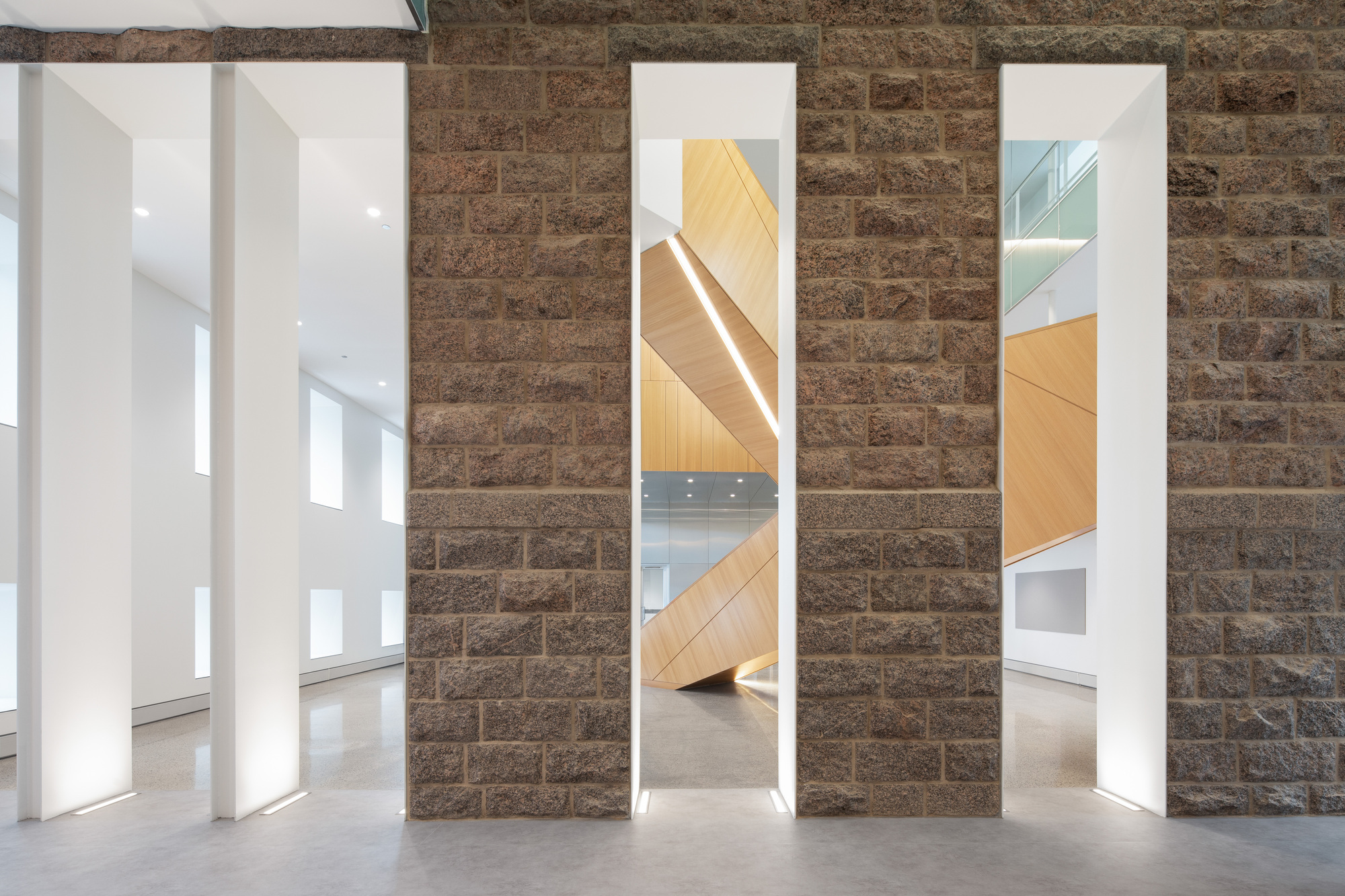 在機能配置上,充滿古典氣息的修復棟主要作為公共服務區域以及莊嚴的民事法庭(Civil courtroom);而那些需要更高安全層級的刑事法庭(Criminal courtrooms)、少年法庭,以及錯綜複雜的管制廊道,則被巧妙地整合安置在全新的當代建築量體之中。這種配置方式,讓新舊建築各司其職,在功能上互補,在視覺上產生了跨越時空的強烈對比與對話。