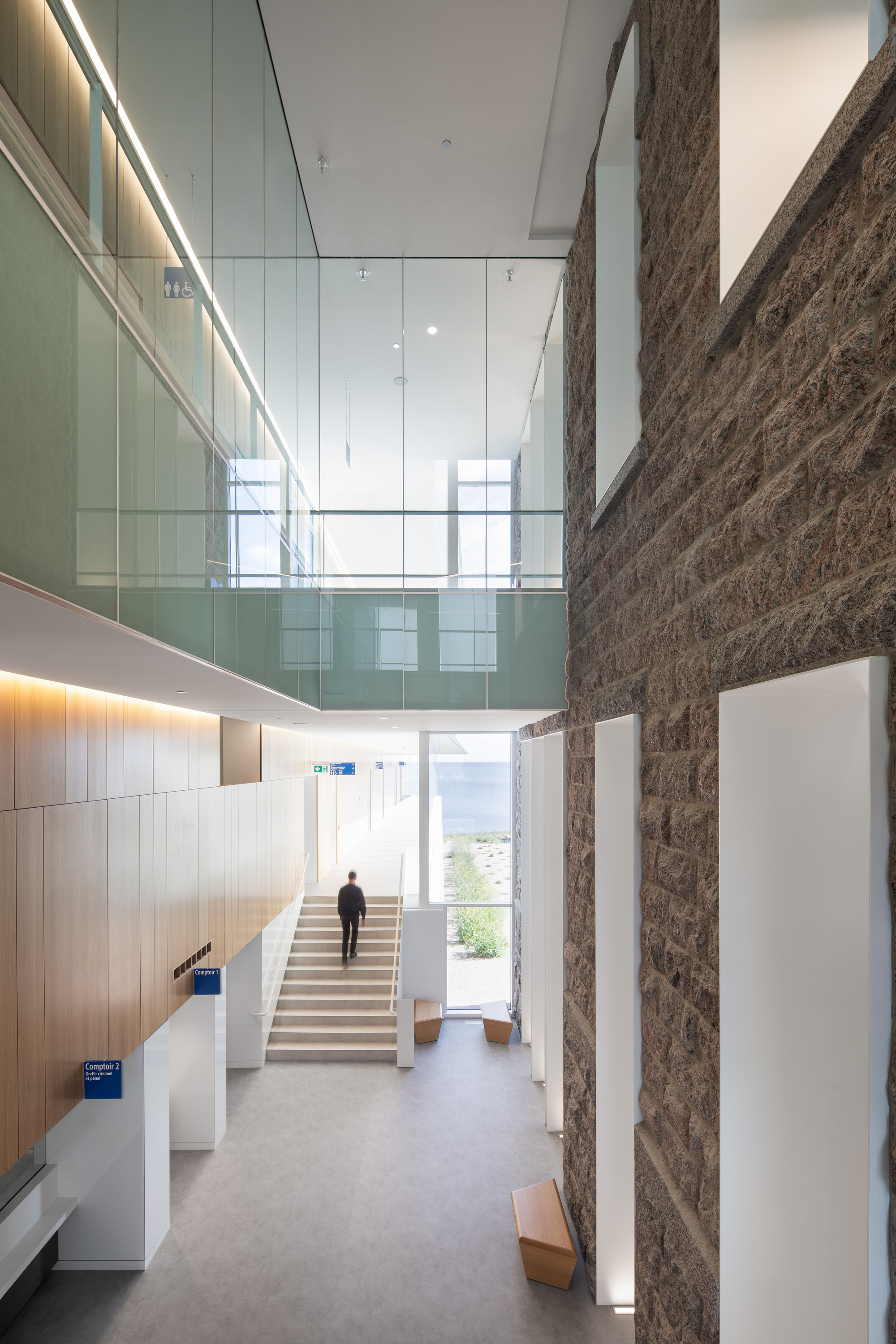 考量到法院通常是個充滿壓力與焦慮的場所,建築師特別將等候區安排在面向聖讓湖的位置,希望藉由廣闊平靜的湖水景致,為候審的民眾提供一個能舒緩情緒的療癒環境。主要的法庭空間被集中配置在視野最佳的「高尚樓層」(Noble floor),不僅確保了動線管理的效率,也讓空間組織更加易於理解。在材質的選擇上,Groupe A 混搭了當地開採的花崗岩、輕盈的鋁材與通透的玻璃,這種建材調色盤不僅強化了建築的秩序感,更生動地演繹了歷史遺產與當代介入之間的和諧共鳴。