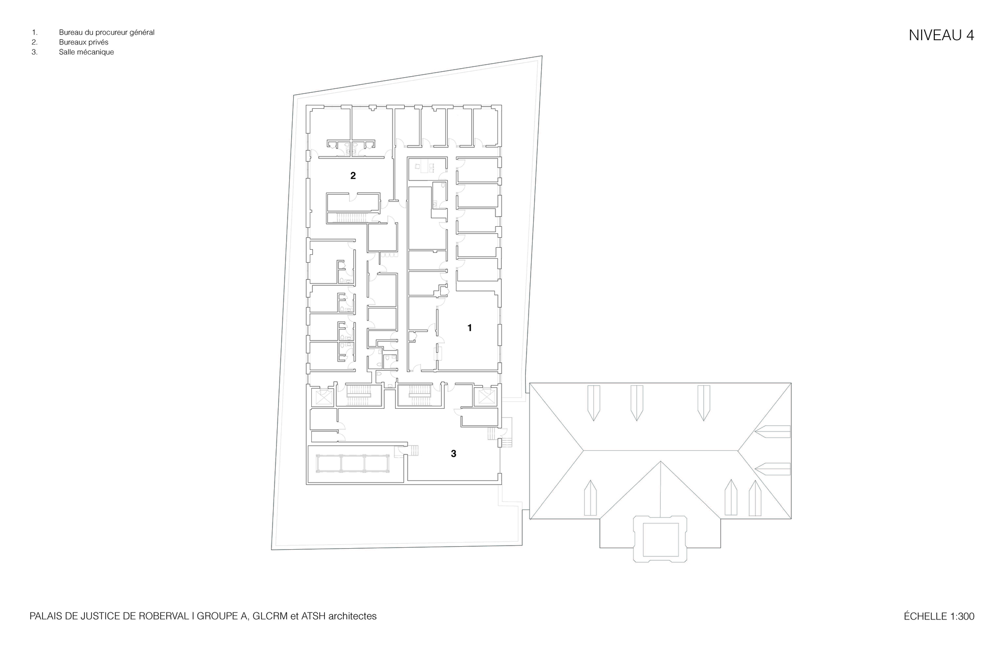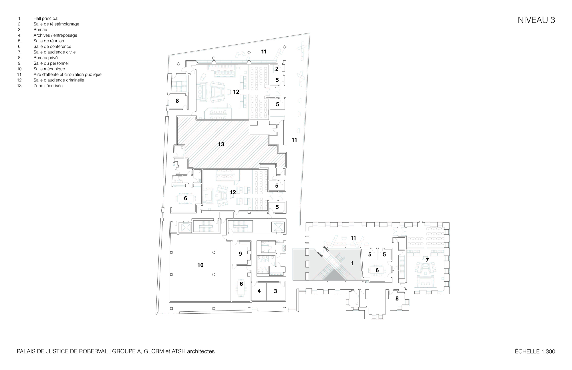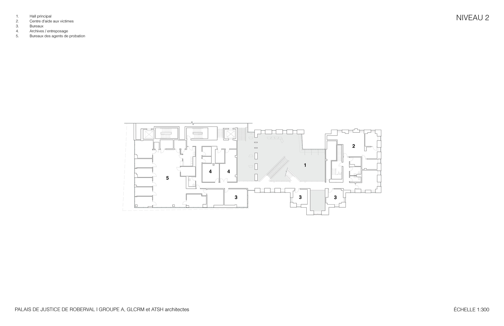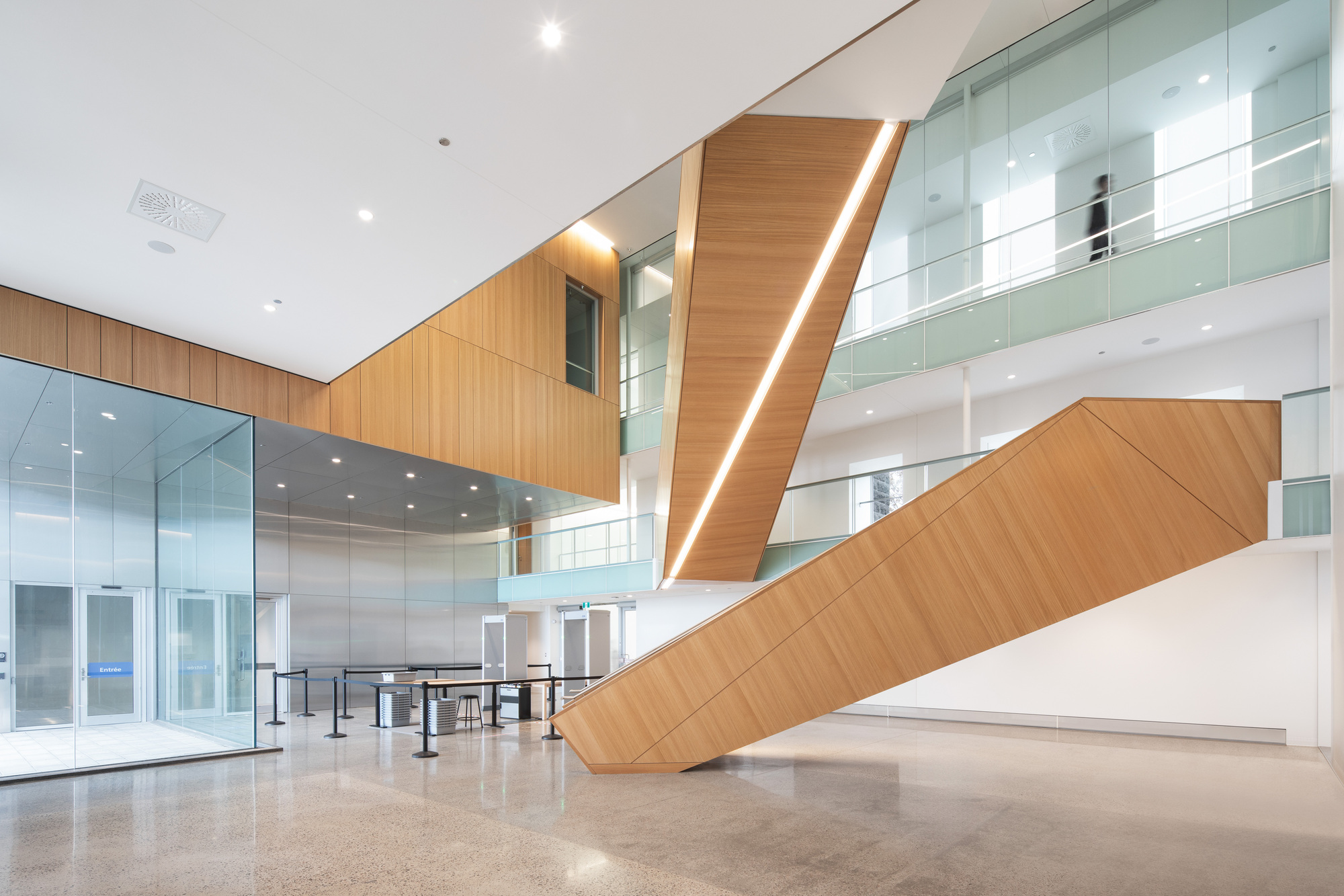 整個建築群的空間核心,是一個挑高三層樓、氣勢恢宏的主大廳。這個大廳精準地對齊了歷史建築中央山牆上的角樓,在都市尺度上,它完美地延伸了羅伯瓦街(Roberval Street)的歷史軸線。