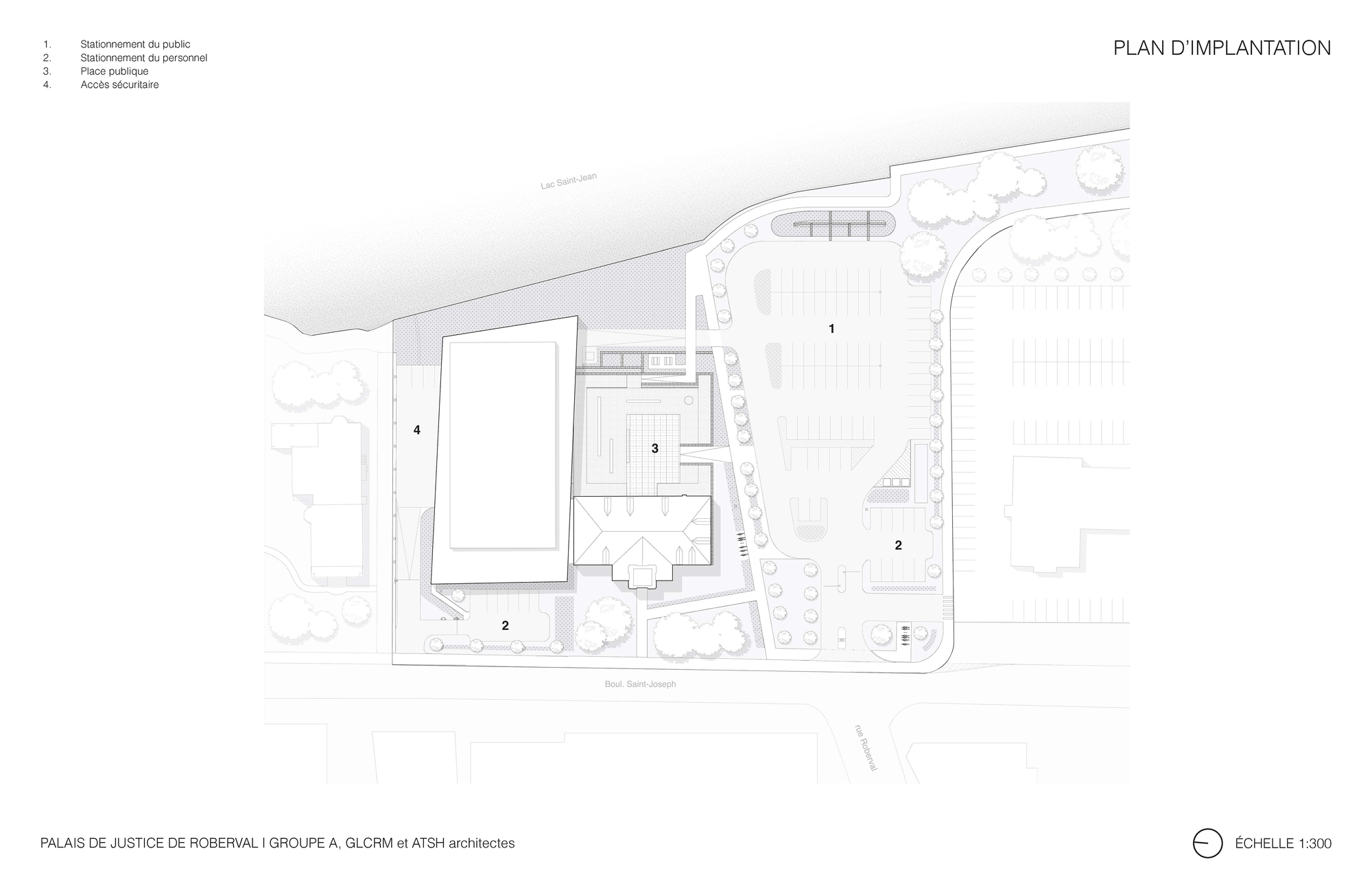 座落於加拿大魁北克省(Quebec)的羅伯瓦法院(Roberval Courthouse),佔據了一個極為獨特的地理位置。它不僅位處歷史悠久的市中心心臟地帶,更是銜接當地傳統都市紋理與壯麗的聖讓湖(Lac Saint-Jean)水岸景觀的重要節點。