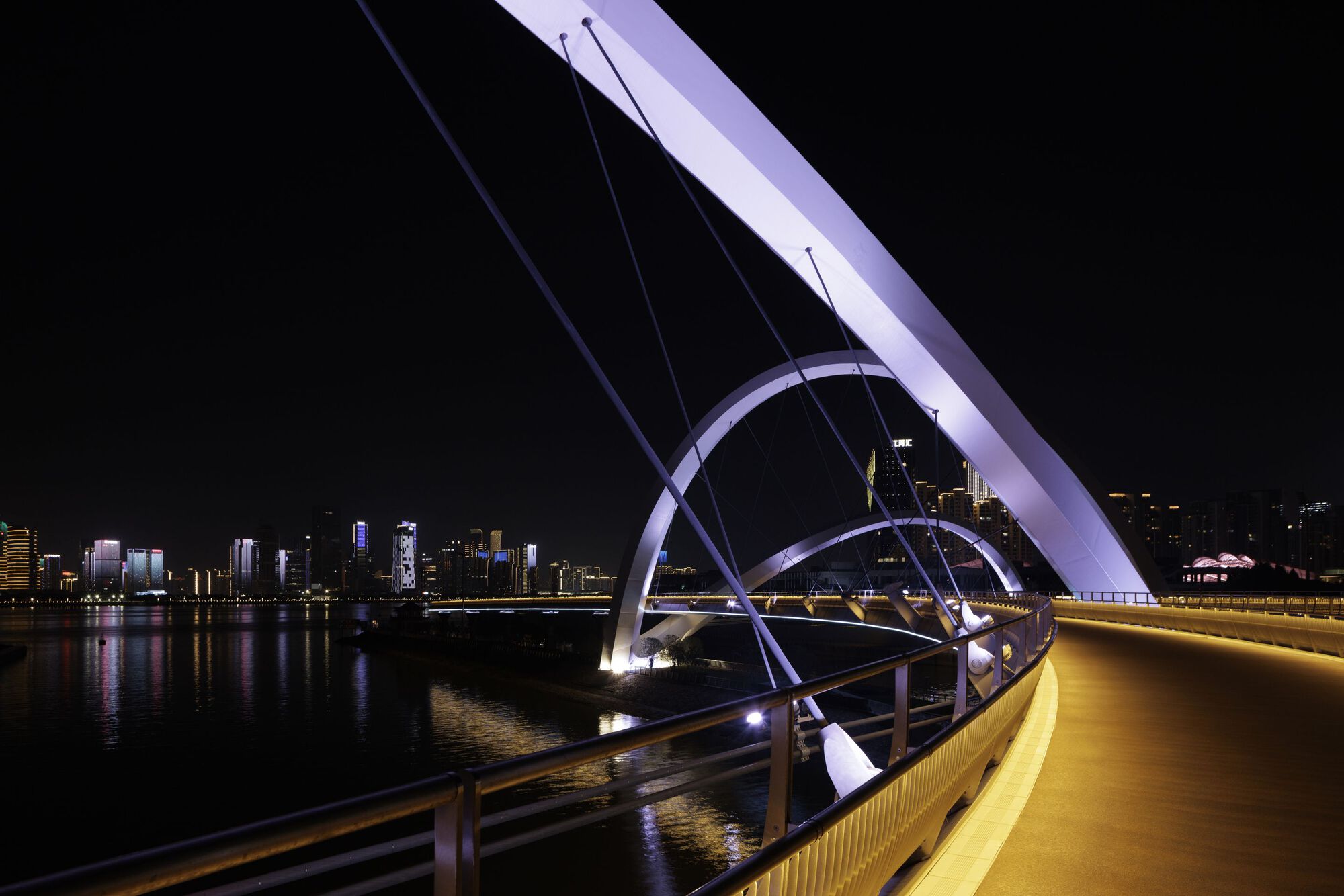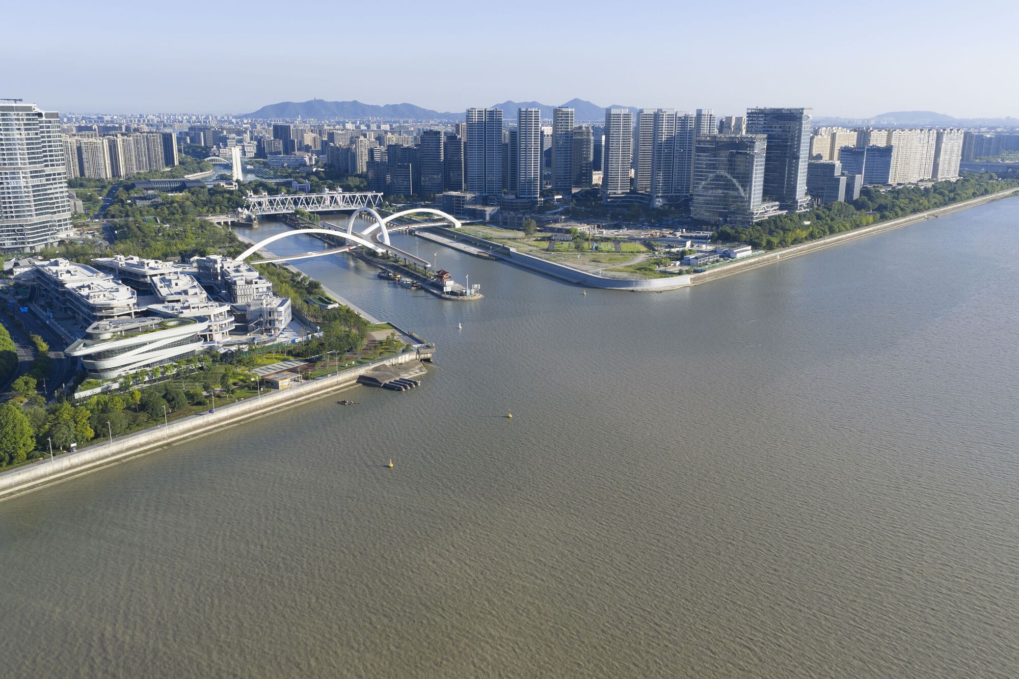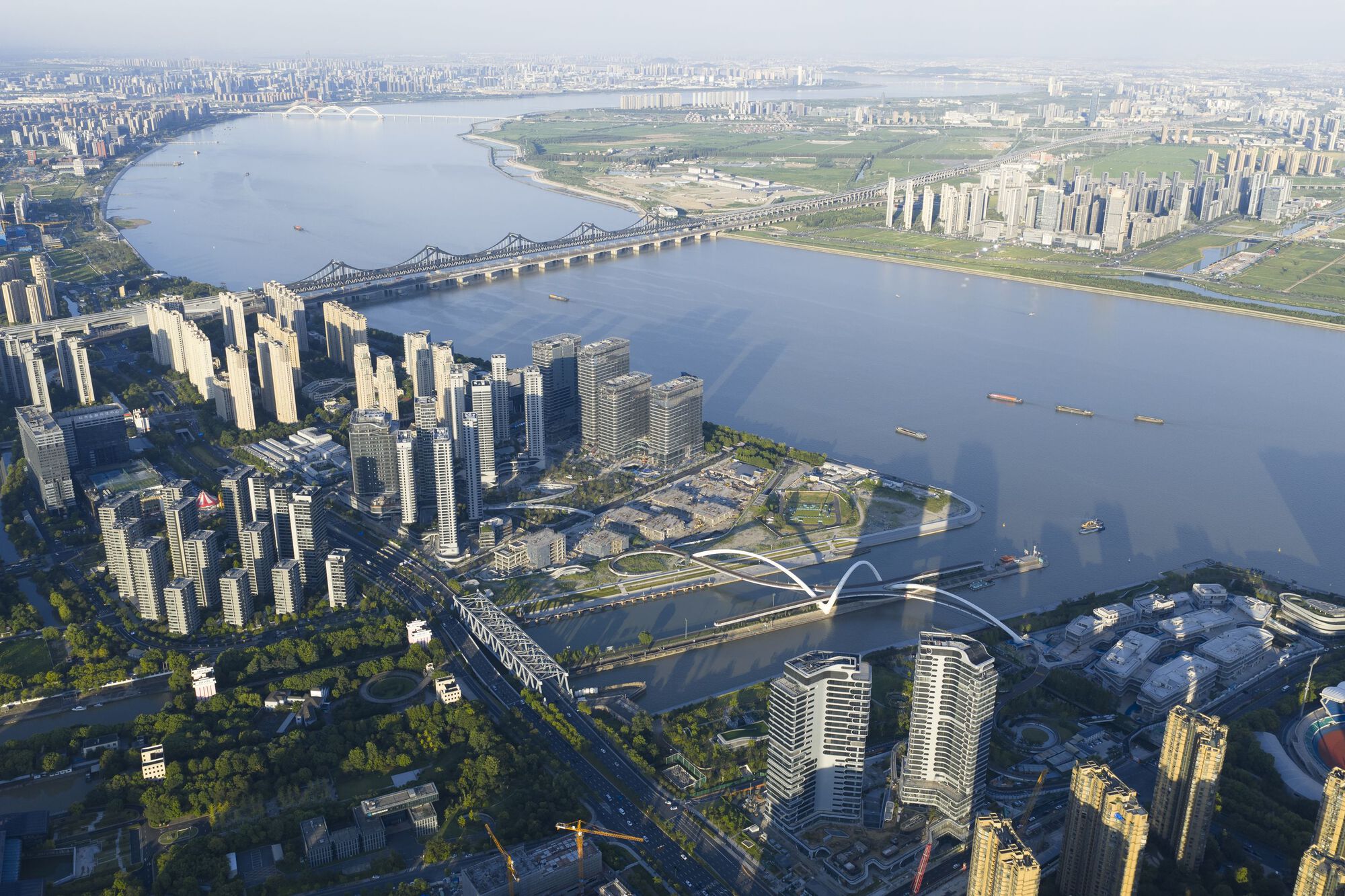 人行步橋長三九○米,將大運河兩岸、佔地八十萬平方公尺的「無縫城市」總體規劃區緊密連接起來。透過將住宅、辦公、休憩、文化等多元功能有機串連,Zaha Hadid ArchitectsZHA)的設計,旨在將杭州與這條歷史性的大運河及錢塘江環環相扣。