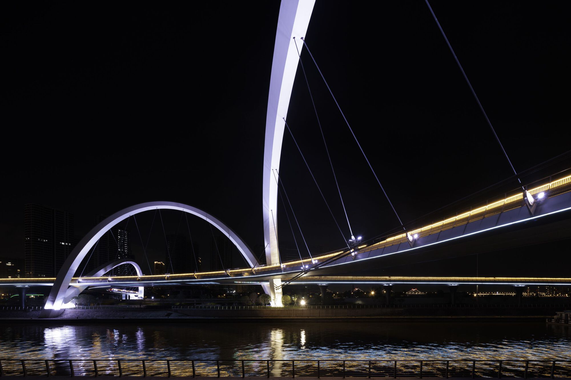 大運河門戶在結構工程學上是精確計算的典範。長採用鋼結構的系杆三拱系統,通過先進的三維數位建模進行優化,以最大限度地減少材料用量。選擇鋼材正是看中高強度重量比的優勢,使得橋梁比同類混凝土結構顯著輕盈,大幅提升了製造與現場吊裝的效率。結構設計將所有荷載,包括面產生的扭矩,統合併平衡地傳遞至支座,確保整體穩定。輕量化設計,不僅達成了雕塑般的外觀,也體現了對資源優化利用的當代思維。
