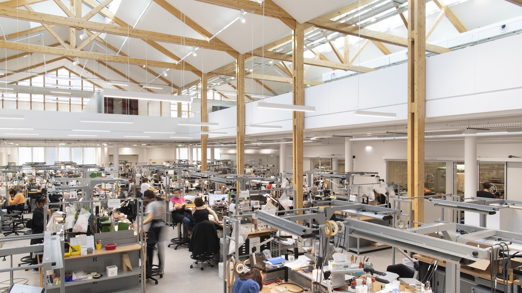 訓練中心底層容納70名皮革學徒,新手靠街面工作,熟手則位於後側,形成循序漸進的學習路徑。噪音與氣味較大的作業,如打磨與黏合,集中在閣樓下的封閉工作間,確保環境寧靜。學徒每日操作仰賴精準的時間管理,自動玻璃門的設置大幅提升移動效率,展現工業工程的科學精神。