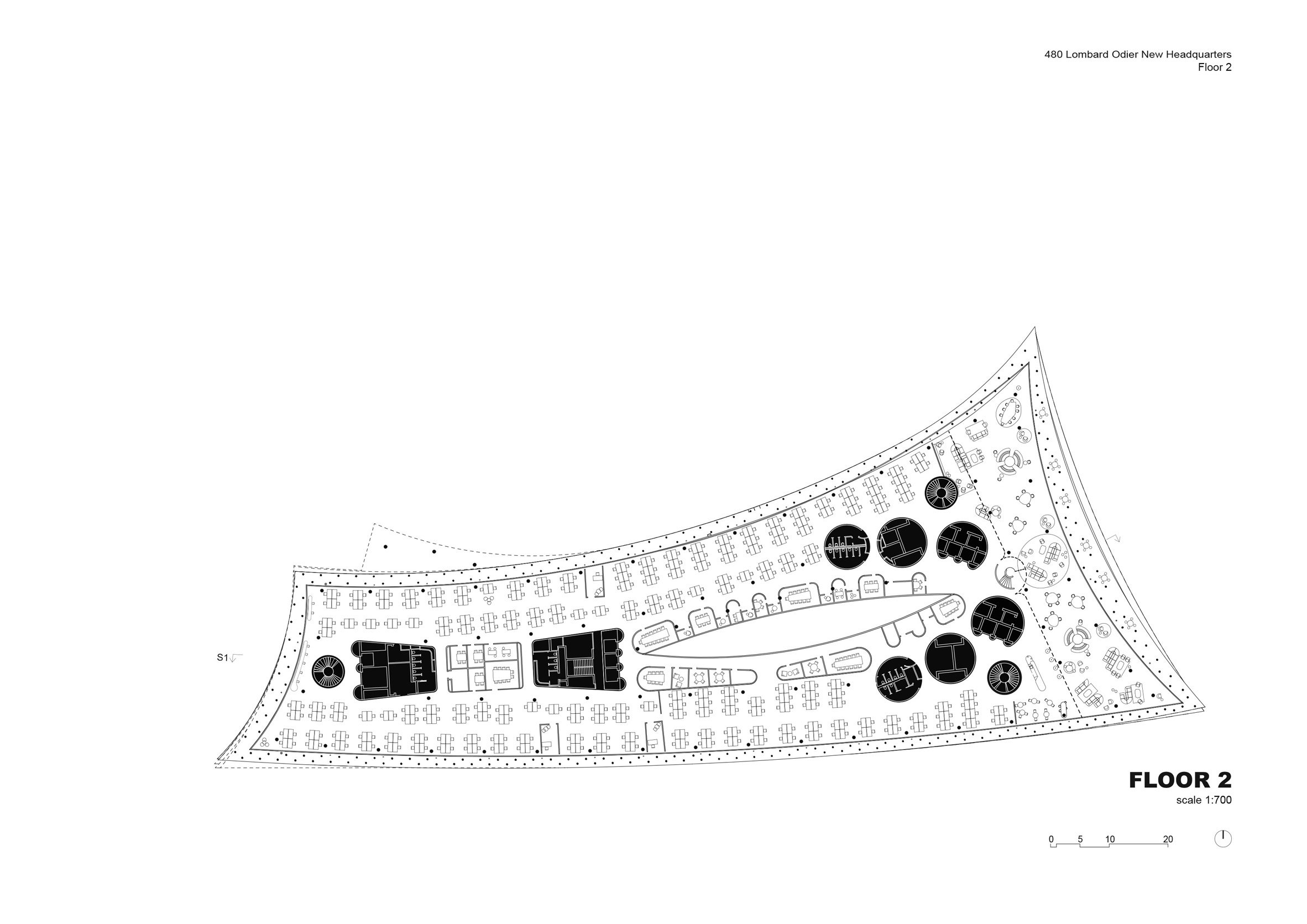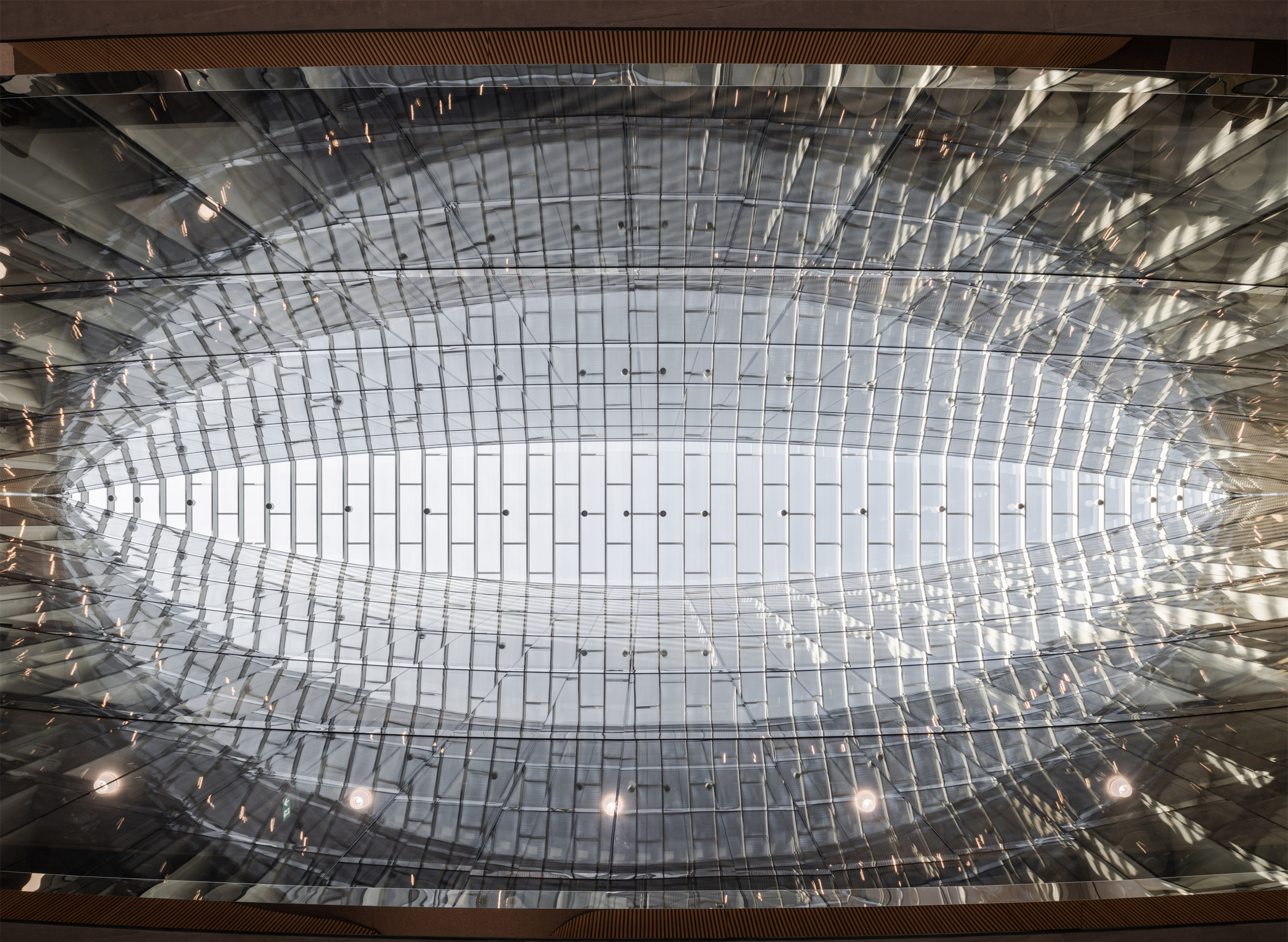 為了將先前散落在日內瓦六處地點工作的兩千名Lombard Odier員工凝聚起來,促進交流與協作,建築的內部空間規劃可謂煞費苦心。設計師在建築的幾何中心,挖鑿出一座狀如葉片、又似杏仁的巨大天井,從屋頂的玻璃天窗引導著自然光線,如瀑布般傾瀉而下,灑遍建築的每個角落。圍繞著這座光之峽谷,佈置了許多會議室與交流區,一座雕塑般的混凝土樓梯蜿蜒而上,串聯起垂直的動線,使中庭成為名副其實的協作與社交心臟地帶。