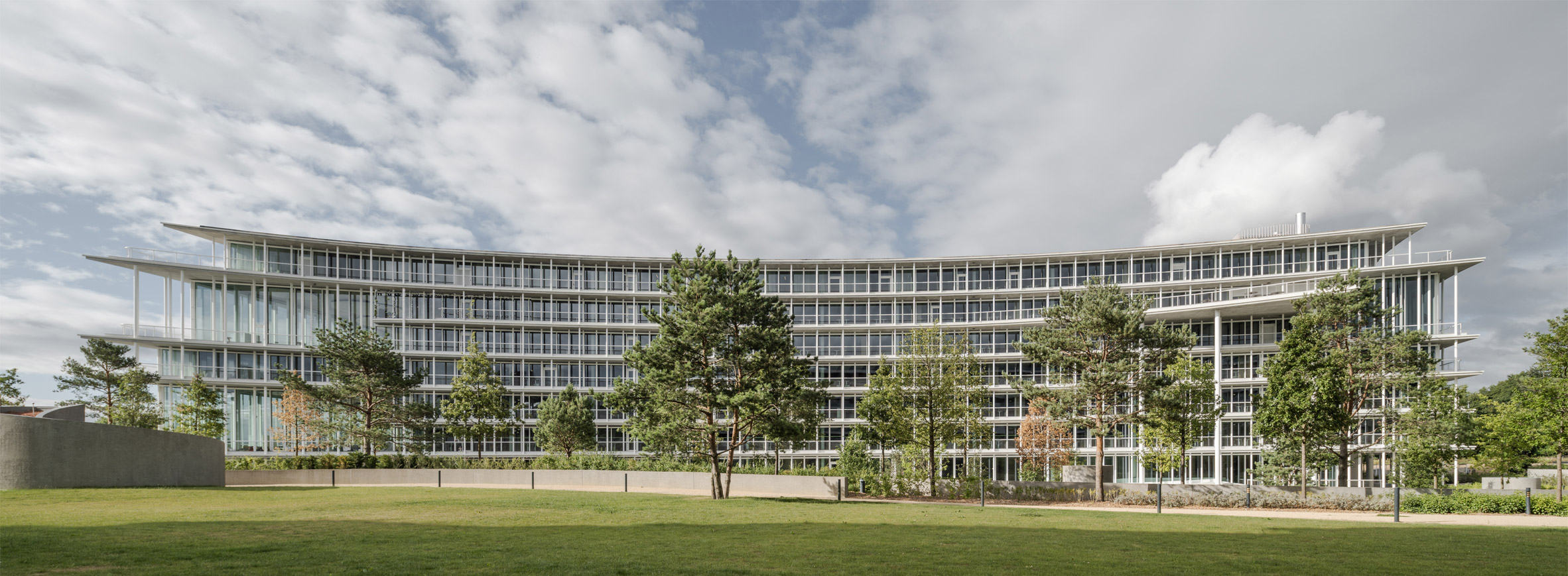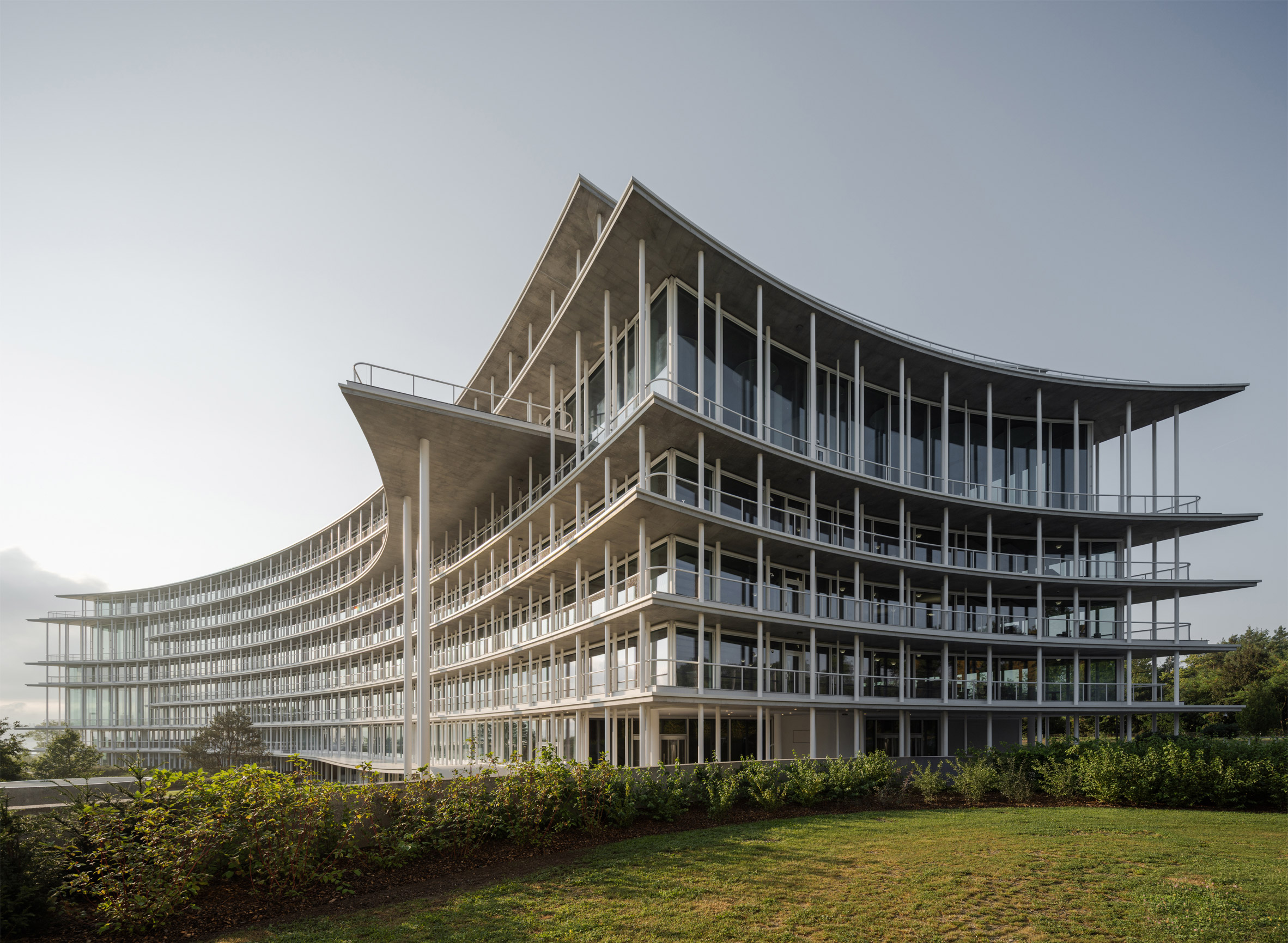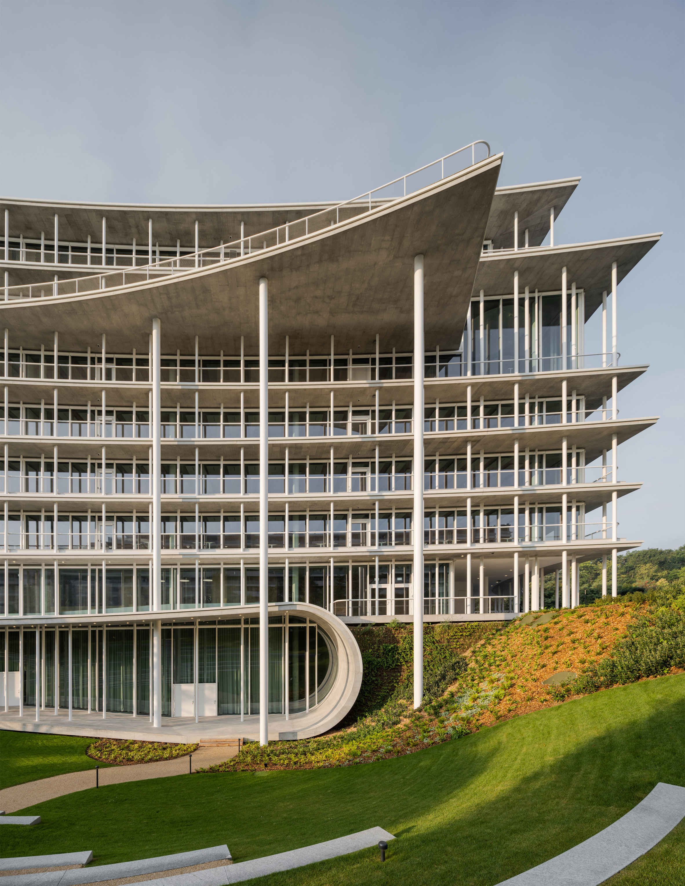 建築立面的處理手法,真可說是匠心獨運。一片片弧形的混凝土樓板,從玻璃帷幕向外優雅地懸挑而出,形成環繞整棟建築的深邃簷篷與戶外露台,既能為室內空間遮擋過盛的日照,亦創造出豐富的光影層次。支撐這些樓板的,是無數漆成白色的纖細鋼柱,巧妙地與雨水管、捲簾導軌等垂直構件融為一體,弱化了結構本身的重量感。合夥人雅克.赫佐格(Jacques Herzog)將這種輕薄、層疊的樣貌,生動地比喻為法式甜點「千層派」(mille-feuille)。