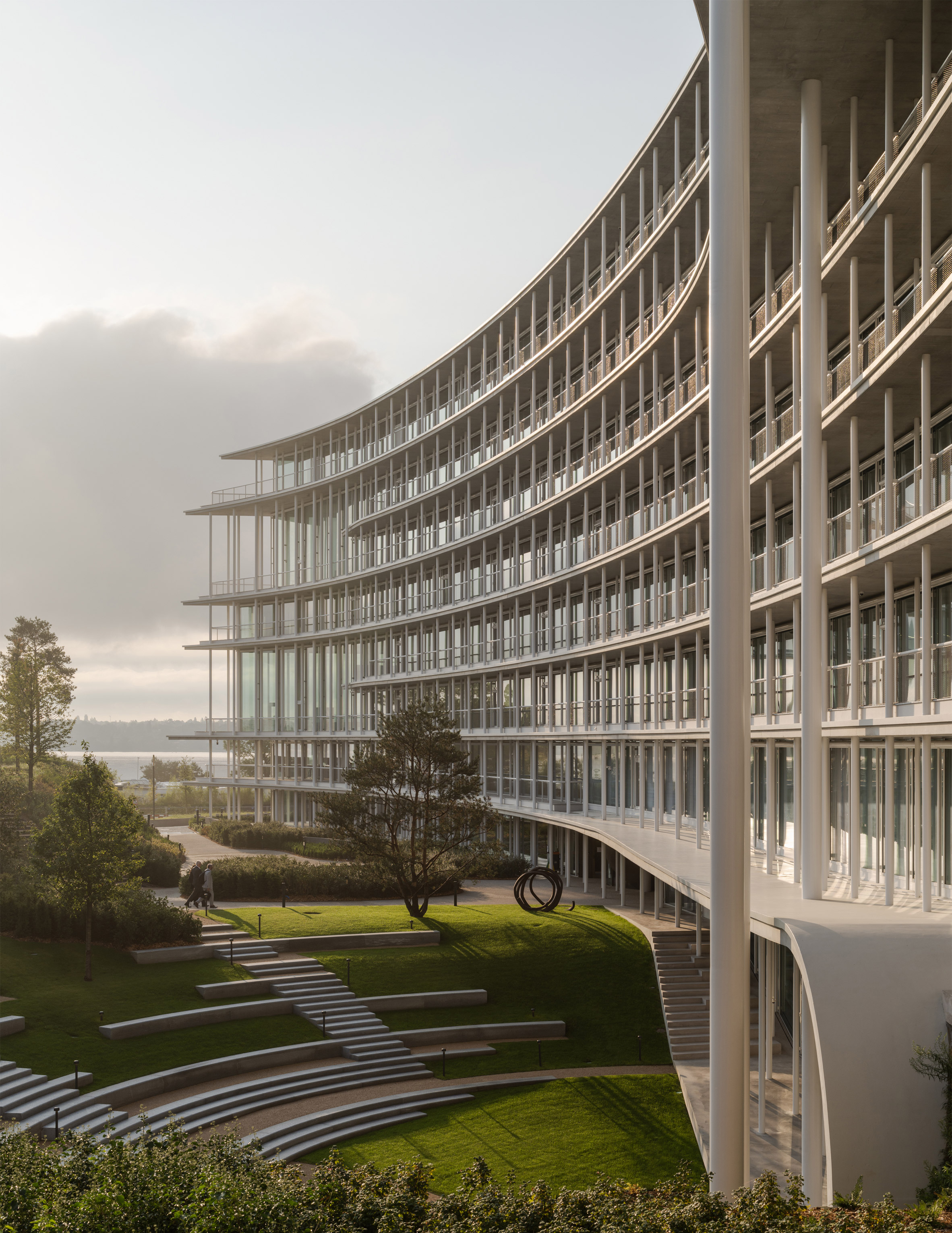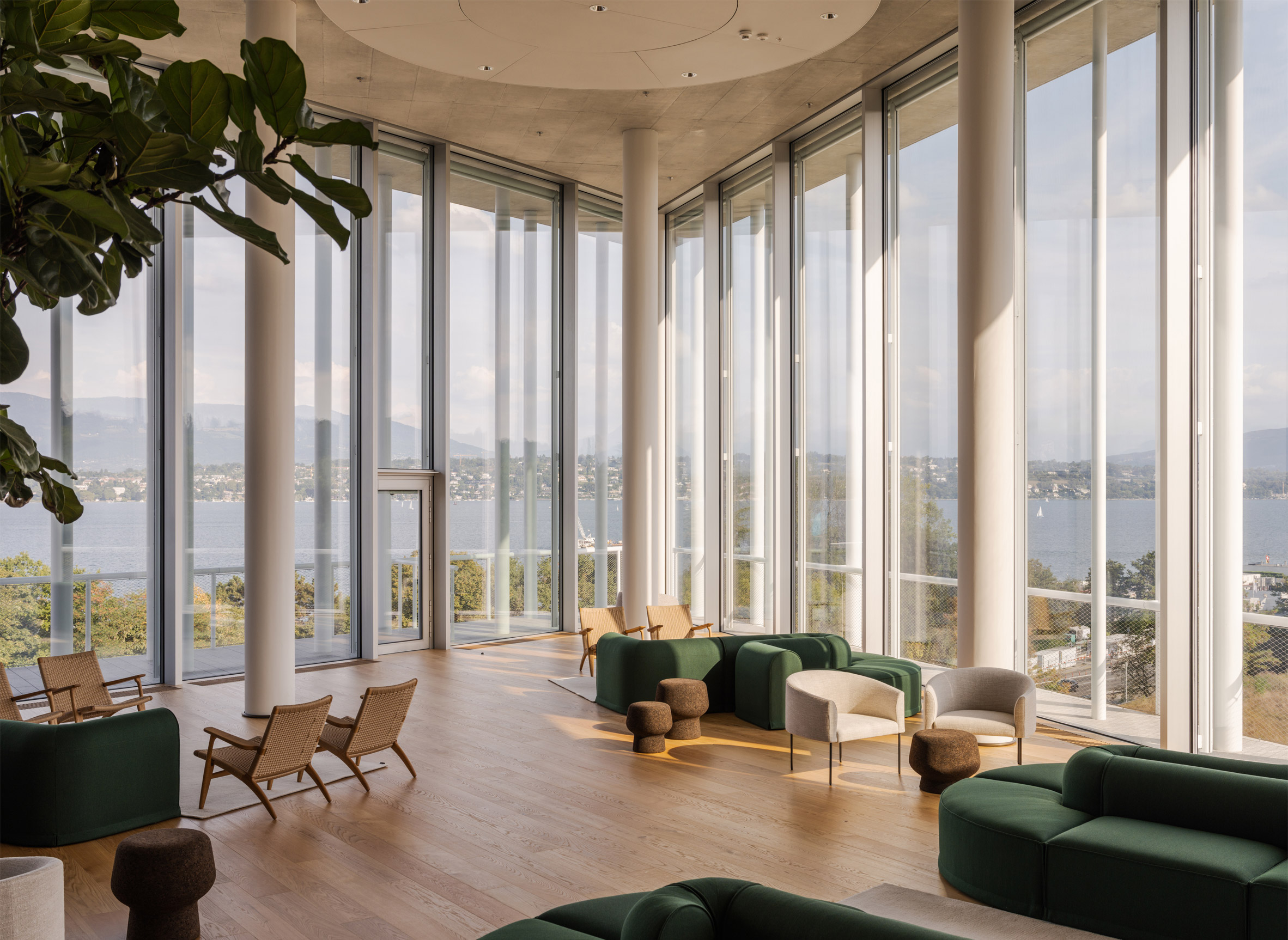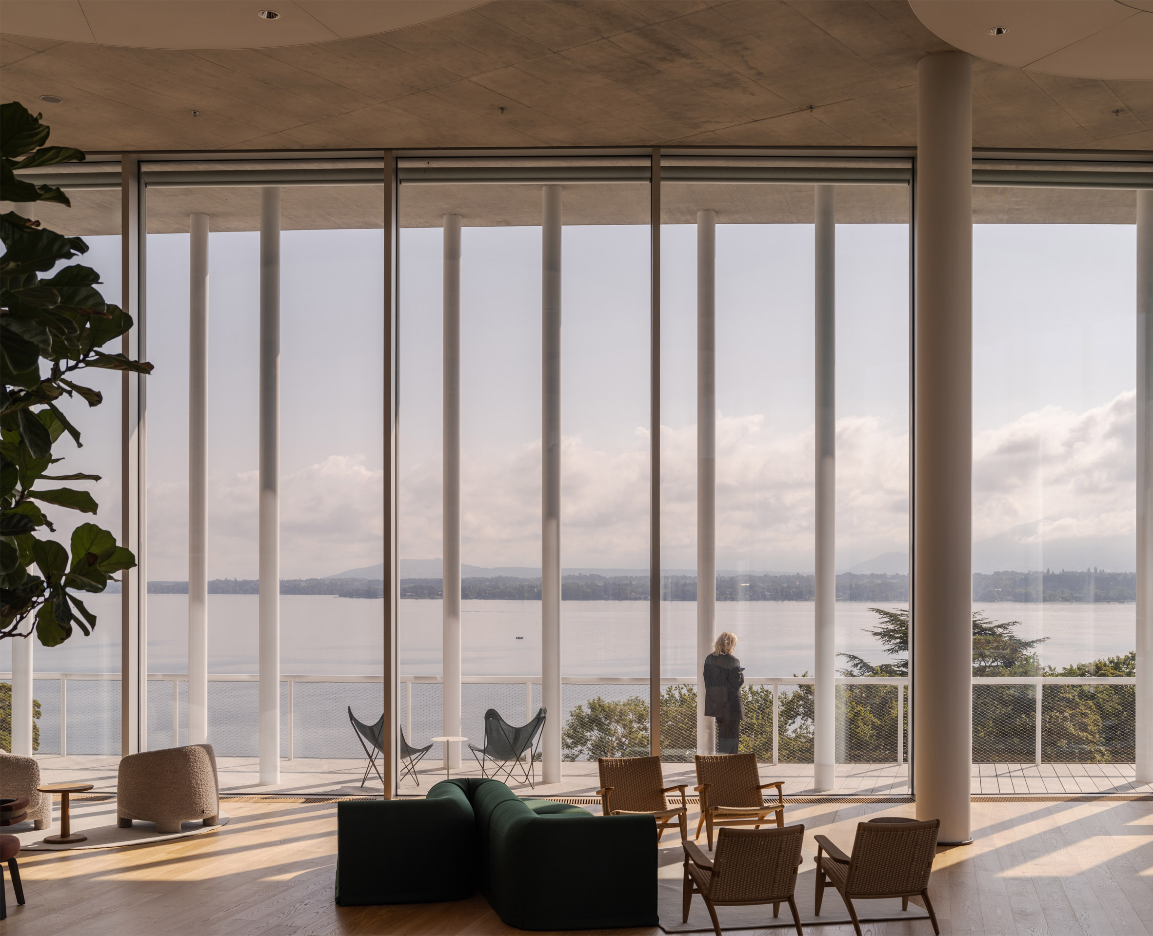 建築師以大面積的曲面玻璃帷幕,搭配林立的纖細圓柱,勾勒出輕盈通透的輪廓。設計破釜沉舟,意圖挑戰世人對於銀行建築固若金湯的傳統印象,讓整座辦公大樓宛如一座水晶宮殿,將日內瓦湖(Lake Geneva)的潋灩水光與遠方山巒的壯闊景色,盡數映入眼簾。