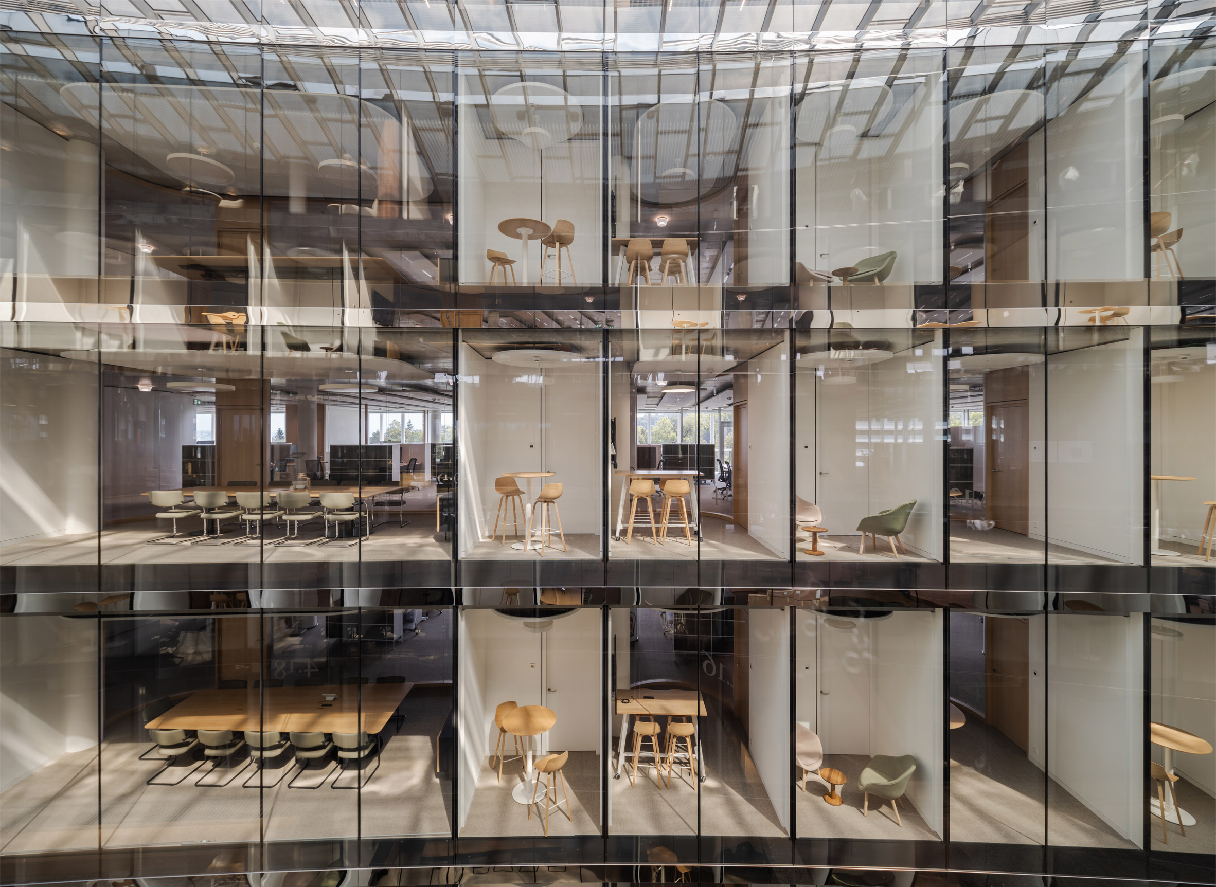 在「One Roof」的內部,幾乎找不到僵硬的直線或壓迫性的長廊。設計師大量運用弧形牆面,創造出流動、柔和的空間感受,引導著人們在其中穿梭移動,並對下一個轉角後的風景充滿好奇。整座總部被劃分為不同私密性與正式程度的區域,混合了開放式辦公區、大小不一的會議室、休憩艙,以及許多讓休閒與協作共存的複合機能空間。其中,位於二樓和五樓的雙層挑高交誼廳,擁有俯瞰湖光山色的全景視野,更是讓人流連忘返。