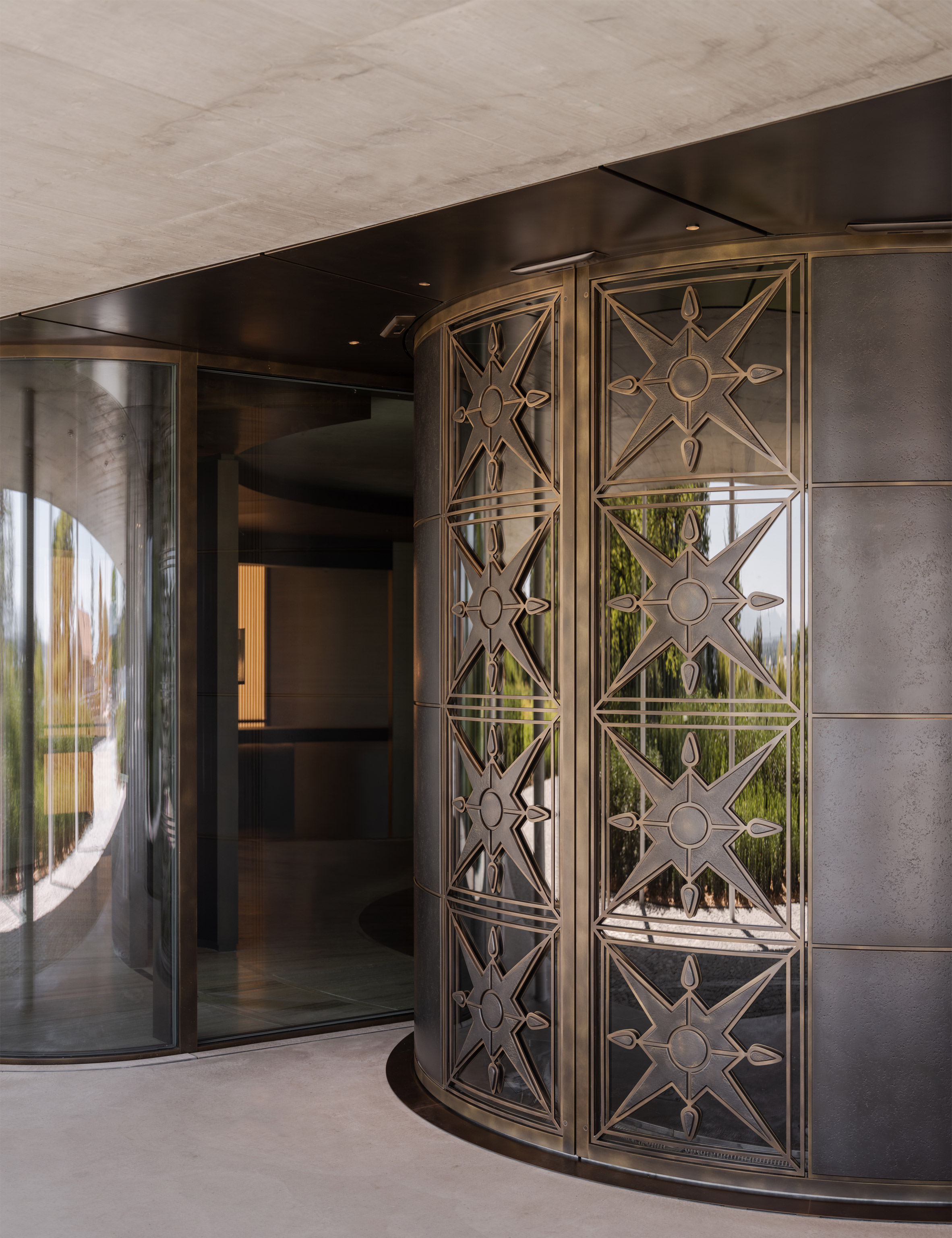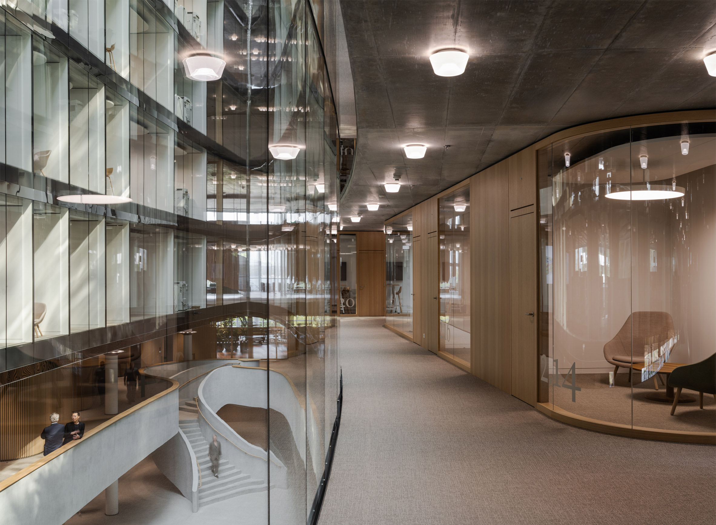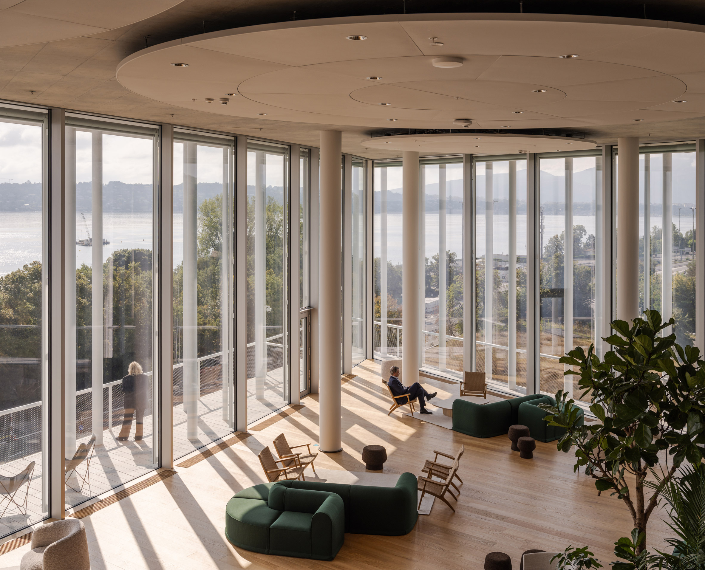 考量到私人銀行業務的特殊性,建築中有一部分區域是專為Lombard Odier的客戶所規劃。訪客可由面向湖畔的專屬入口進入,通往上層的接待「沙龍」。這些空間的室內設計,特別委託法國設計師魯道夫.帕倫特(Rodolphe Parente)操刀。帕倫特採用了更為深沉、馥郁的色調與材質,搭配居家風格的精緻家具,營造出兼具奢華感與高度私密性的氛圍,確保銀行能為頂級客戶提供最周到且具安全感的洽談環境,與開放的員工區形成巧妙對比。