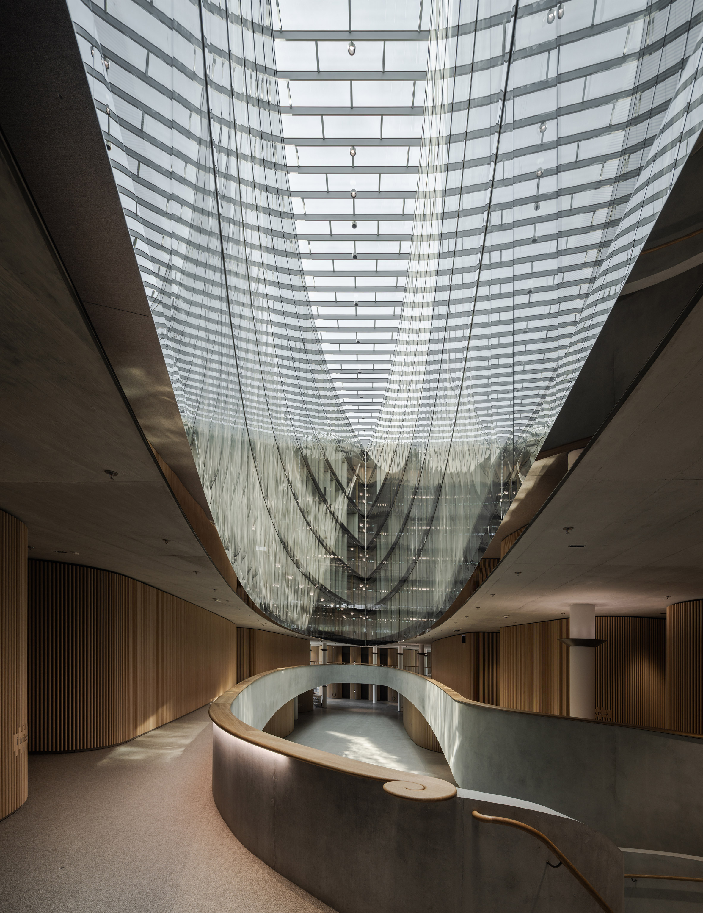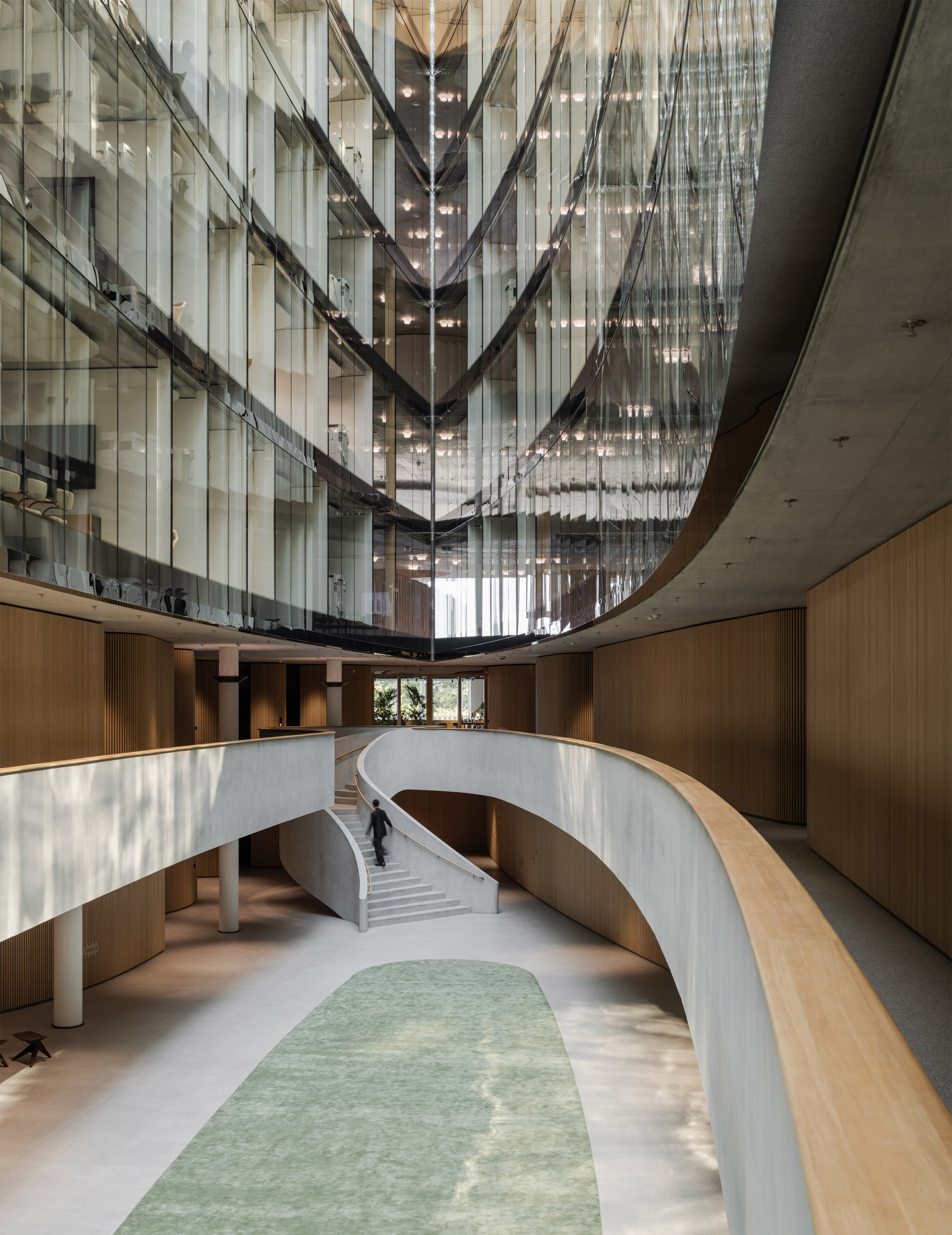 她認為,需要被嚴密保護的是金庫裡的資產,而非在此工作的專業人才。基於這個核心理念,設計團隊致力於打破內外界線,除了追求由內而外的視覺穿透性,更極力將周遭地景的感知體驗最大化。這種哲學,是對傳統金融業隱密、內向文化的一次溫柔反叛,轉而擁抱開放、自信與以人為本的嶄新價值。