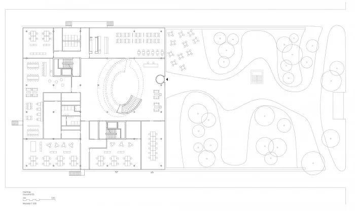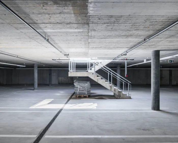 停車庫的外牆設有開口,提供自然的空氣循環,而不必安裝昂貴的空氣通風系統。這些節省的資金就可以投資於改善工作空間的品質。建築物沿高速公路的北側周邊的定位為朝南的公園騰出了開放空間。這個寬闊的景觀對員工和訪客都是開放的,並在這個工業區的無名之地提供了一個安靜的休息場所。同時,它也是公司的一個建築街廓儲備,如果他們在未來的任何時候需要擴大。