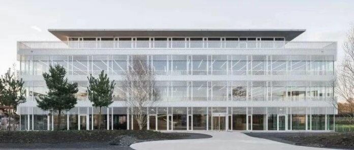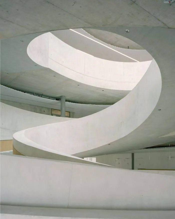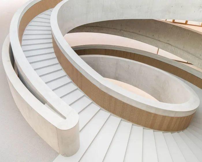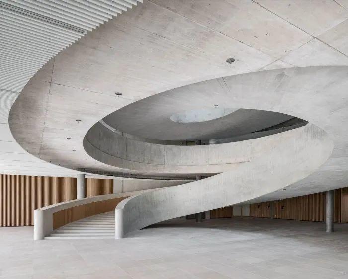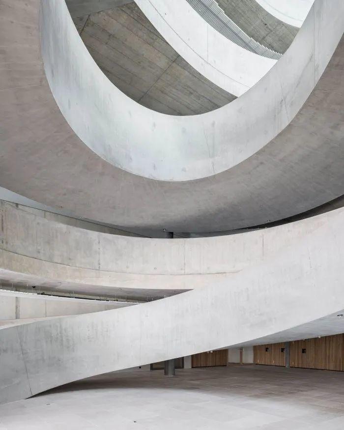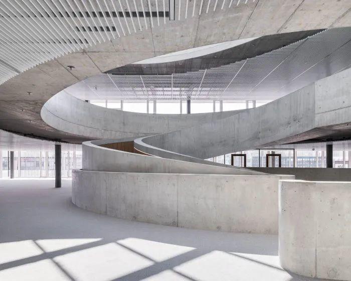 瑞士建築事務所HILDEBRAND於斯坦豪森工業區,為Hapimag規劃嶄新企業總部,企圖在無名地景中建立強烈識別。核心亮點為巨大的橢圓形混凝土坡道與採光中庭,打破傳統階級並促進員工跨層交流。該案強調靈活適應未來辦公需求,導入楚格湖水源熱泵系統實現無排放溫控,並將停車場自然通風省下的成本轉投於優化工作環境。南側留設寬闊綠地公園,不僅提供休憩場域,更預留未來擴充彈性,確立永續與人性並重的企業典範。