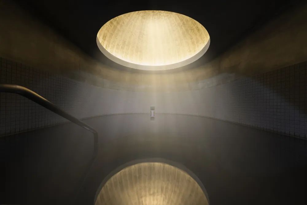 由於看不到風景,當地人的“〇湯”被設計成地下溫泉的洞穴樣式。天窗沒有玻璃,當雨雪落在室內時,暖空氣自然排出。溫泉是一種含有植物中提取的有機物的黑色沼地溫泉,可以將天窗的光線清晰地反射在水面上。這鼓勵人們本能地向上提高視線,以尋找光源。